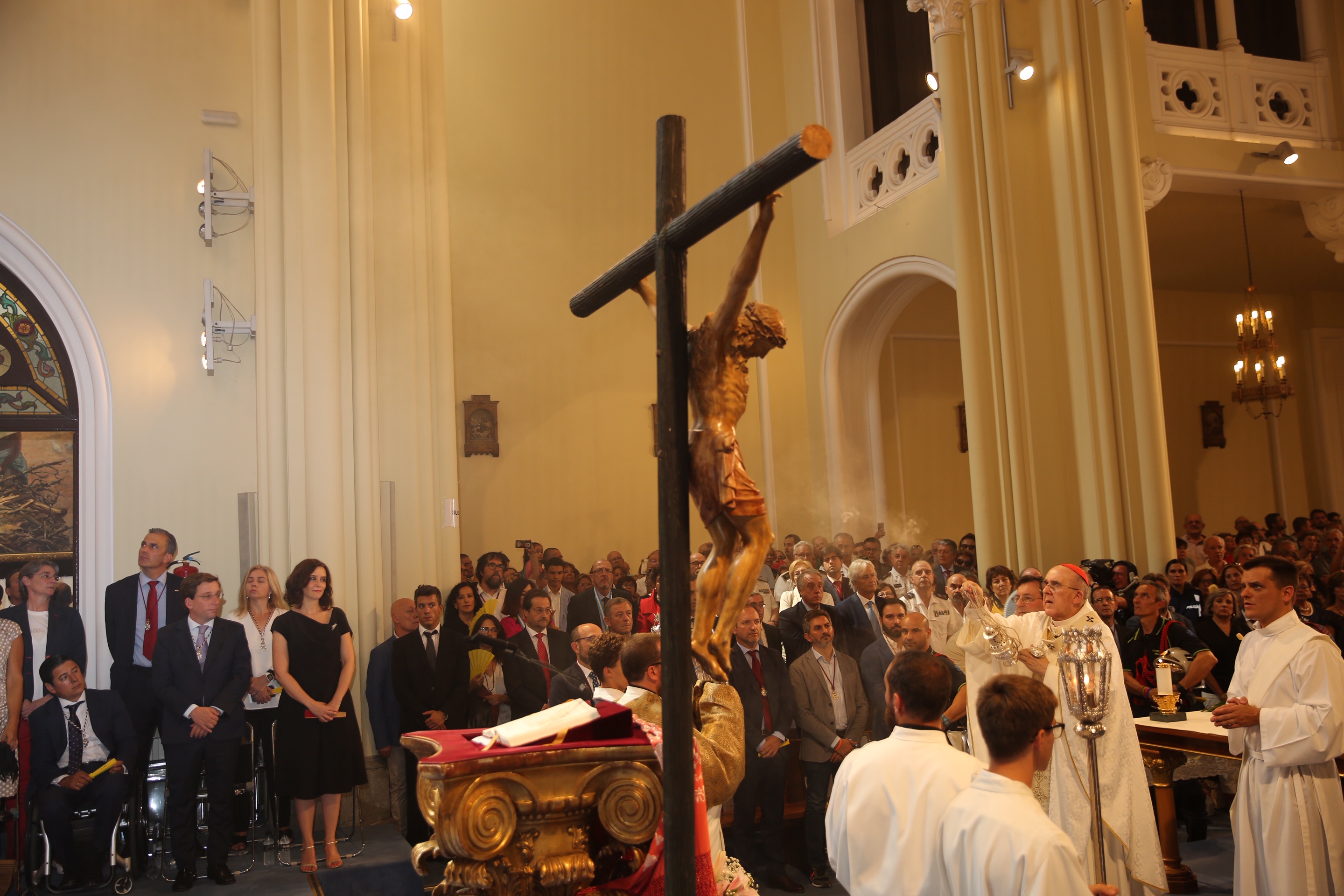 Una vez finalizada la Misa, ha tenido lugar uno de los momentos más esperados de la jornada: el descenso del cuadro de la Virgen de la Paloma, que está ubicado en el Altar Mayor. El encargado, en esta ocasión, ha sido el bombero Felipe García Berzosa, presidente de la Hermandad, que ha estado acompañado por miembros del piquete de gala del Cuerpo de Bomberos.
