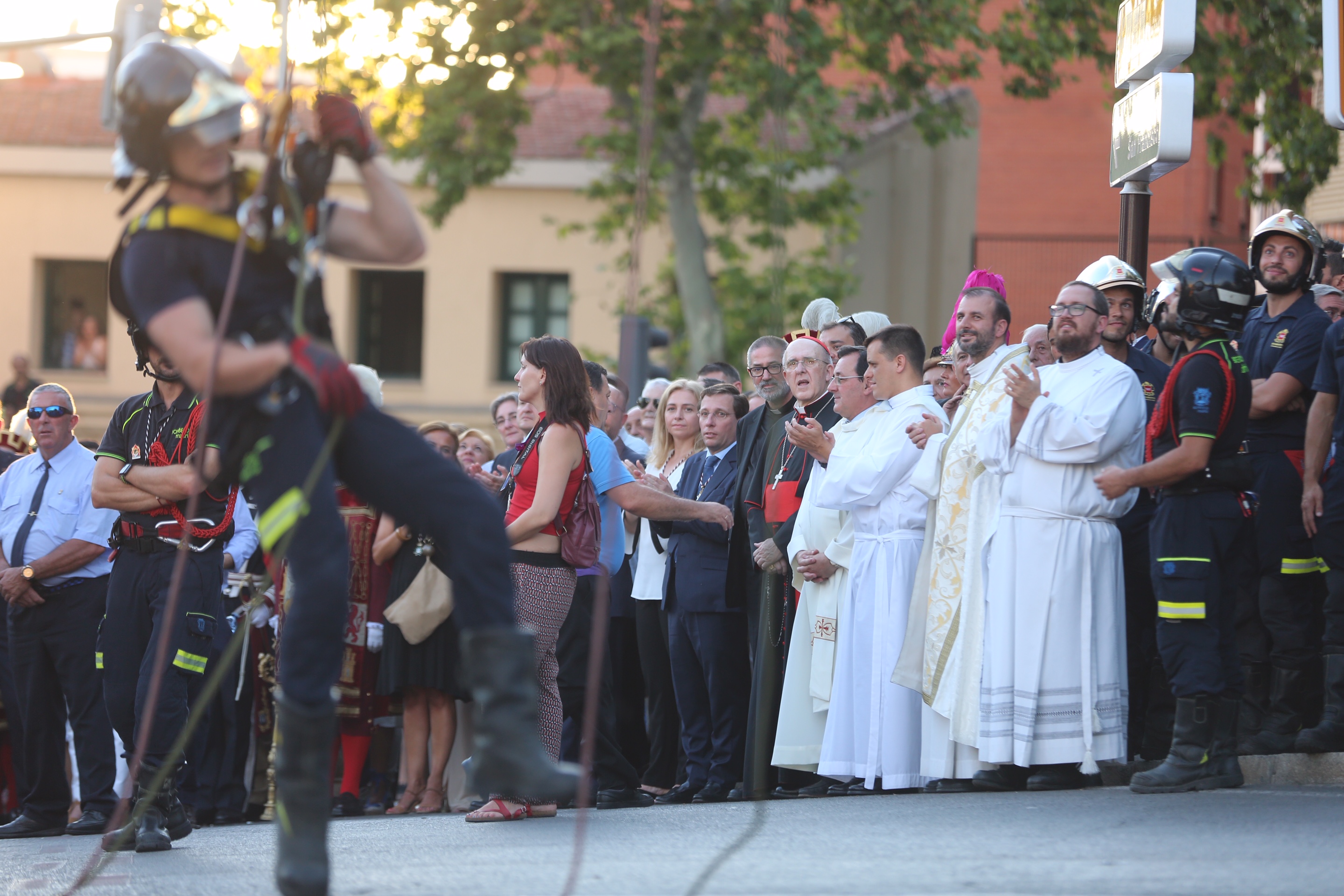 - El bombero Felipe García Berzosa, acompañado por un piquete de gala, ha sido el encargado de descender el cuadro de la Virgen