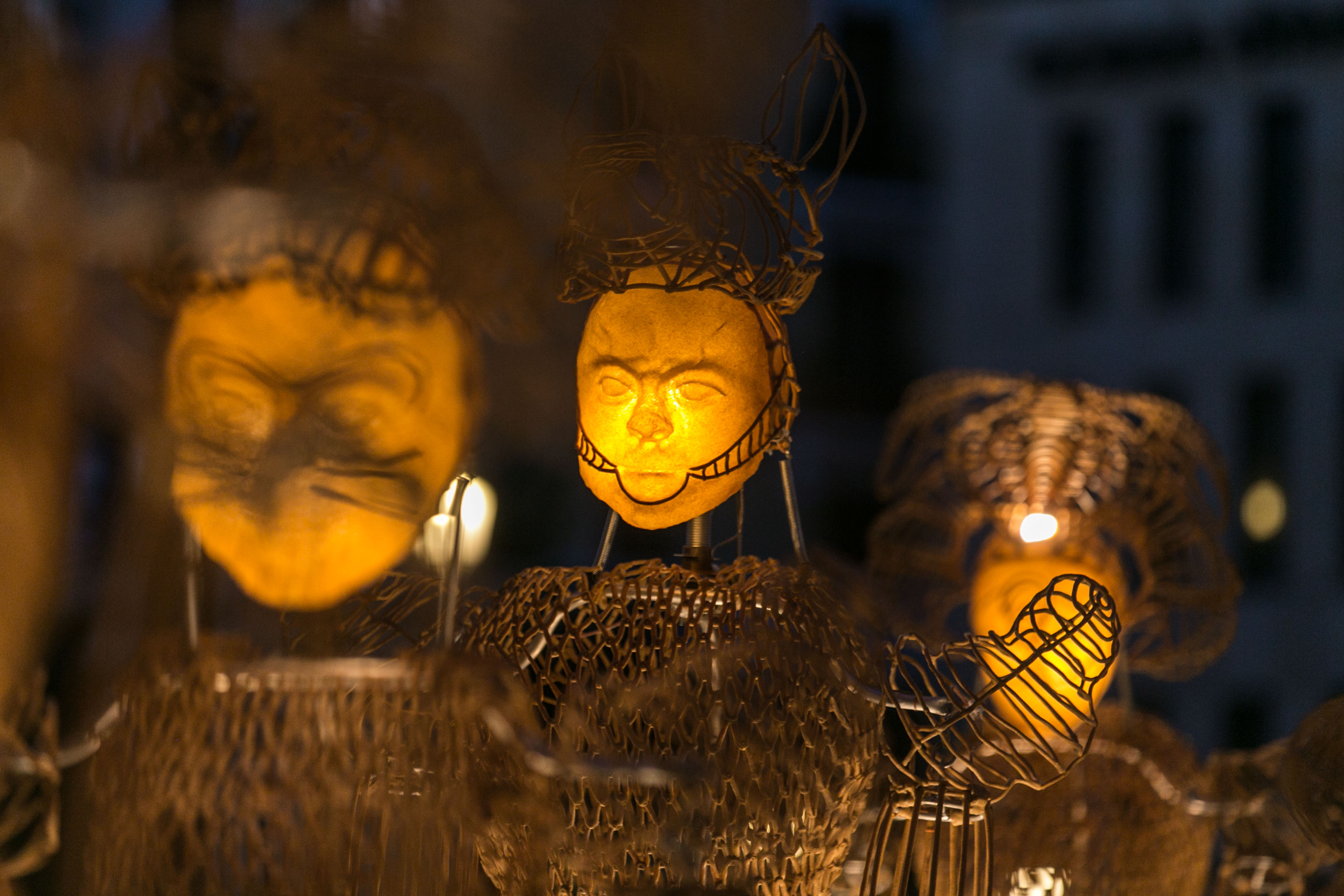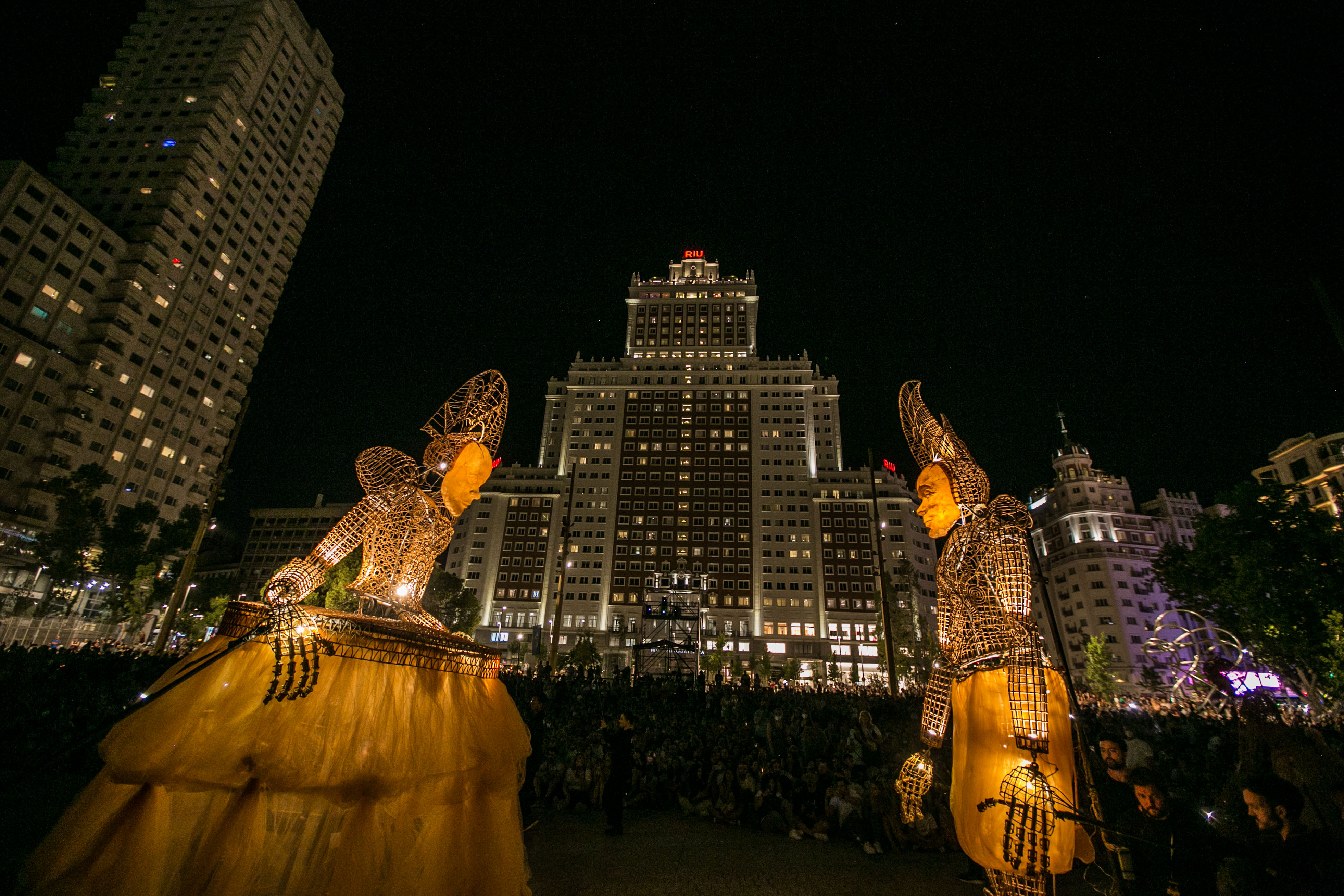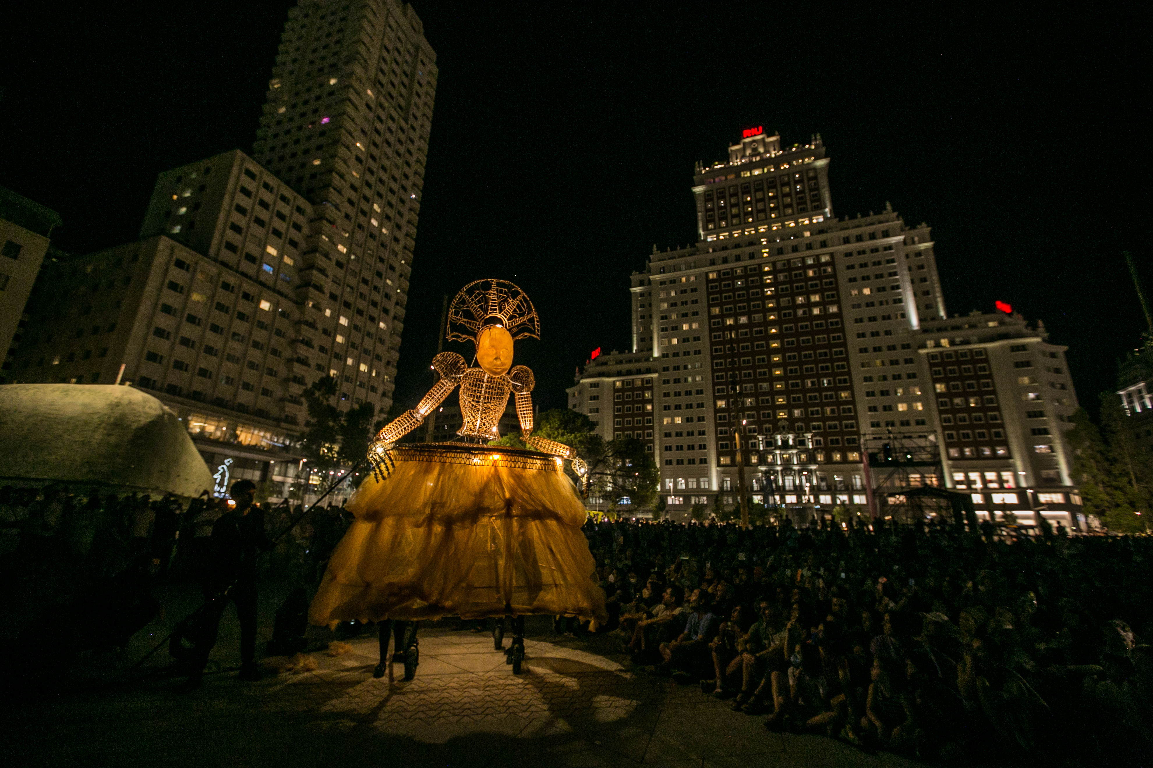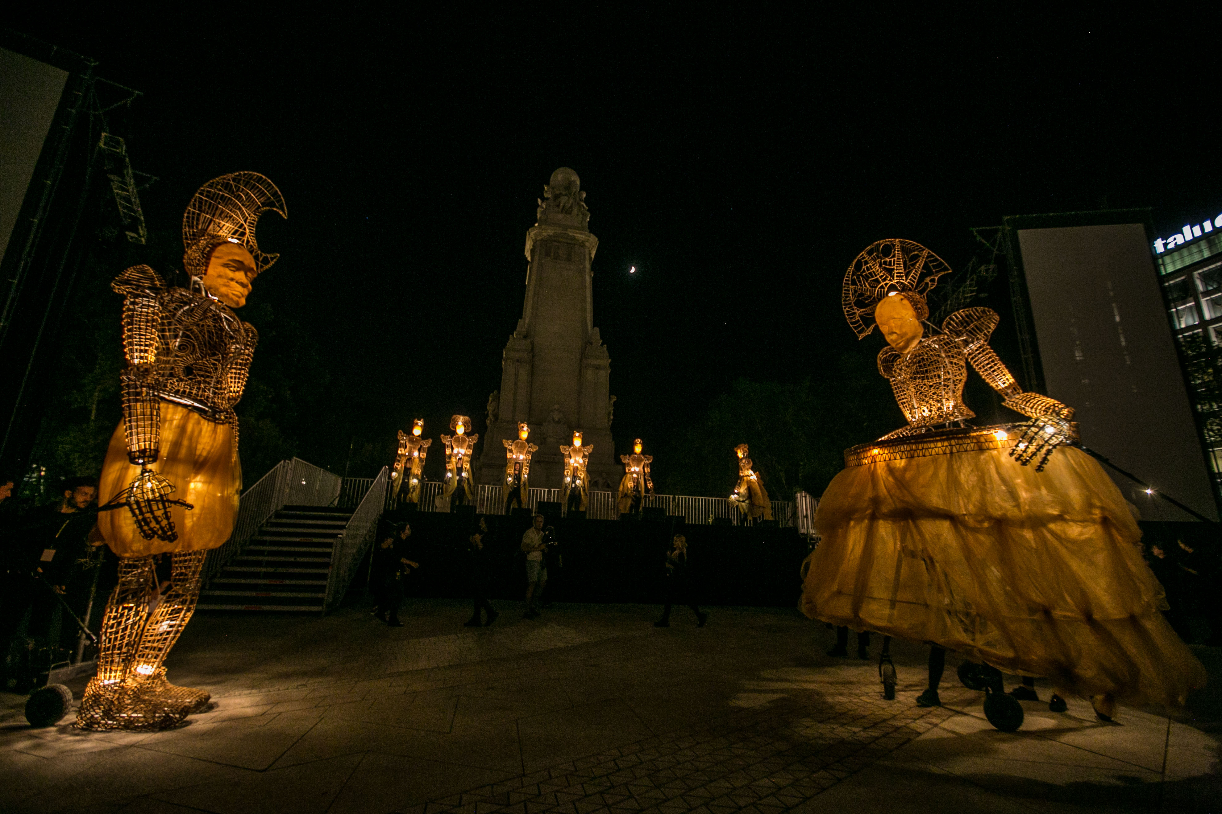 - Ocho muñecos articulados desfilaron desde la plaza de Isabel II hasta la renovada Plaza de España, donde les esperaban dos marionetas lumínicas de 5 metros para ejecutar un baile lleno de luz y poesía