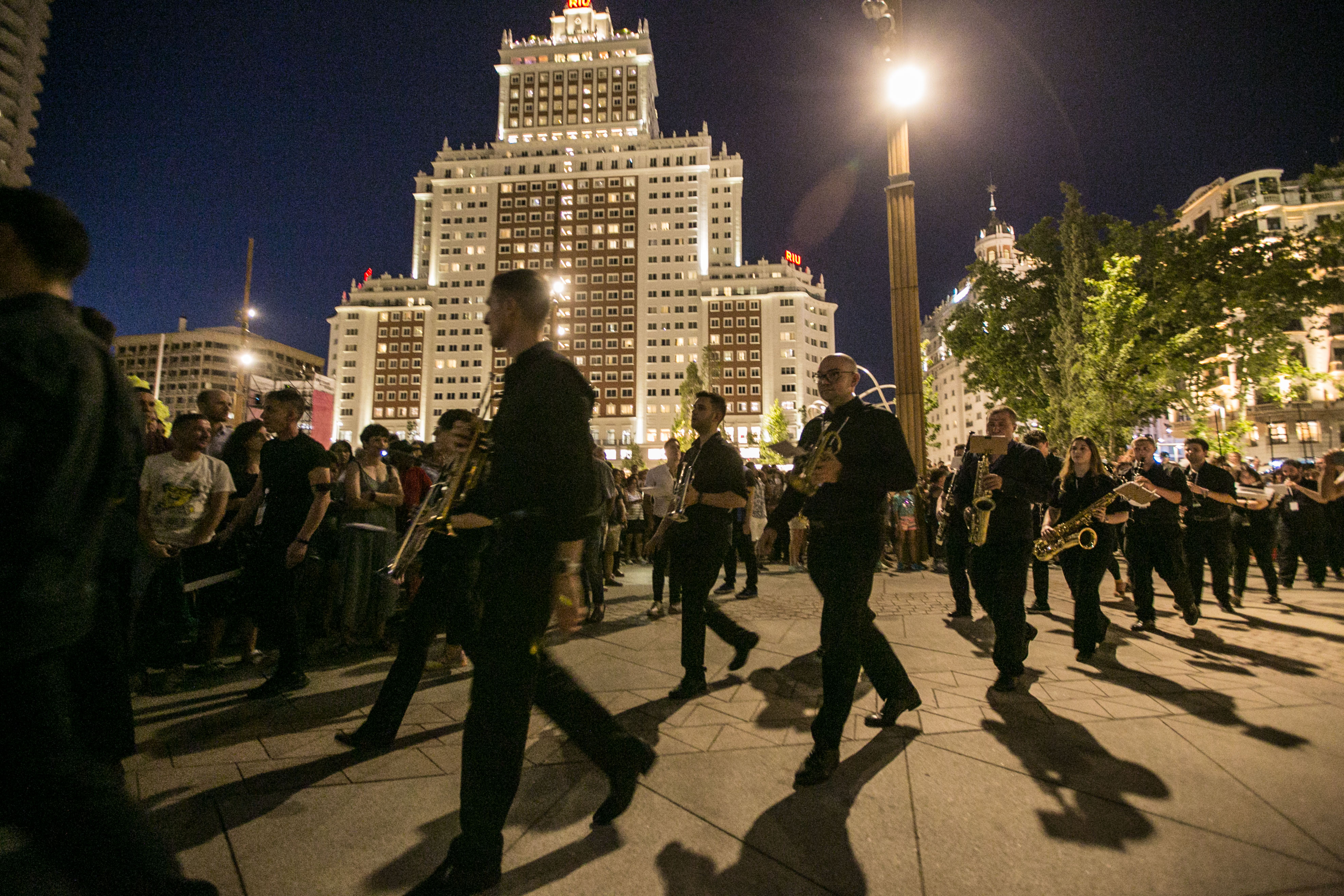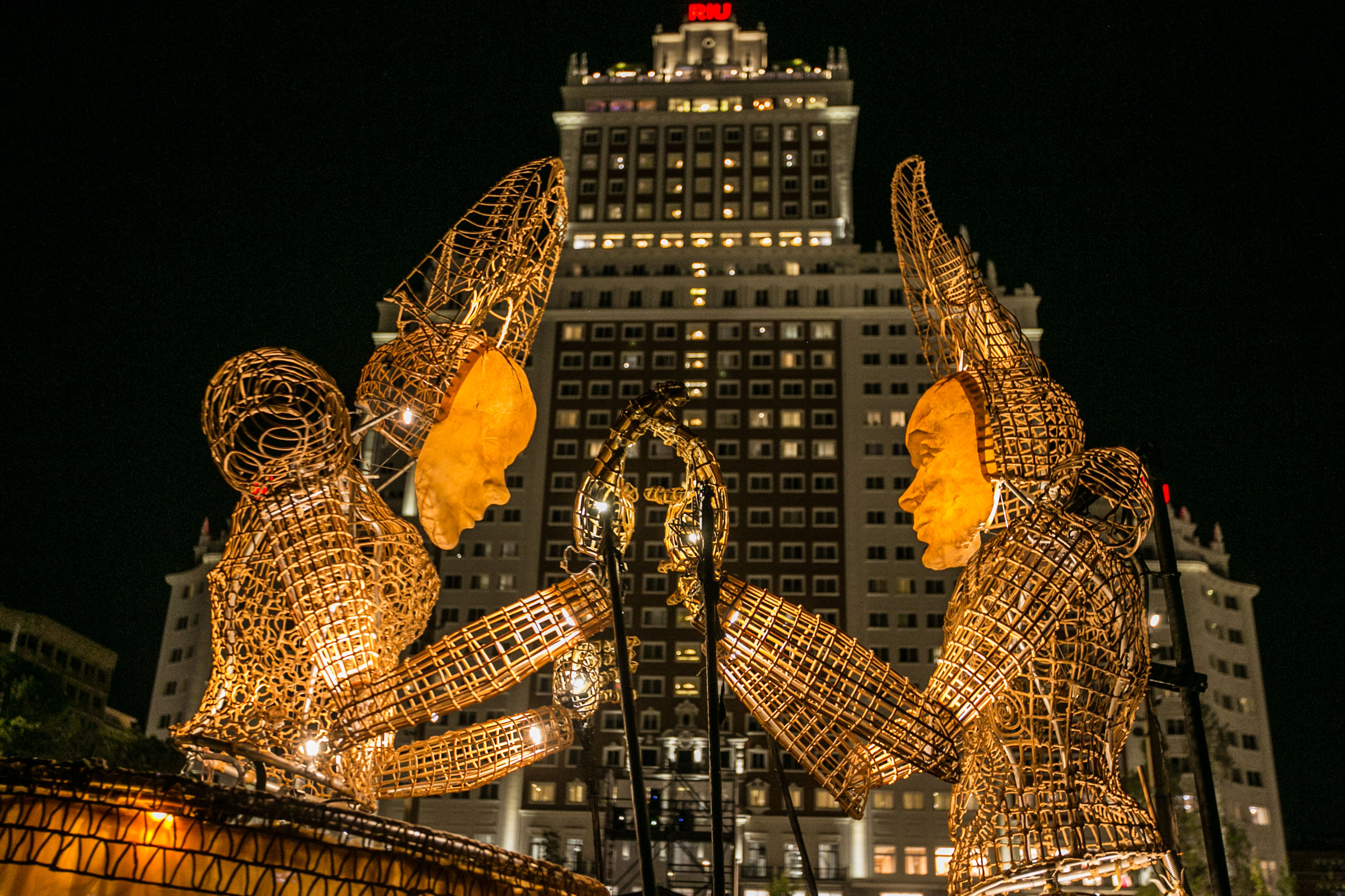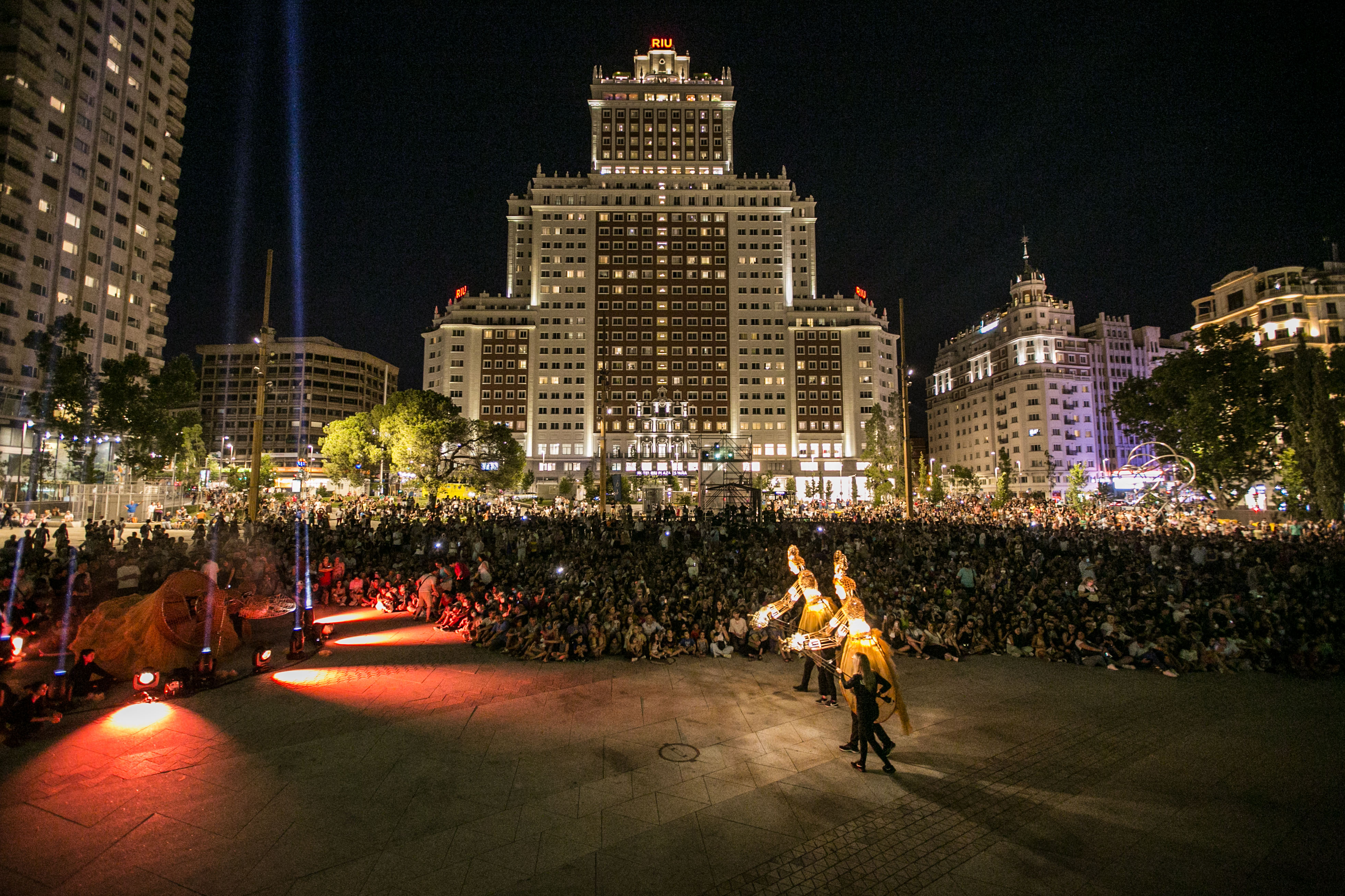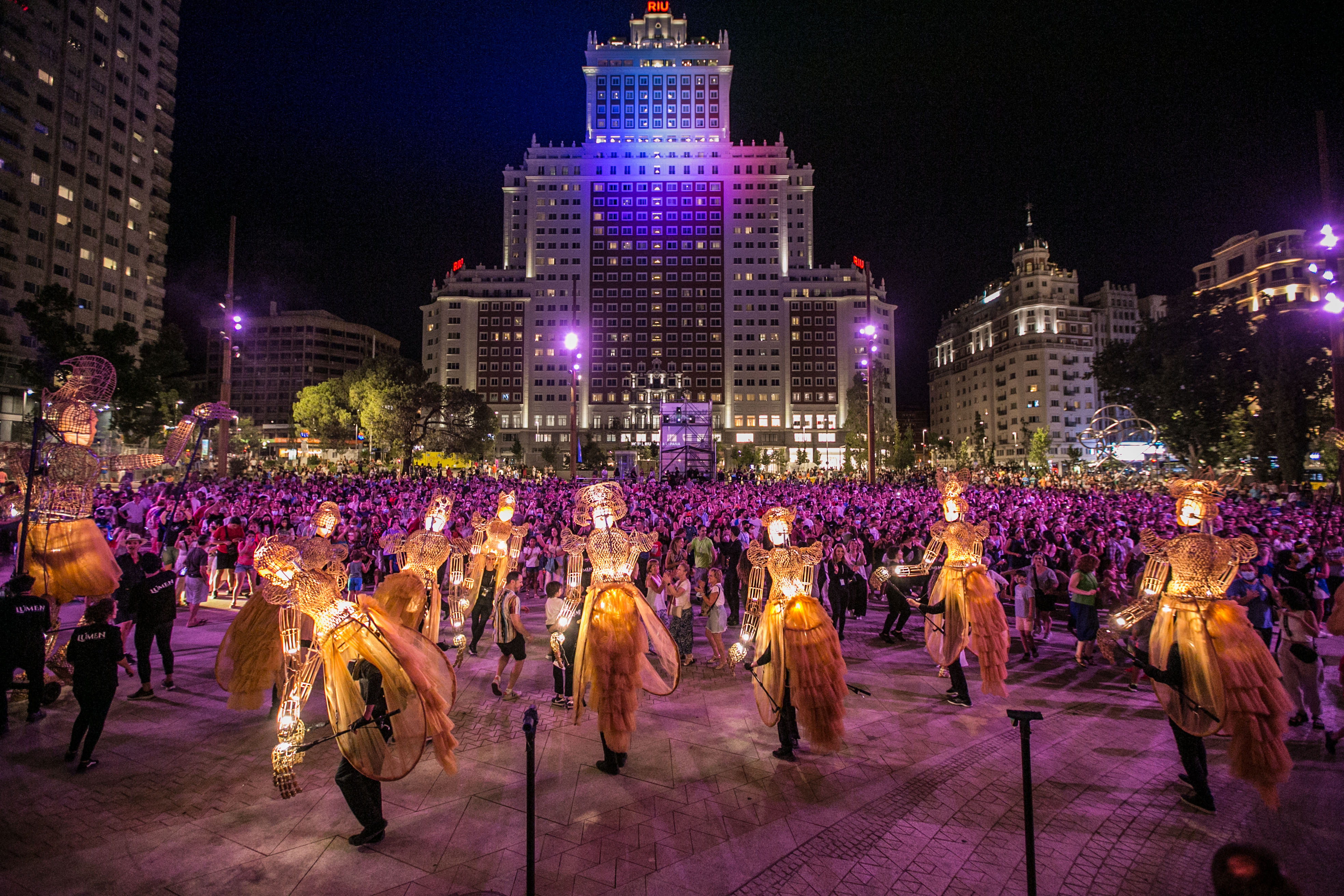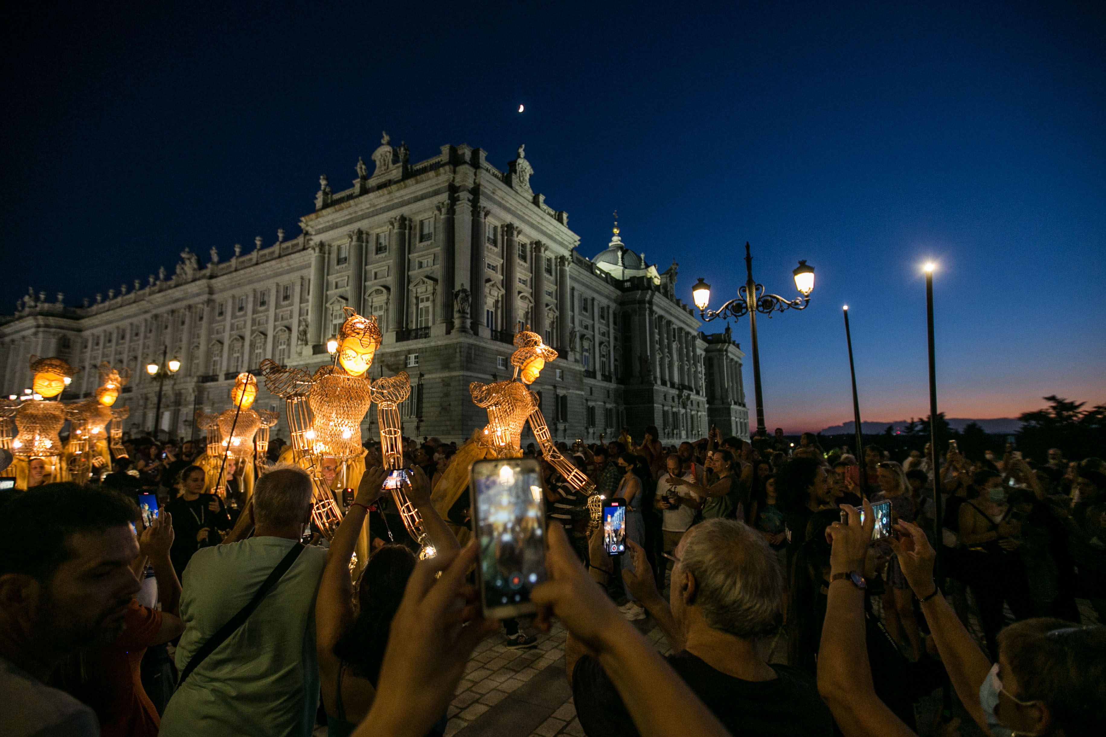Madrileños y turistas acudieron asombrados a esta original propuesta en la que ocho marionetas lumínicas de dos metros de altura pasaron junto a algunos de los grandes monumentos madrileños, como el Palacio Real o el Teatro Real, al anochecer. En la plaza de España esperaban otras dos marionetas de cinco metros de altura con las que bailaron y escenificaron un bello reencuentro, que fue visto por más de 2.500 madrileños, según datos de Madrid Destino. Se trataba del primer gran evento cultural que se ha celebrado en la renovada plaza de España.