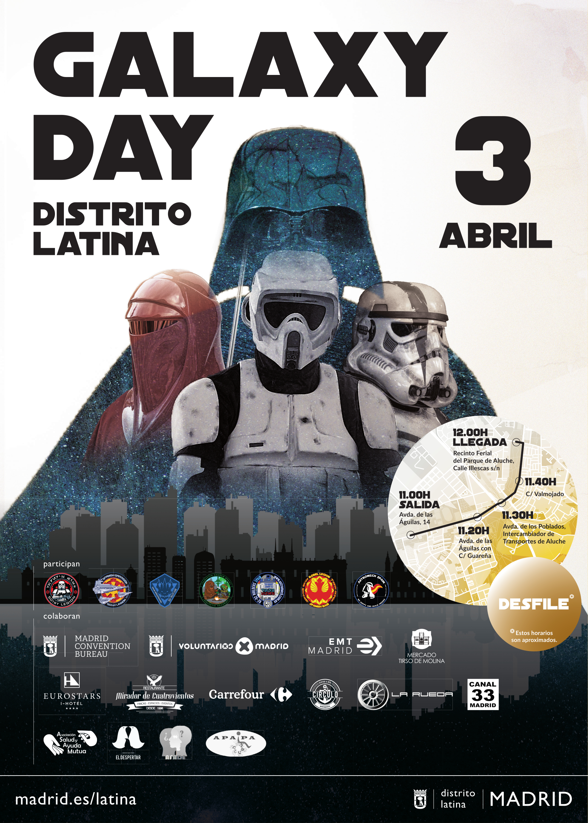 Tropas imperiales inspiradas en la Legión 501 de la mítica saga cinematográfica Star Wars desfilarán en Madrid, por los barrios de Aluche y Las Águilas, el próximo domingo 3 de abril en favor de cuatro entidades sociales que desarrollan su labor en los ámbitos de la diversidad funcional y la salud mental. Este gran espectáculo es una iniciativa de la Junta Municipal de Latina que aúna entretenimiento intergeneracional y ocio solidario con la participación altruista de clubes de fans del universo Star Wars.