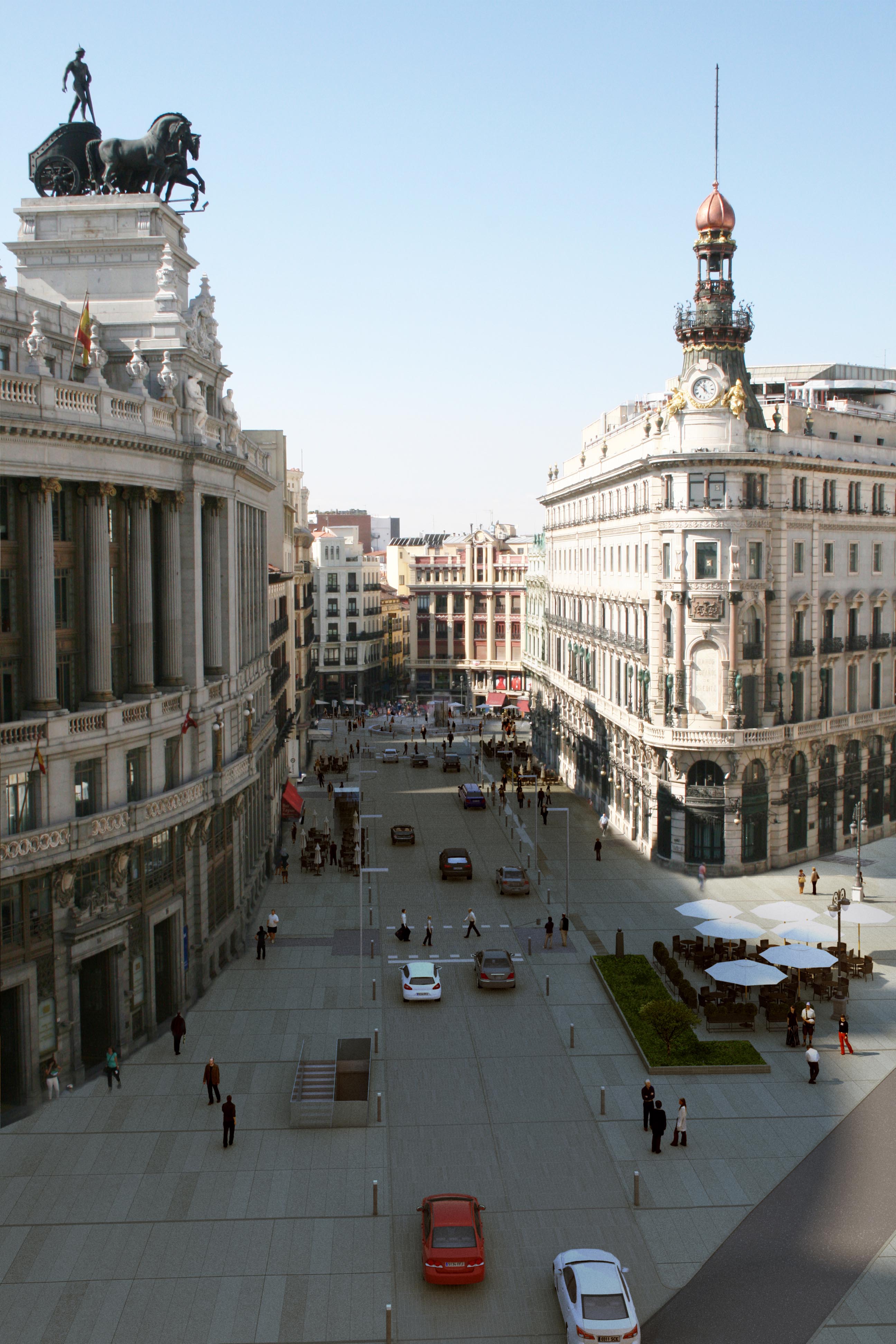El documento contempla la ampliación de las aceras en la calle Sevilla y reordena los sentidos de tráfico en la calle Arlabán y Cedaceros para permitir el acceso al aparcamiento. En cuanto a los elementos protegidos por el catálogo del Plan General, el jardín y la estatua situados en el cruce de Alcalá y Sevilla, modifican su trazado y ubicación para mejorar su integración dentro de la nueva ordenación propuesta, si bien se mantienen en la zona donde se encuentran actualmente.