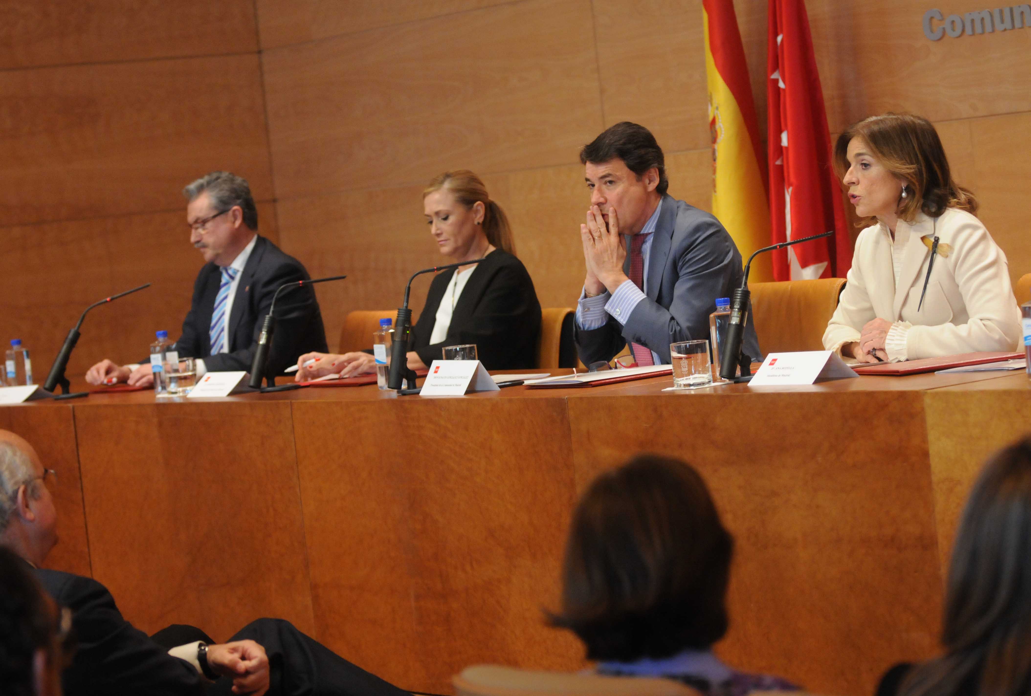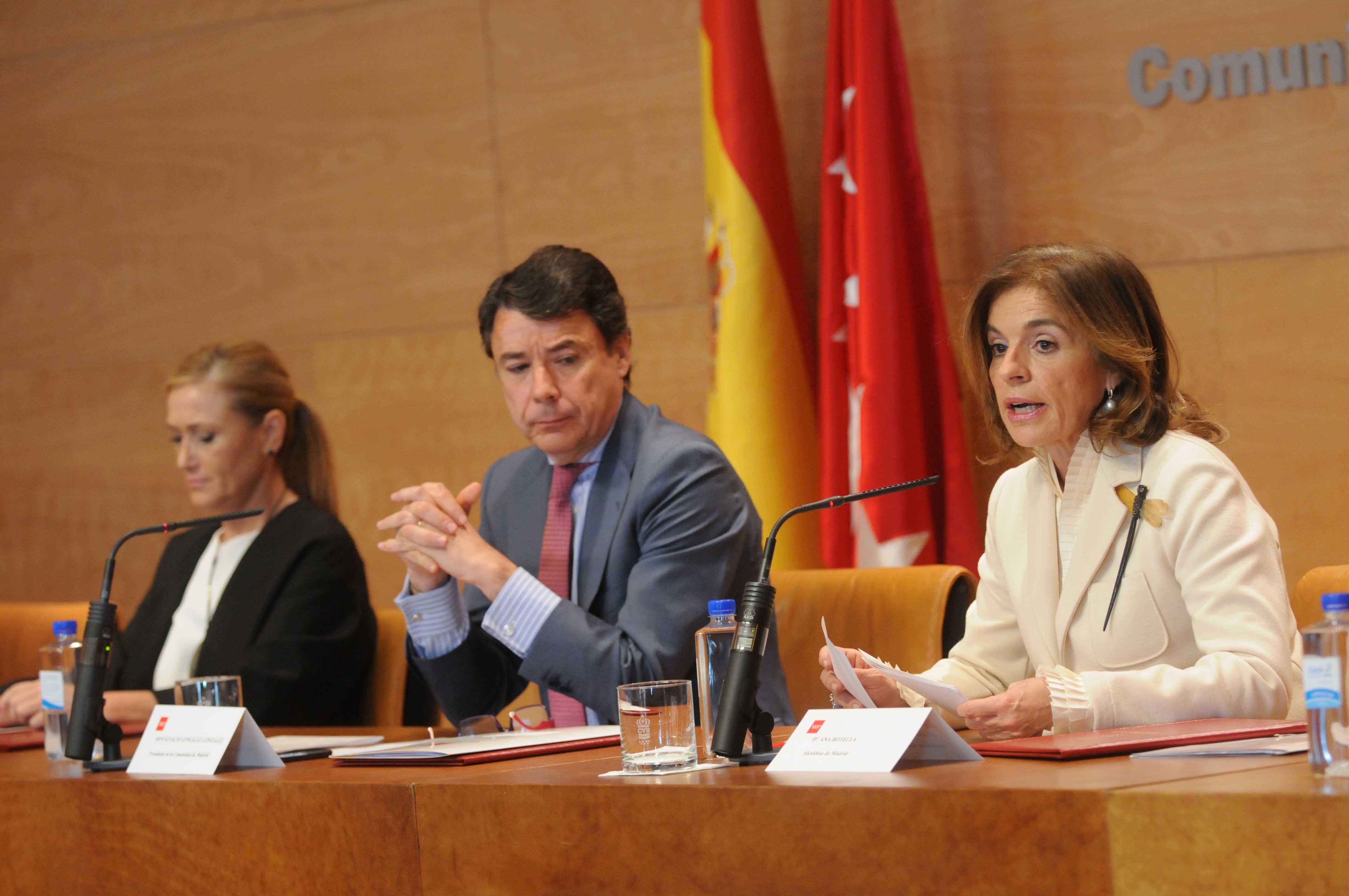 Imágenes de la firma del acuerdo de colaboración para mejorar la seguridad en la Cañada Real. Al acto, celebrado en la Real Casa de Correos, han asistido, además de la alcaldesa, Ana Botella, la delegada del Gobierno, Cristina Cifuentes, el presidente de la Comunidad de Madrid, Ignacio González, y el alcalde de Coslada, Raúl López.