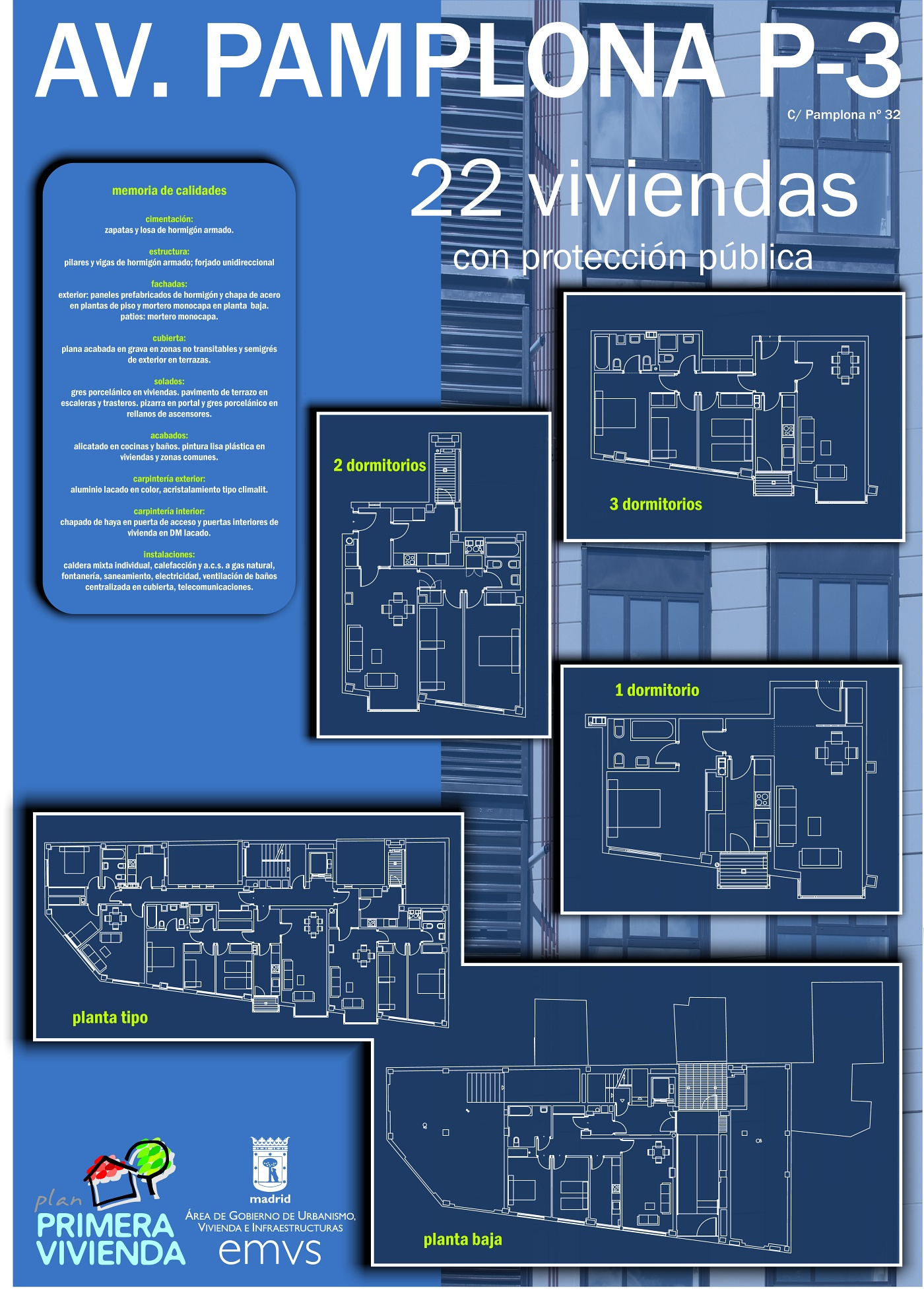 La nueva promoción está situada en la avenida de Pamplona y alberga 22 viviendas en régimen de venta, de las que tres tienen un dormitorio y 49 metros cuadrados de superficie, 12 tienen dos dormitorios y 65 metros cuadrados, y siete son de tres dormitorios y 75 metros cuadrados, todas ellas con trastero vinculado. “El esfuerzo solidario de los madrileños hace posible que los precios de estas viviendas sean muy inferiores a los de mercado”, ha recordado Pilar Martínez. Los adjudicatarios de las nuevas viviendas pagarán precios de 75.234 euros para las viviendas de un dormitorio, 98.521 euros para las de dos, y 112.709 para las de tres dormitorios.