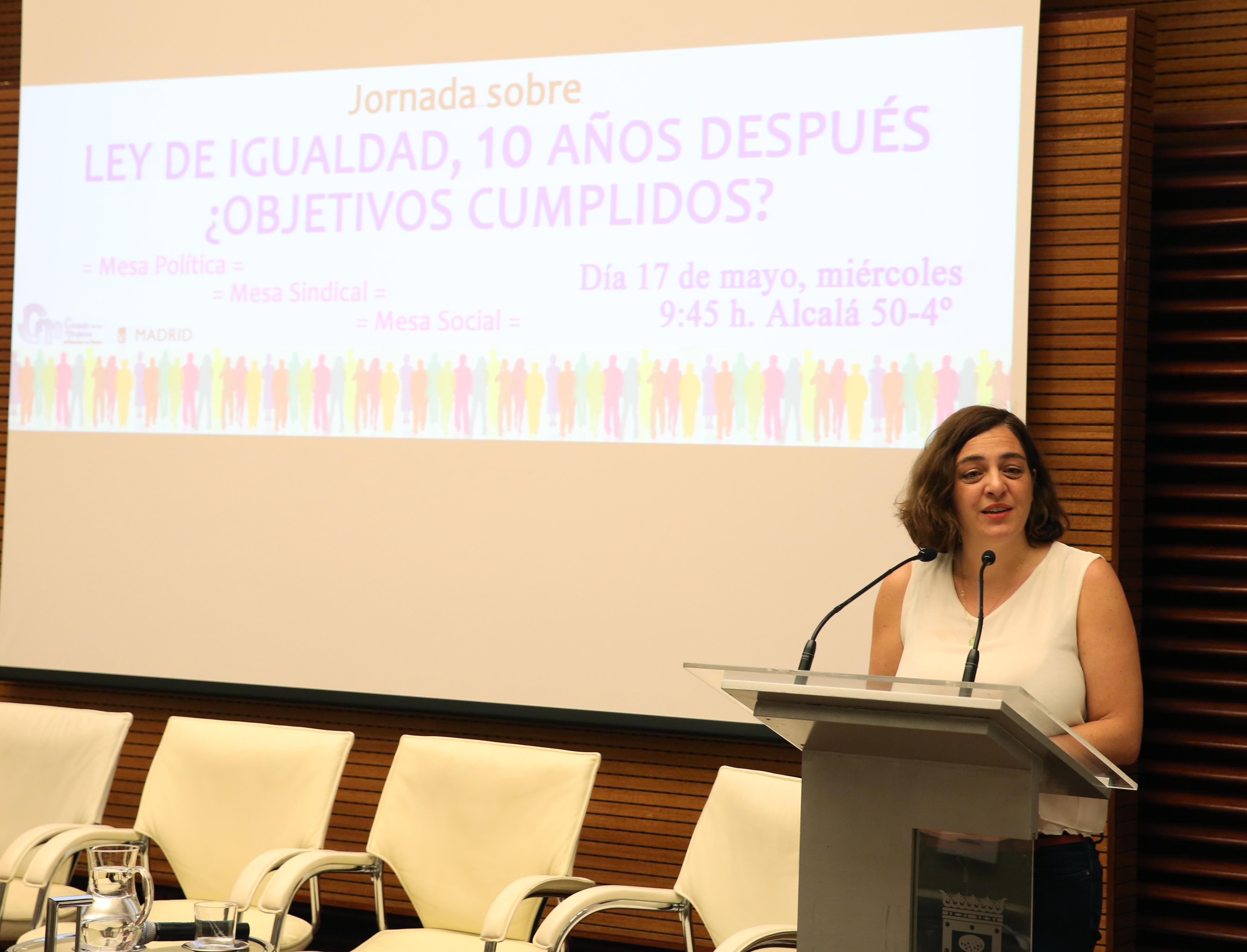 La delegada de Políticas de Género y Diversidad, Celia Mayer, ha participado en la inauguración esta mañana de la Jornada 'Ley de Igualdad, 10 años después. ¿Objetivos cumplidos?', organizada por el Consejo de las Mujeres del municipio de Madrid, órgano consultivo adscrito al Área, con el objetivo de reunir a expertas de diferentes ámbitos para analizar si, 10 años después de la aprobación de la Ley Orgánica 3/2007 para la igualdad efectiva de mujeres y hombres, se ha aplicado la ley y si se están cumpliendo sus objetivos.