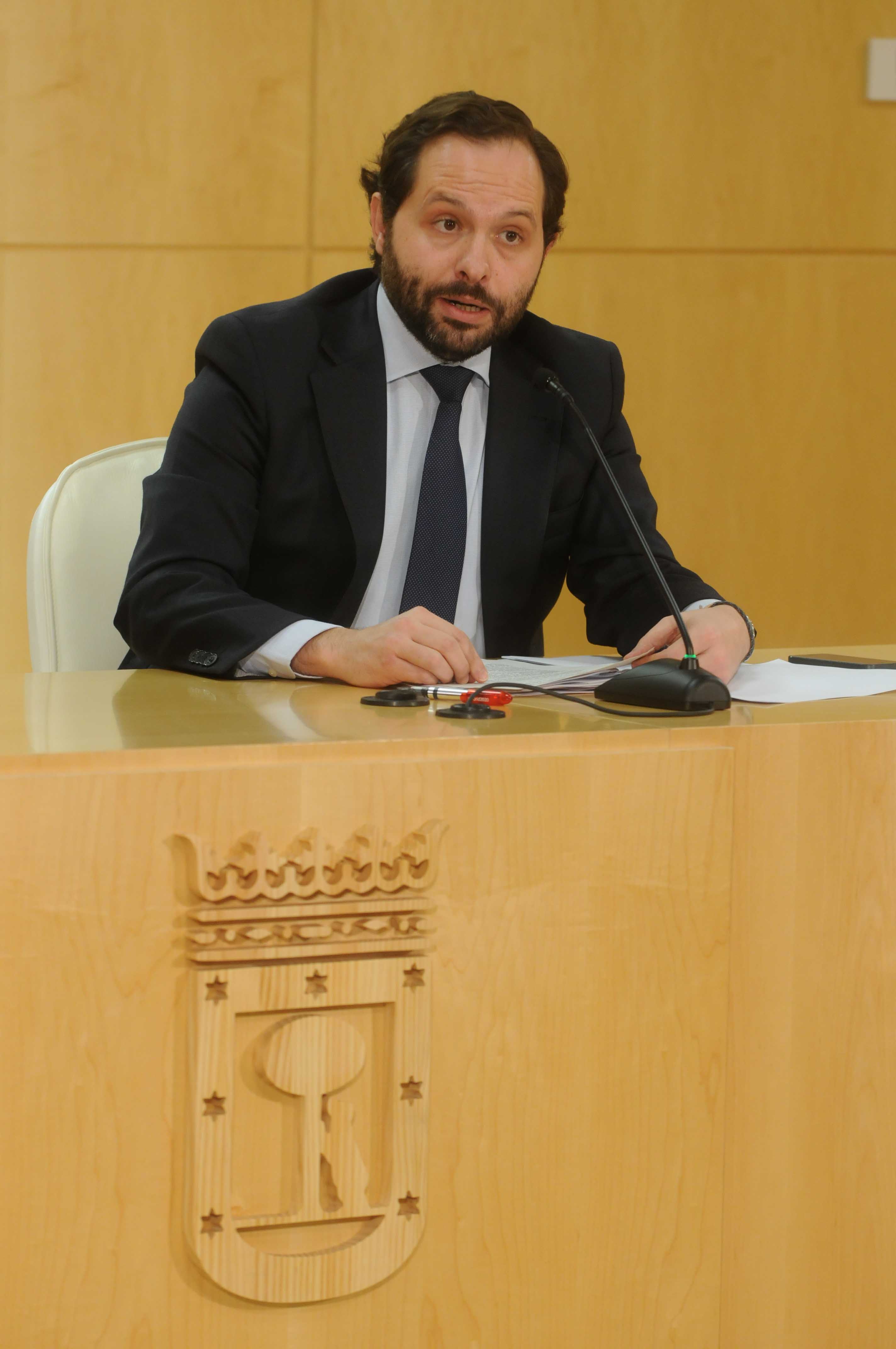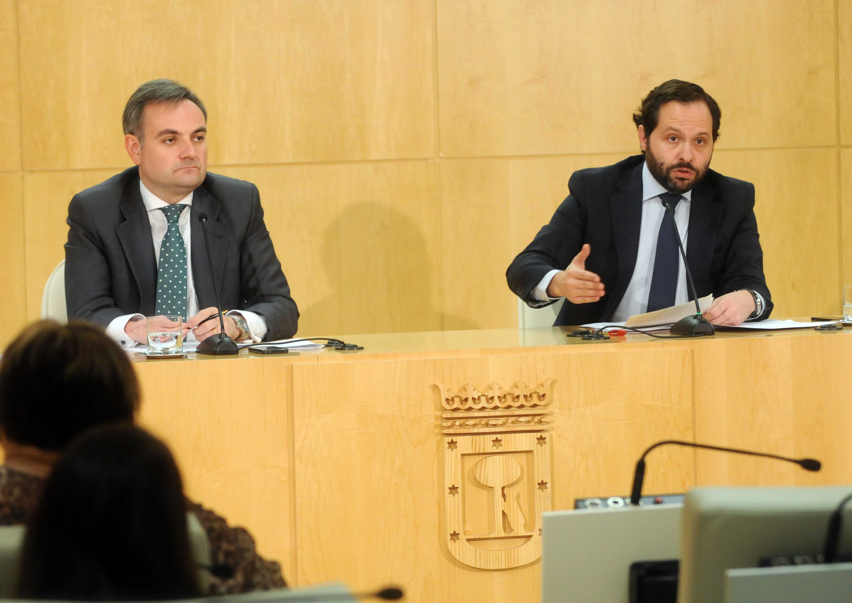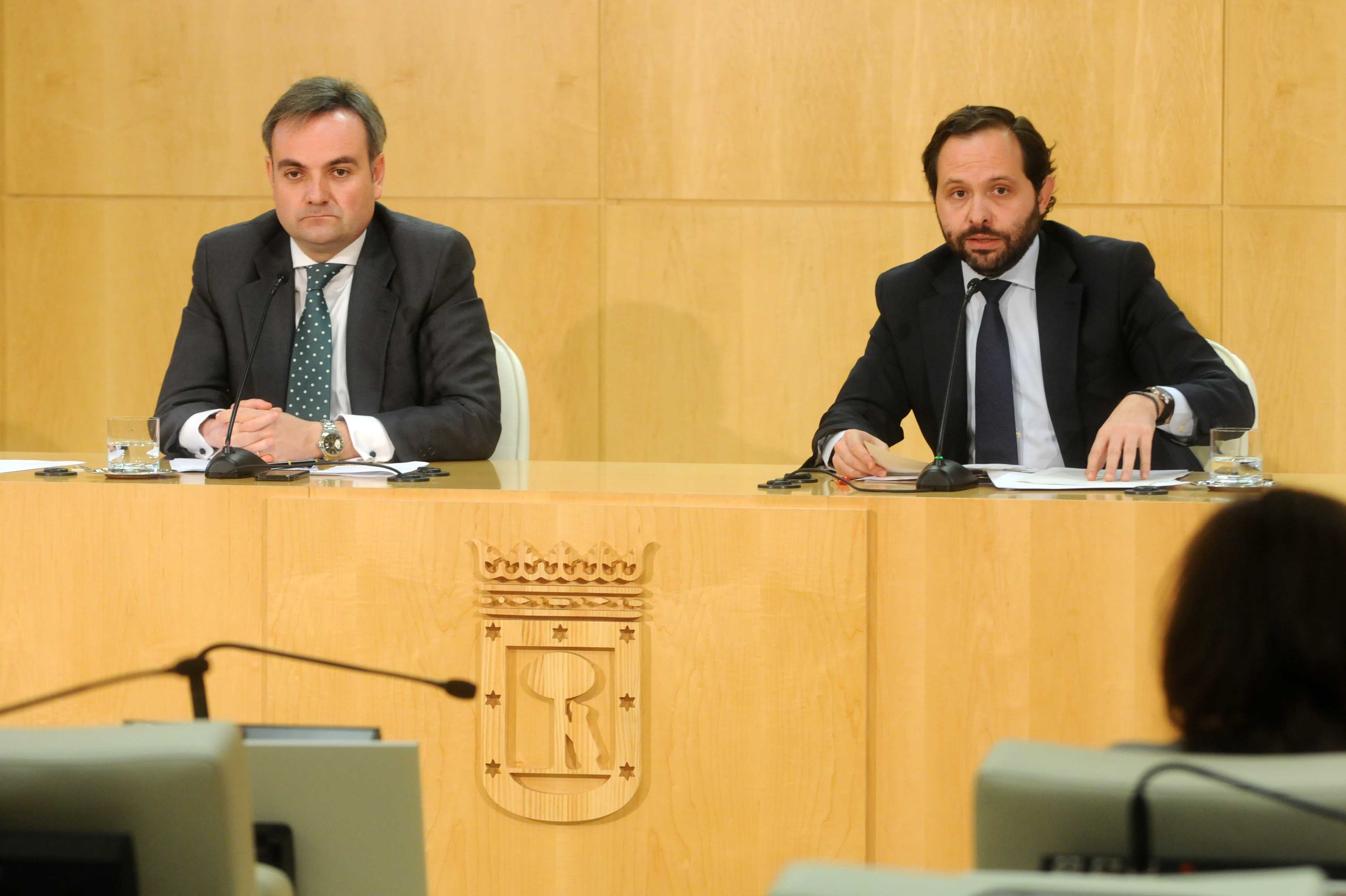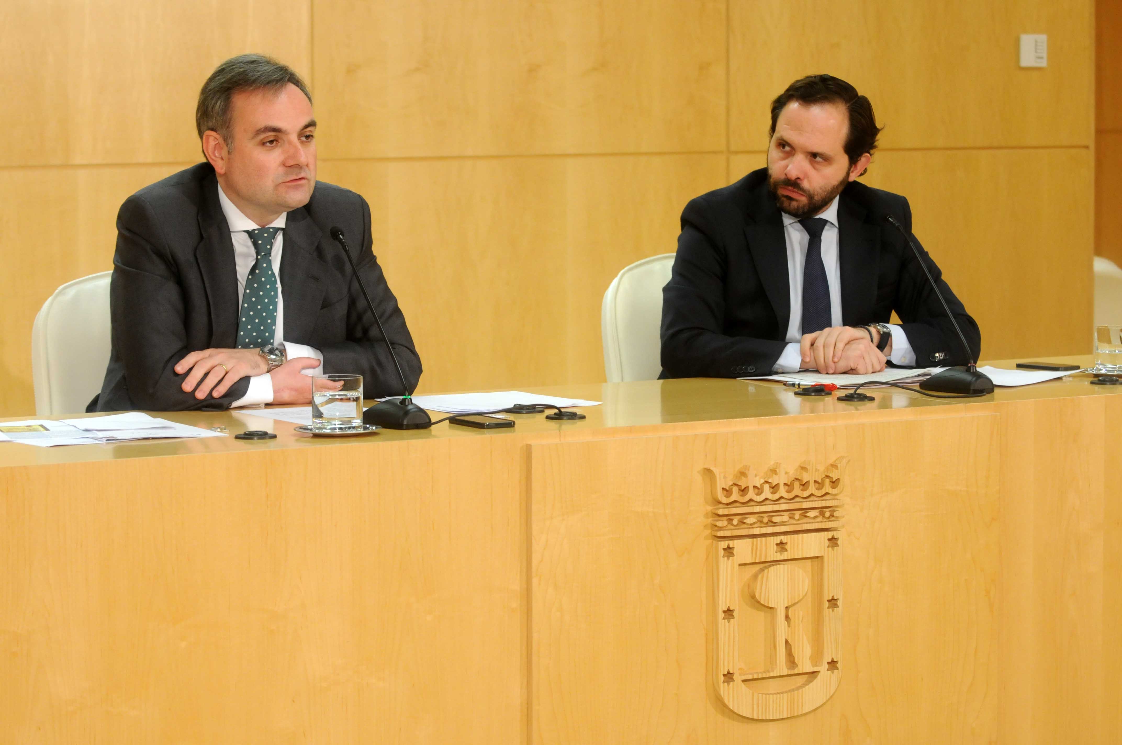 El Delegado del Área de Gobierno de Seguridad y Emergencias, Enrique Núñez, y el Delegado del Área de Gobierno de Medio Ambiente y Movilidad, Diego Sanjuanbenito, en la rueda de prensa posterior a la Junta de Gobierno, celebrada en Cibeles.