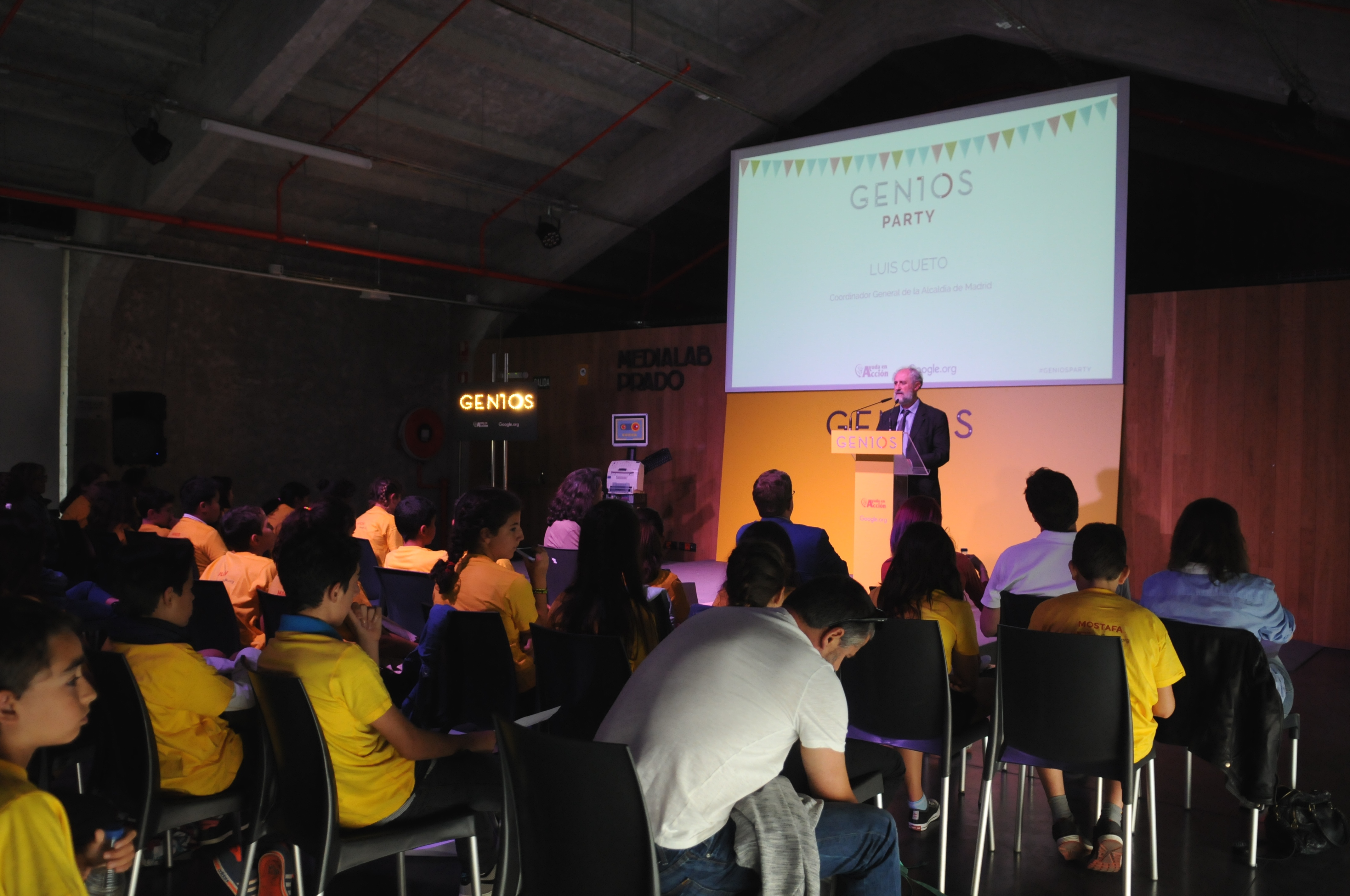 Medialab-Prado ha acogido hoy la primera edición de la “Genios Party”, una fiesta que cierra el proyecto GENIOS, que ha conseguido llegar este curso 2015-2016 a más de 2.700 estudiantes de primaria y 230 docentes, de 31 colegios de 9 comunidades autónomas, dentro del programa de Apoyo a la Infancia en España de la ONG Ayuda en Acción. Luis Cueto, coordinador general de Alcaldía del Ayuntamiento de Madrid, ha asistido como ponente a este evento, que tiene como objetivo principal promover el aprendizaje de nuevas tecnologías entre los estudiantes.