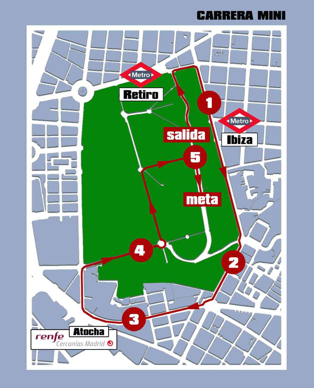 La hora de inicio del medio maratón está fijada a las 9.30 horas y seguirá el siguiente itinerario: paseo del Duque Fernán Núñez (Parque del Retiro) - O'Donnell - Príncipe de Vergara -Diego de León -Serrano - Juan Bravo - Puente de Enrique de la Mata Gorostizaga -Almagro - Glorieta de Alonso Martínez -Santa Engracia - Glorieta de Cuatro Caminos - Bravo Murillo - plaza de Castilla -Mateo Inurria - plaza de Platerías -avenida de Pío XII - Príncipe de Vergara - plaza de República del Ecuador -Serrano -Diego de León - Príncipe de Vergara -Menéndez Pelayo - Glorieta Mariano de Cavia -avenida de la Reina Cristina - paseo de la Infanta Isabel -Alfonso XII -entrada en el Retiro por la Puerta del Ángel Caído - paseo del Duque de Fernán Núñez (bordeando la Rosaleda) -paseo de Uruguay - glorieta del Ángel Caído -avenida de Cuba - paseo de Venezuela y paseo Duque de Fernán Núñez.