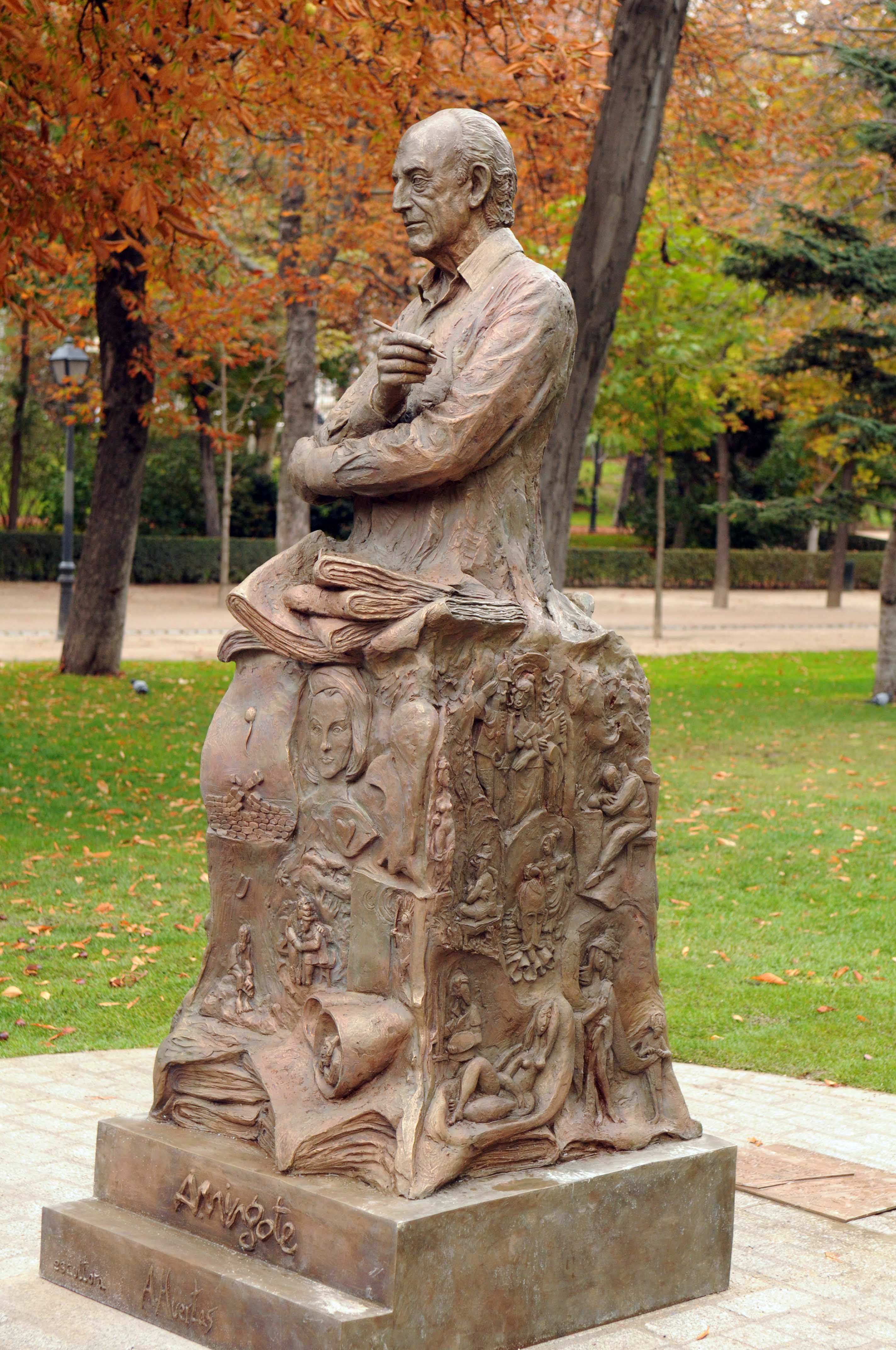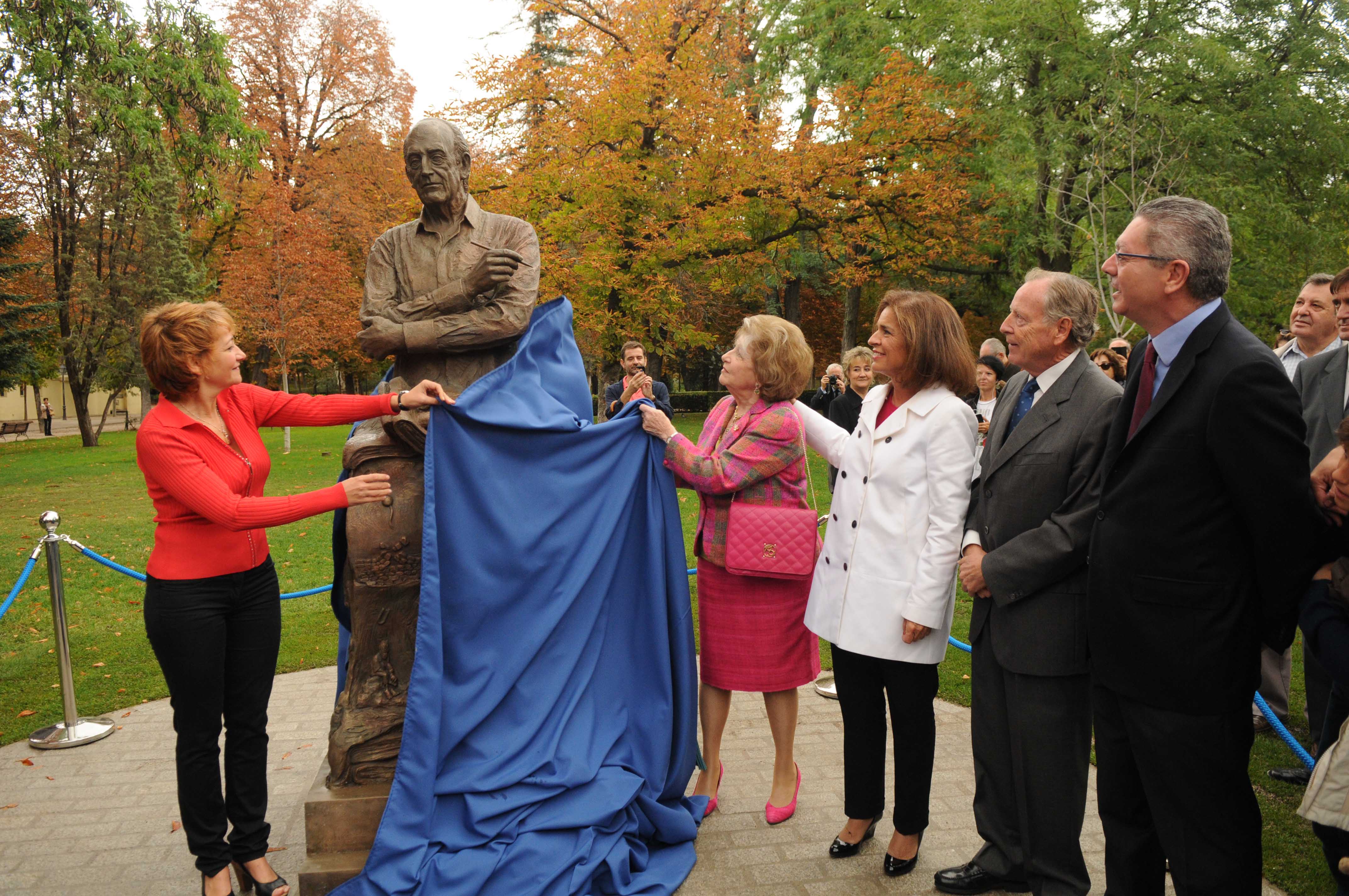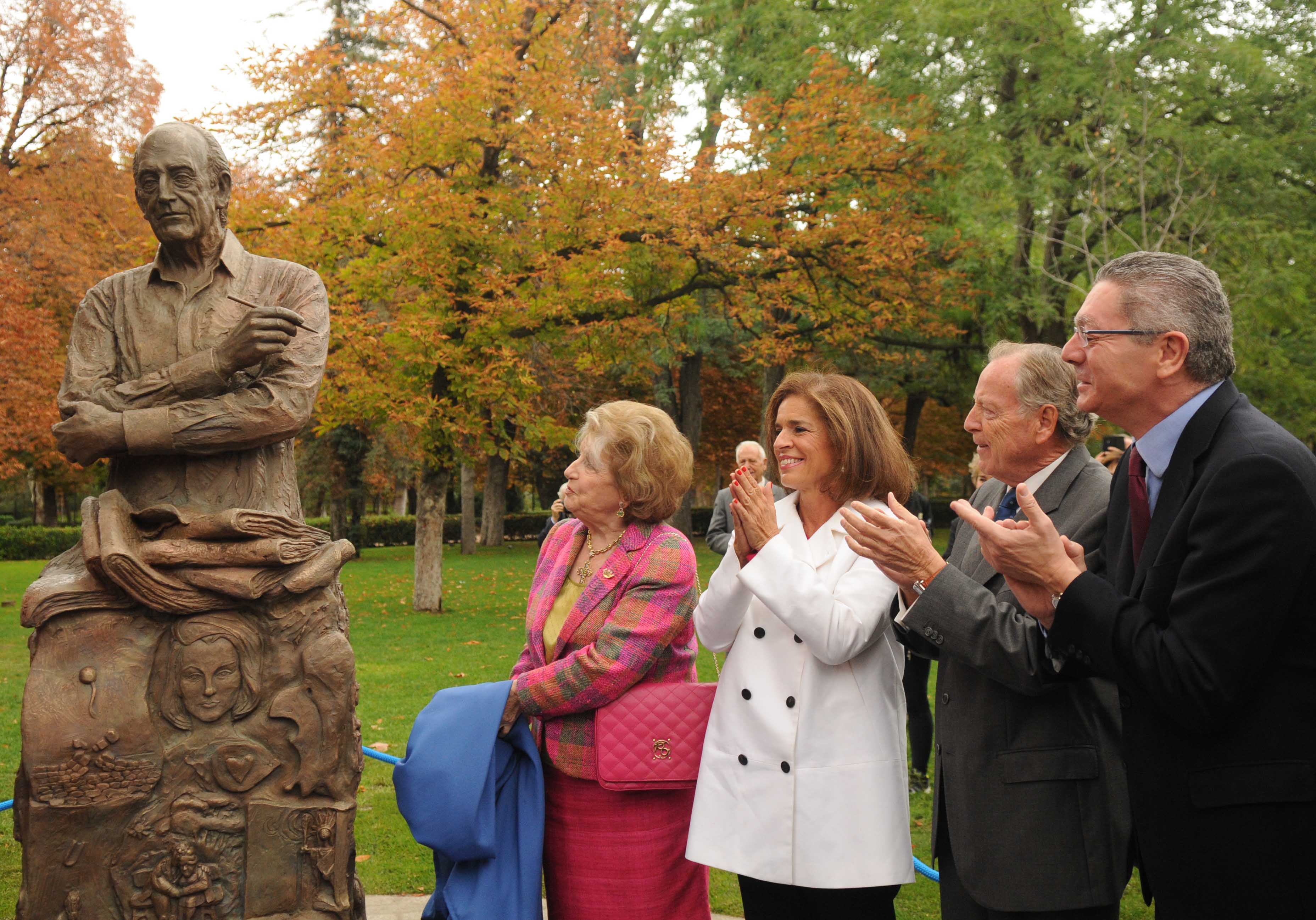 Mingote Vivo. El título de la talla en bronce, firmada por Alicia Huertas, refleja su fin: perpetuar en la memoria de los madrileños la figura del que fuera Alcalde Honorario de El Retiro y uno de los artistas más ligados a la ciudad y que mejor la ha retratado, Antonio Mingote. Desde hoy, el monumento inaugurado por la alcaldesa, Ana Botella, en compañía de la esposa del artista fallecido en 2012, Isabel Vigiola, es un homenaje permanente a, quien en palabras de Botella, fue “un hombre bueno y bondadoso, a una persona a la que le movían la ternura y la amistad, que para él era la mayor riqueza del hombre: Antonio Mingote”.Tras la muerte del polifacético artista –dibujante, académico, escritor y periodista– el Ayuntamiento convocó un concurso, en el que pedía además que las obras presentadas tuvieran en cuenta los valores histórico-artísticos y ambientales del parque. El Ayuntamiento cedía el espacio donde ubicarlo, en pleno “territorio Mingote”, como lo ha calificado Botella, y se encargará de su mantenimiento, aunque la financiación ha sido totalmente privada. En este punto, la alcaldesa agradeció a la patrocinadora de la escultura, Concha Mira, “su labor de mecenas por respaldar este homenaje a Mingote desde su admiración hacia el maestro”.