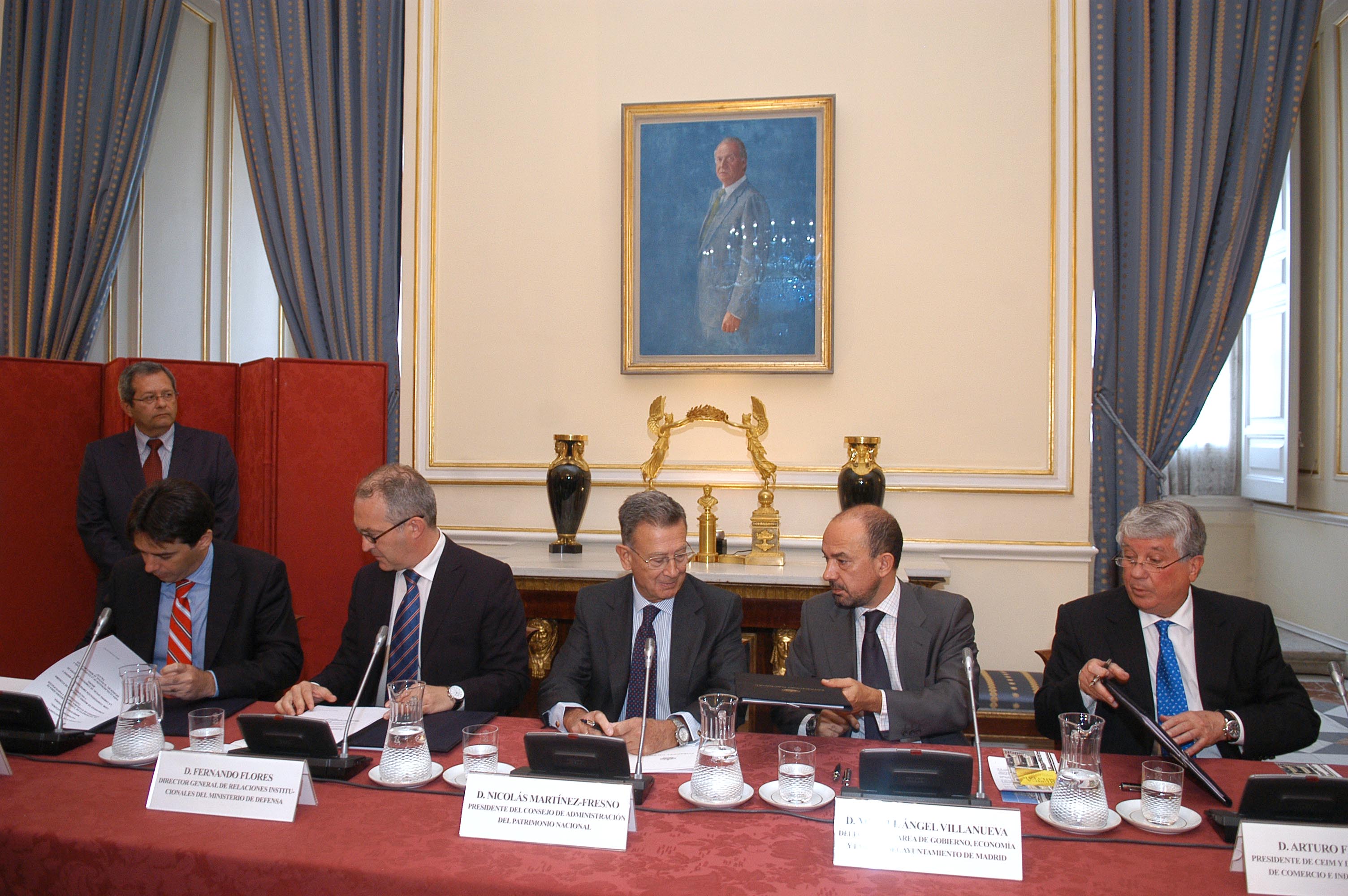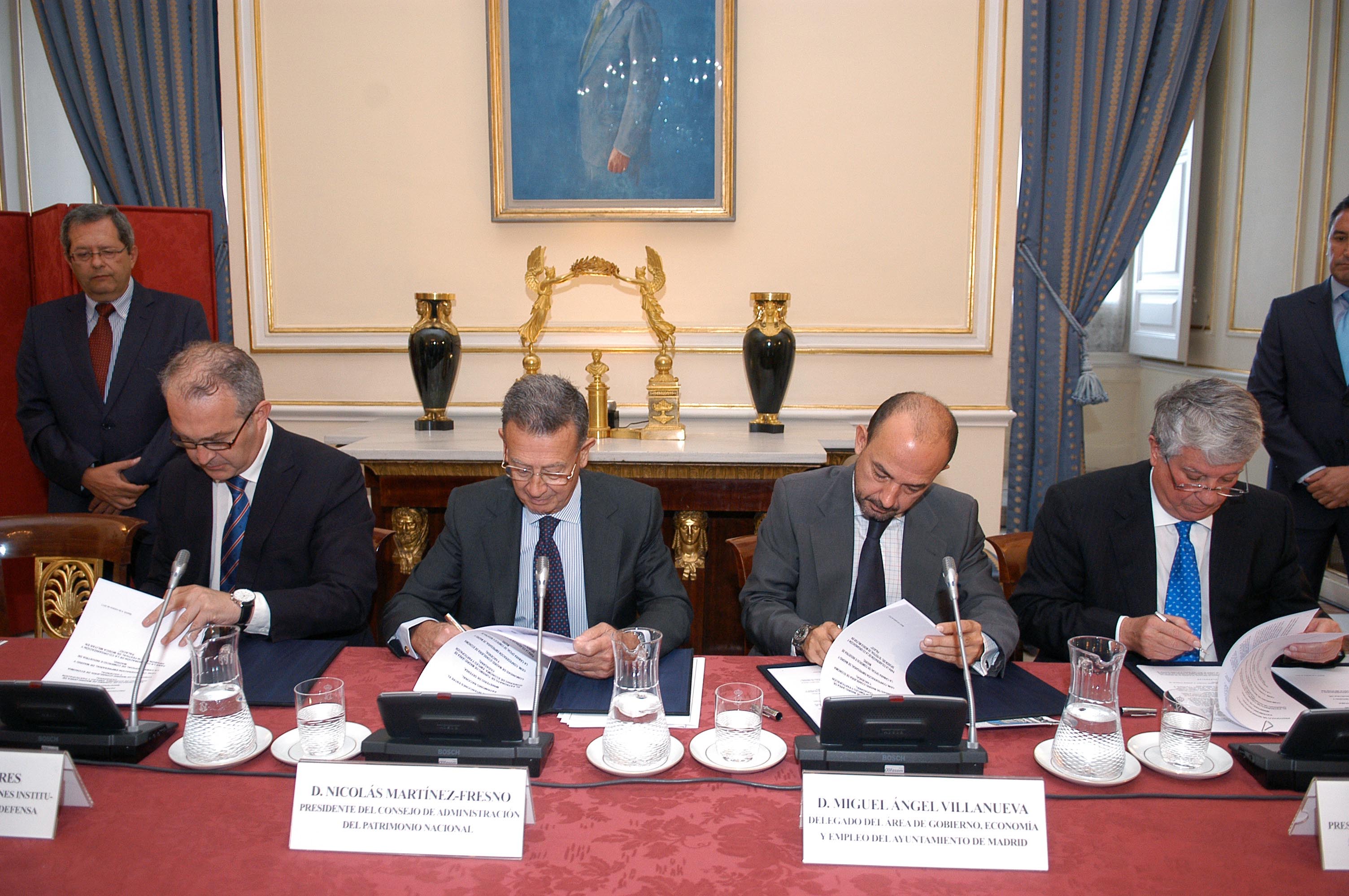 El Festival de Música Militar se celebrará los próximos días 9 10 y 11 de octubre, en la Plaza de Armas del Palacio Real. Se trata de la tercera edición de un programa que atrae y sorprende por igual a los residentes en la capital como a los turistas. Para la organización del festival hoy han firmado un convenio de colaboración el delegado de Economía, Empleo y Participación Ciudadana, Miguel Ángel Villanueva, el presidente del consejo de Administración de Patrimonio Nacional, Nicolás Martínez-Fresno, el consejero de Economía y Hacienda de la Comunidad de Madrid, Percival Manglano; Fernando Flores, director general de Relaciones Institucionales del Ministerio de Defensa y el presidente de la CEIM y de la Cámara Oficial de Comercio e Industria de Madrid, Arturo Fernández.
