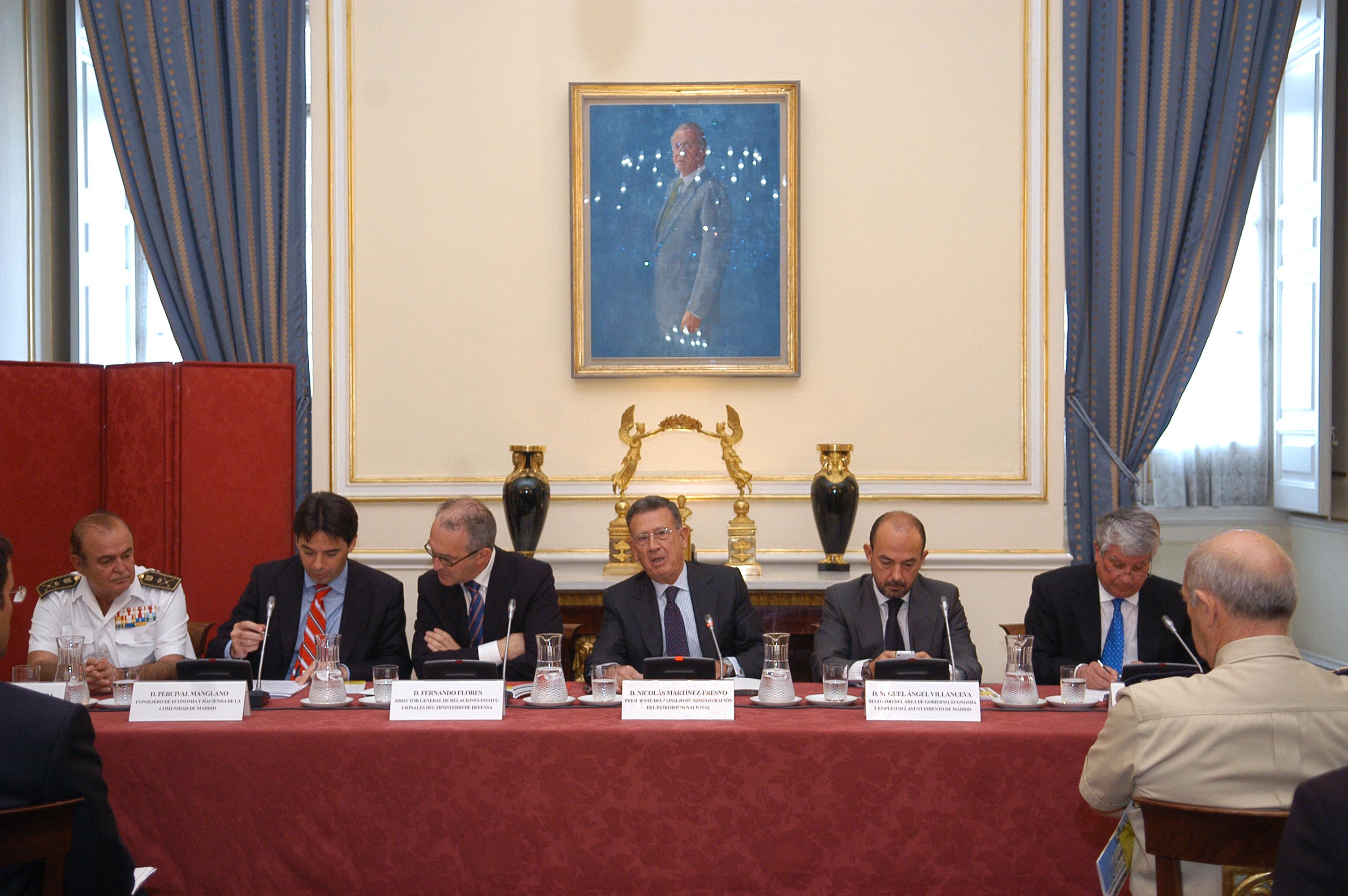 De izquierda a derecha Francisco Grau Vergara, general de Brigada del Cuerpo de Músicas Militares; Percival Manglano, consejero de Economía y Hacienda de la Comunidad de Madrid; Fernando Flores, director general de Relaciones Institucionales del Ministerio de Defensa; Nicolás Martínez-Fresno, presidente del consejo de Administración de Patrimonio Nacional; Miguel Ángel Villanueva, delegado de Economía, Empleo y Participación Ciudadana, y Arturo Fernández, presidente de la CEIM y de la Cámara Oficial de Comercio e Industria de Madrid.