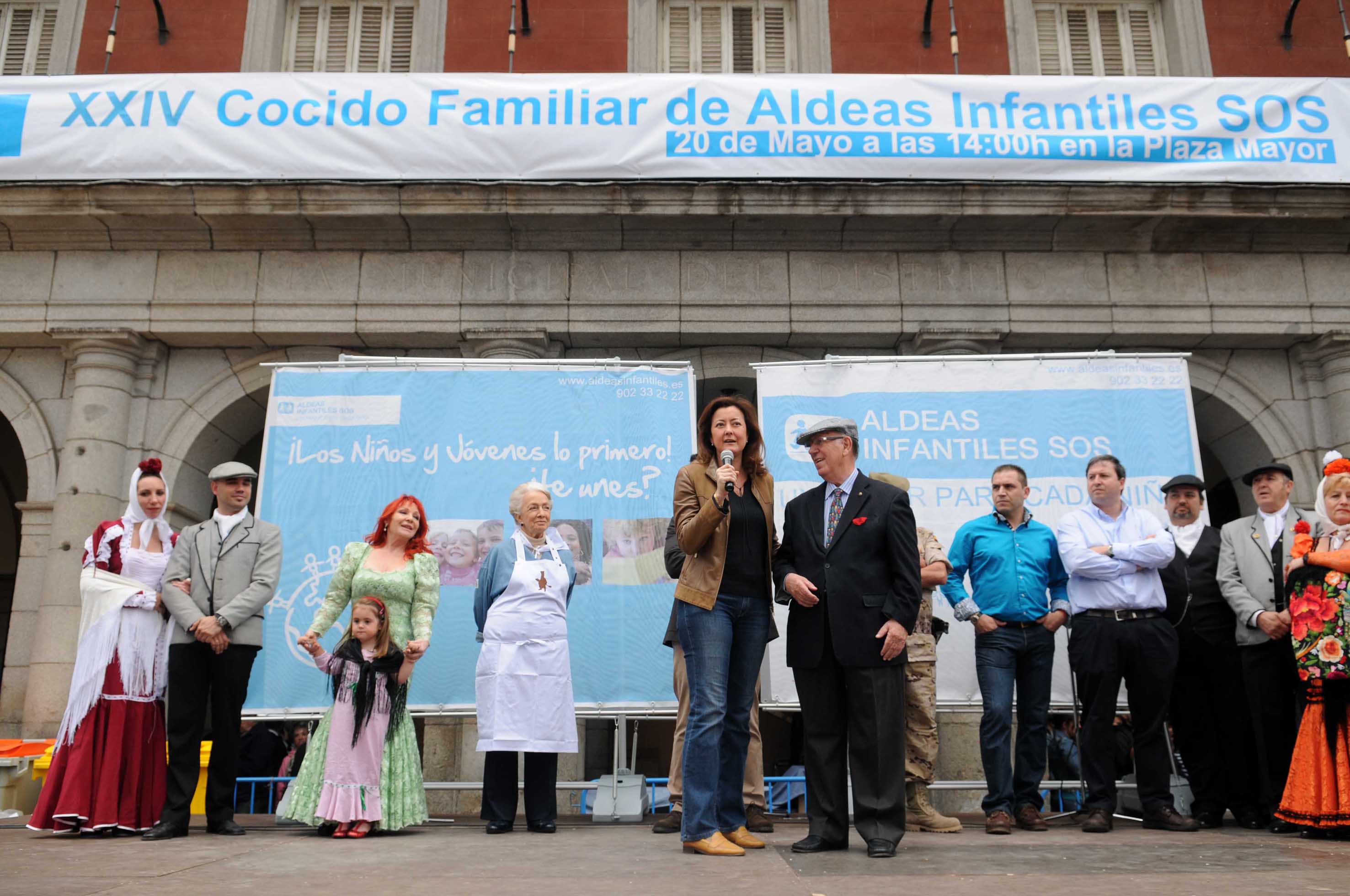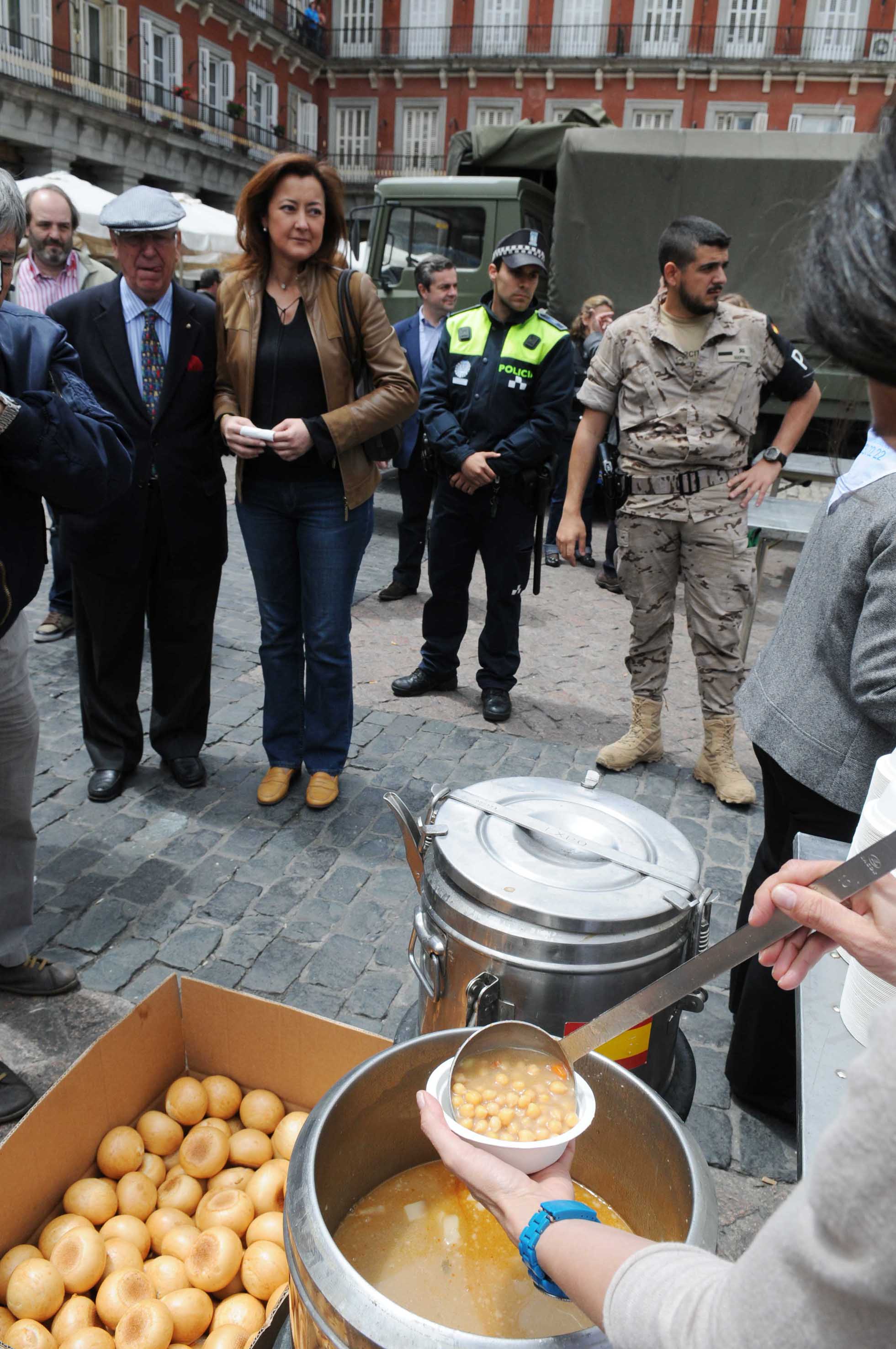 La Delegada de Familia y Servicios sociales del Ayuntamiento de Madrid, Dolores Navarro, ha compartido el cocido de Aldeas Infantiles, en la Plaza Mayor. Como todos los años, coincidiendo con las fiestas patronales de la ciudad, se han cocinado 12.000 raciones de este típico plato madrileño. Este acto es un apoyo a la labor de Aldeas Infantiles, que atienden a 20.000 niños que se encuentran en situación social vulnerable por sus condiciones familiares.