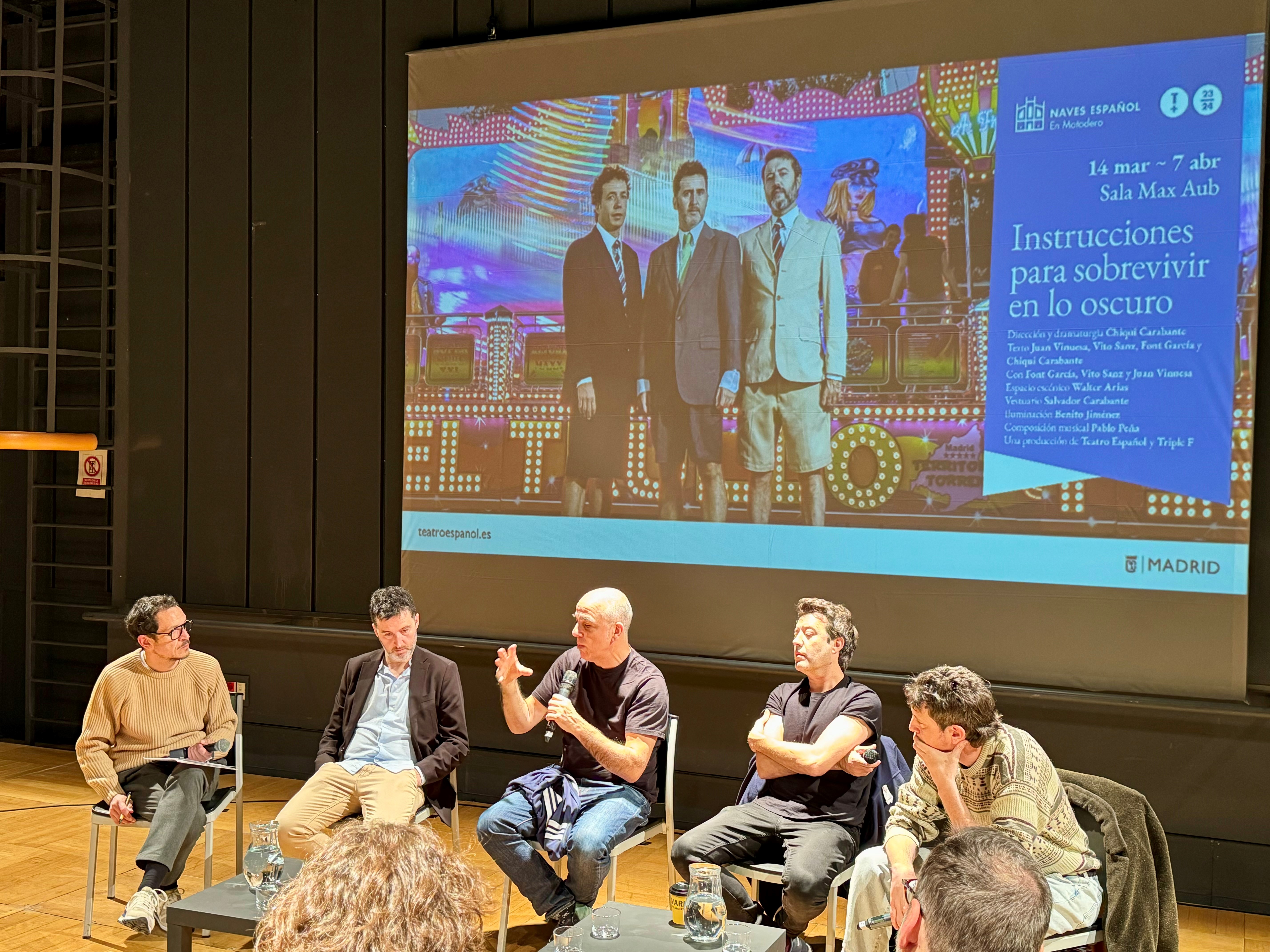 Naves del Español en Matadero, espacio del Área de Cultura, Turismo y Deporte, ha acogido hoy la presentación del estreno absoluto de Instrucciones para sobrevivir en lo oscuro, de la compañía Club Caníbal, dirigida por Chiqui Carabante, con texto de Chiqui Carabante, Font García, Vito Sanz y Juan Vinuesa e interpretada por Font García, Vito Sanz y Juan Vinuesa. El espectáculo, una comedia negra y descarnada que alerta sobre los peligros asociados al populismo y el negacionismo climático, estará en cartel del 14 de marzo al 7 de abril.