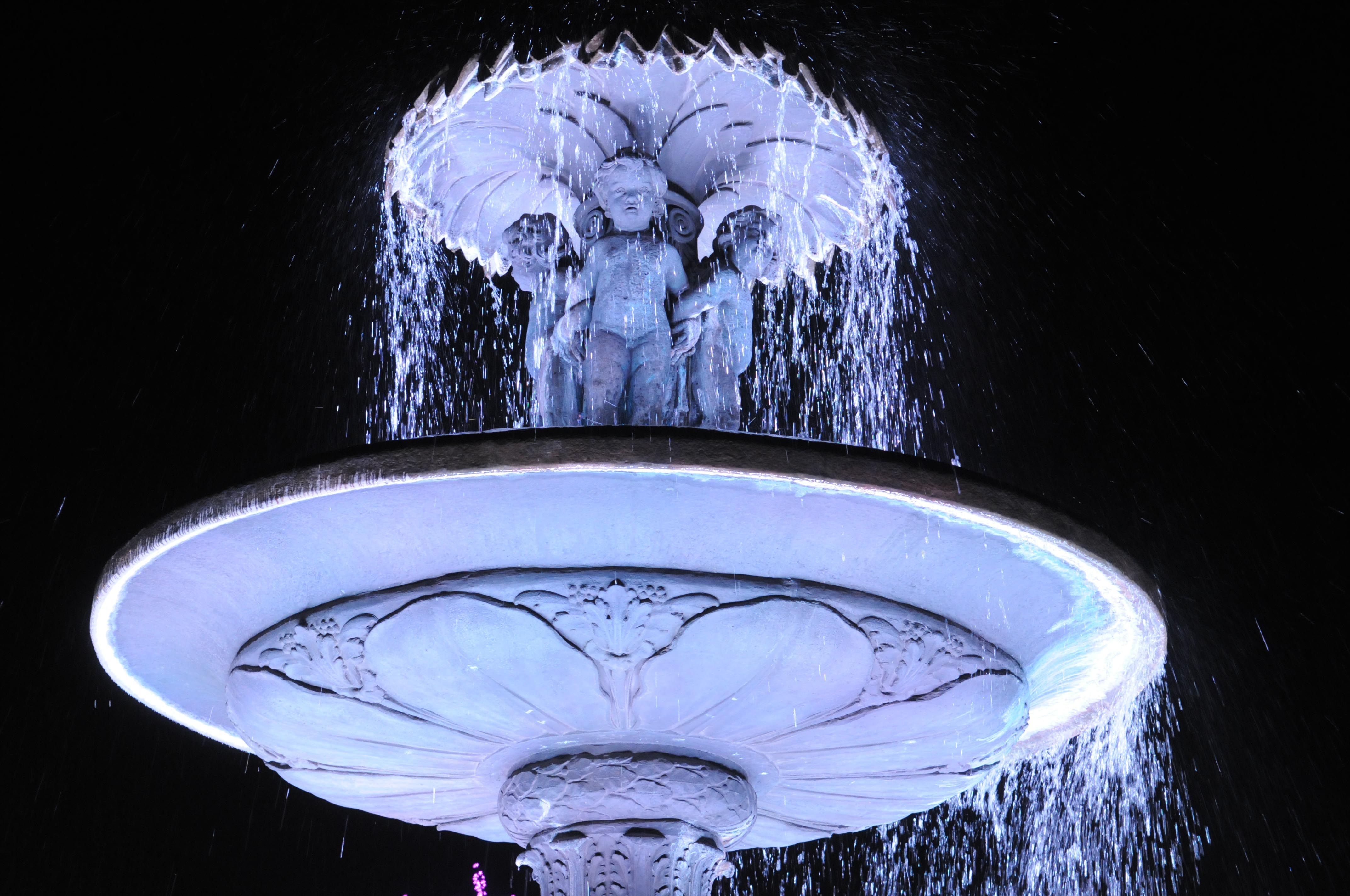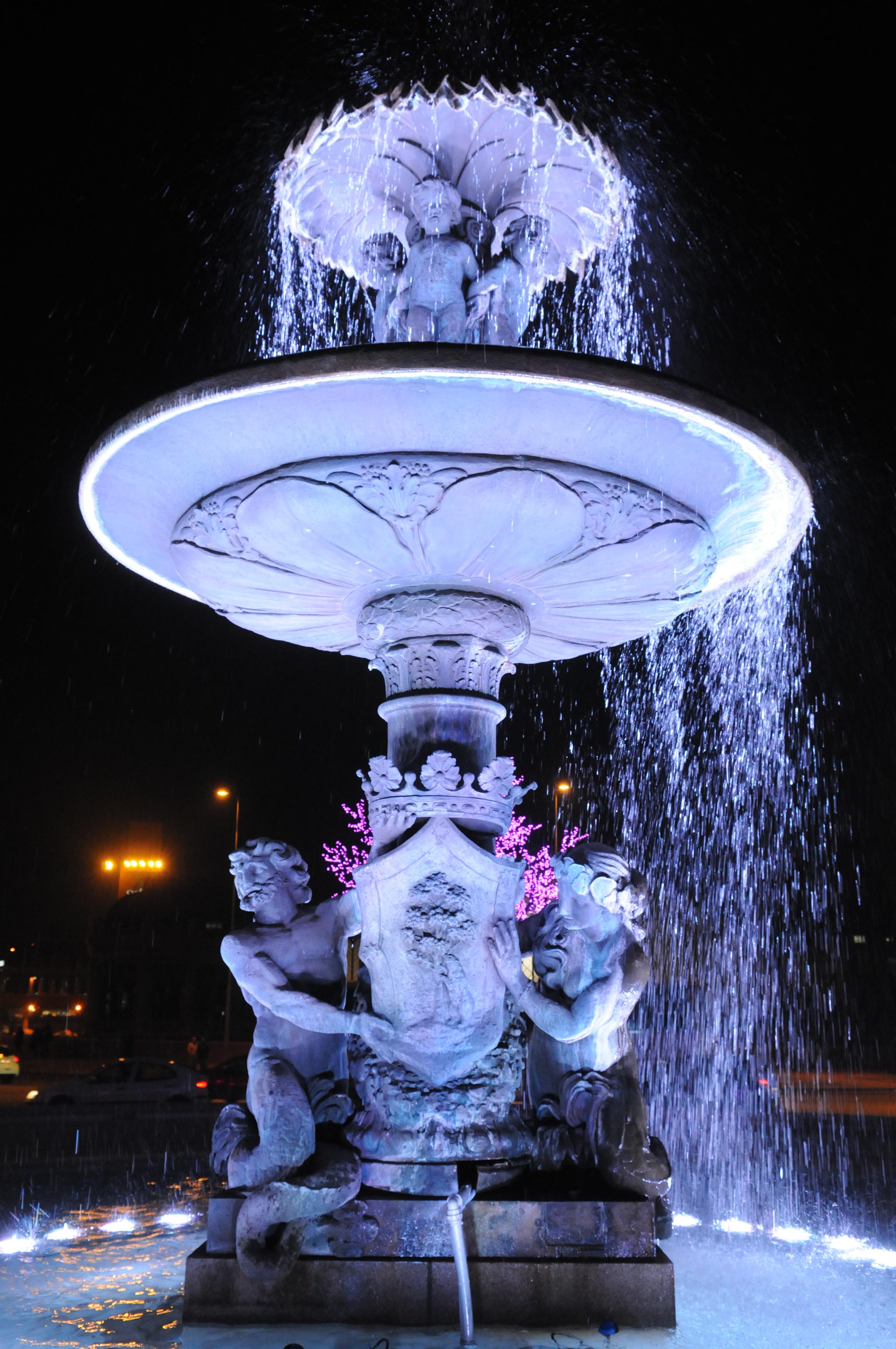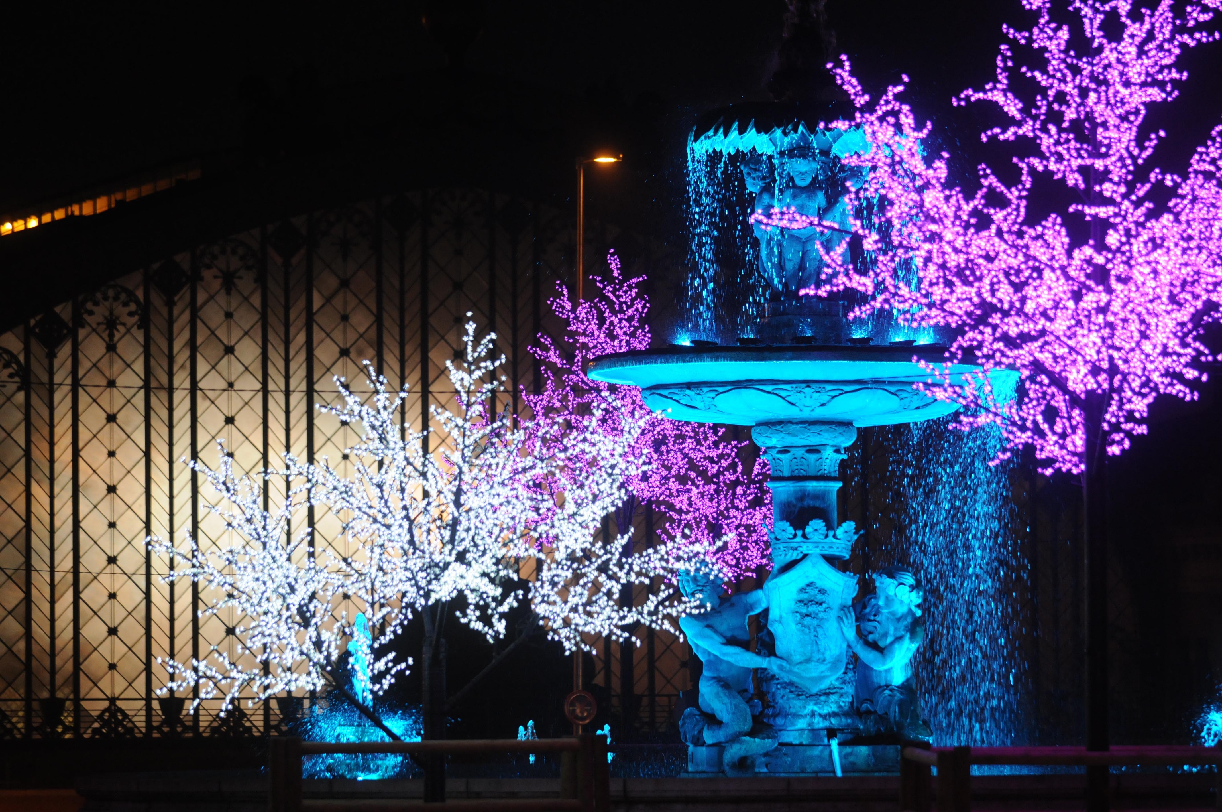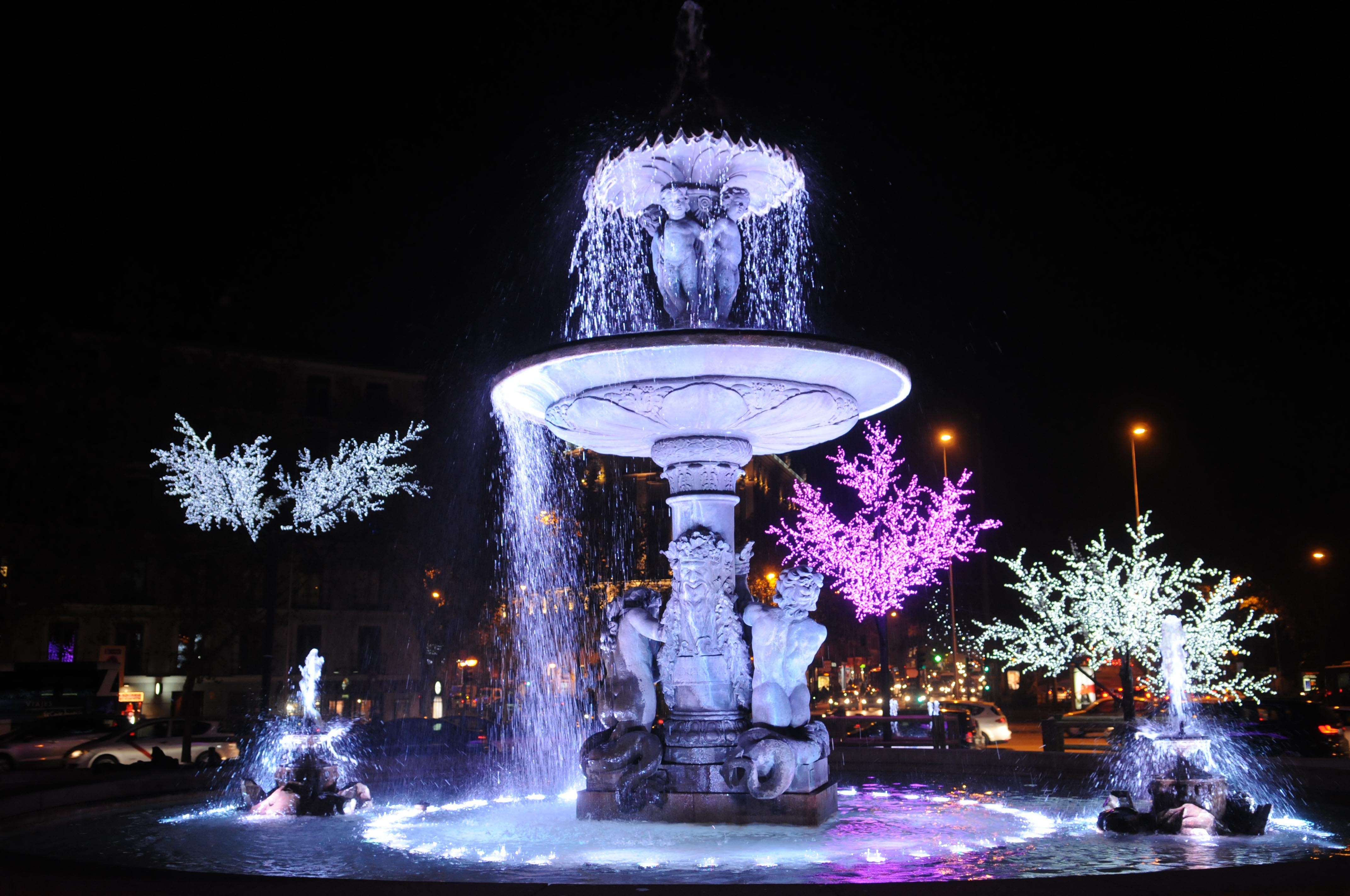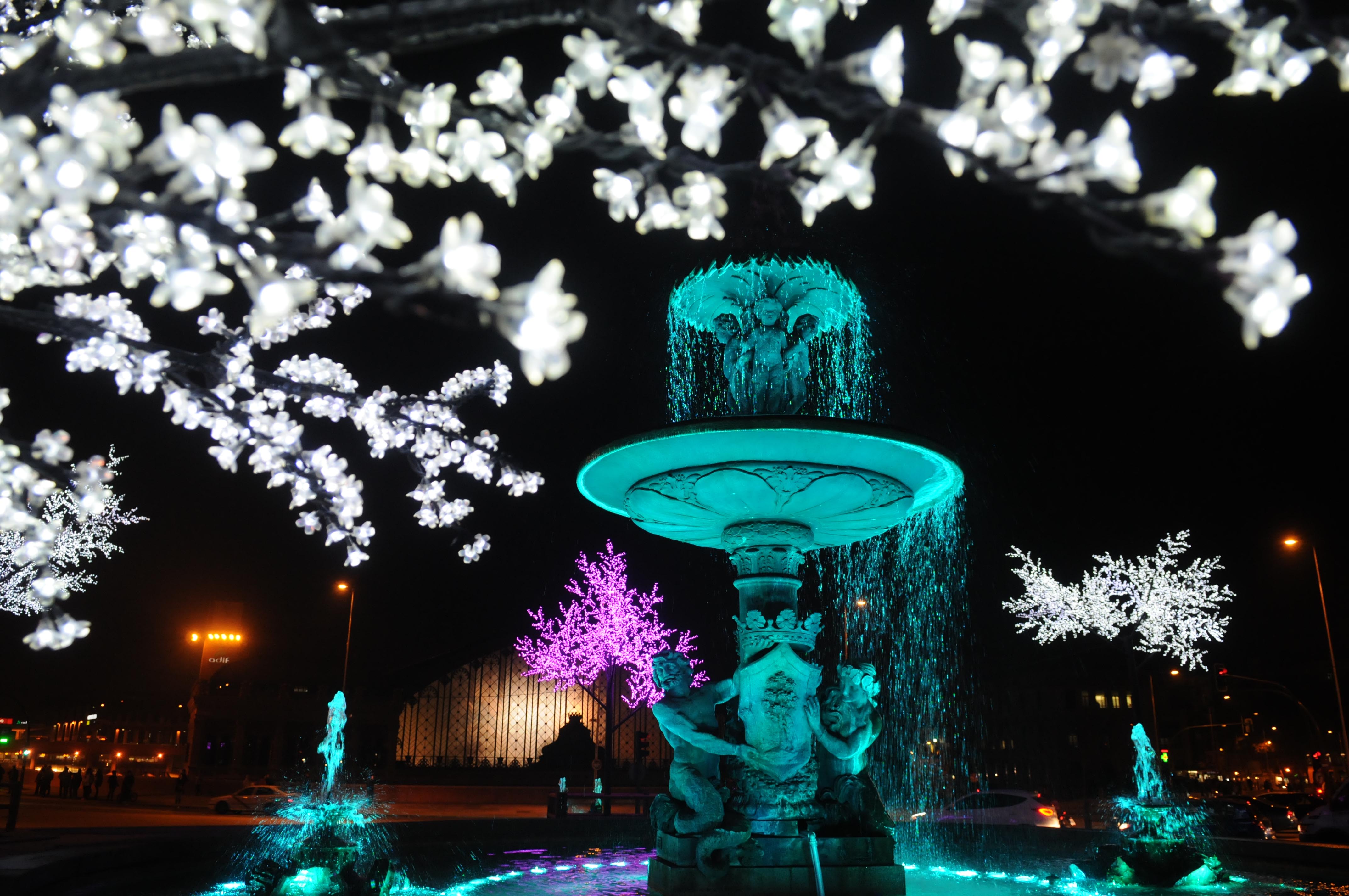 La fuente de Atocha y la situada en la glorieta de Emperador Carlos V con su nueva iluminación LED, más eficiente. El cambio forma parte del proyecto de acondicionamiento de fuentes e instalaciones hidráulicas para alcanzar un mayor ahorro energético.