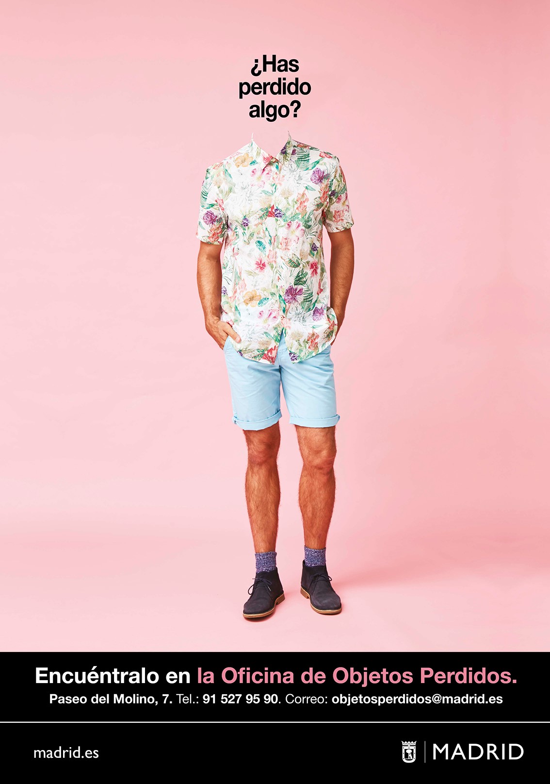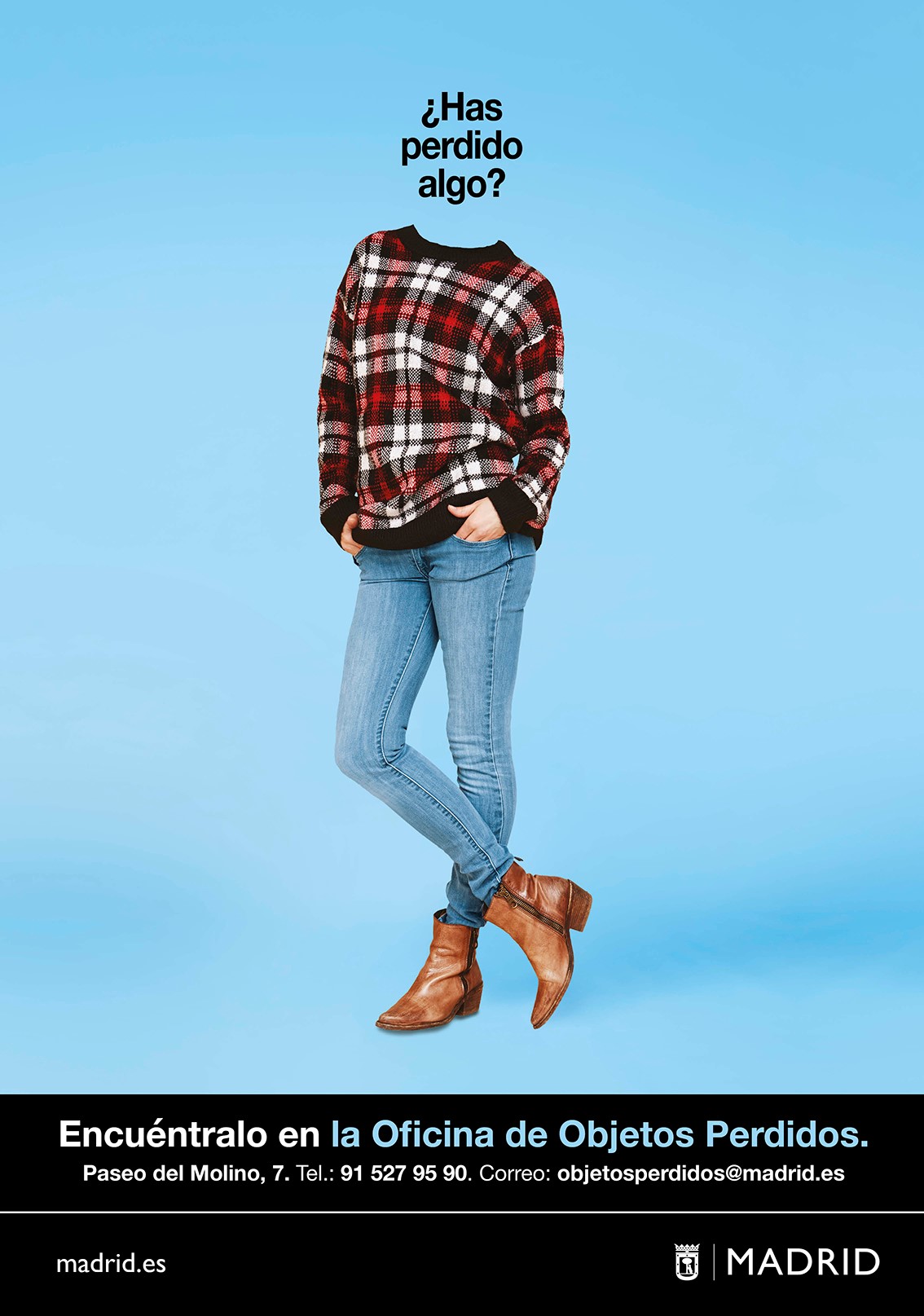 Las imágenes de un hombre y una mujer centran una nueva campaña que el Ayuntamiento de Madrid lanza a partir de este lunes en marquesinas de la ciudad. “¿Has perdido algo?” puede leerse en el lugar que deberían ocupar las cabezas de los protagonistas, “encuéntralo en la Oficina de Objetos Perdidos”, se explica después.