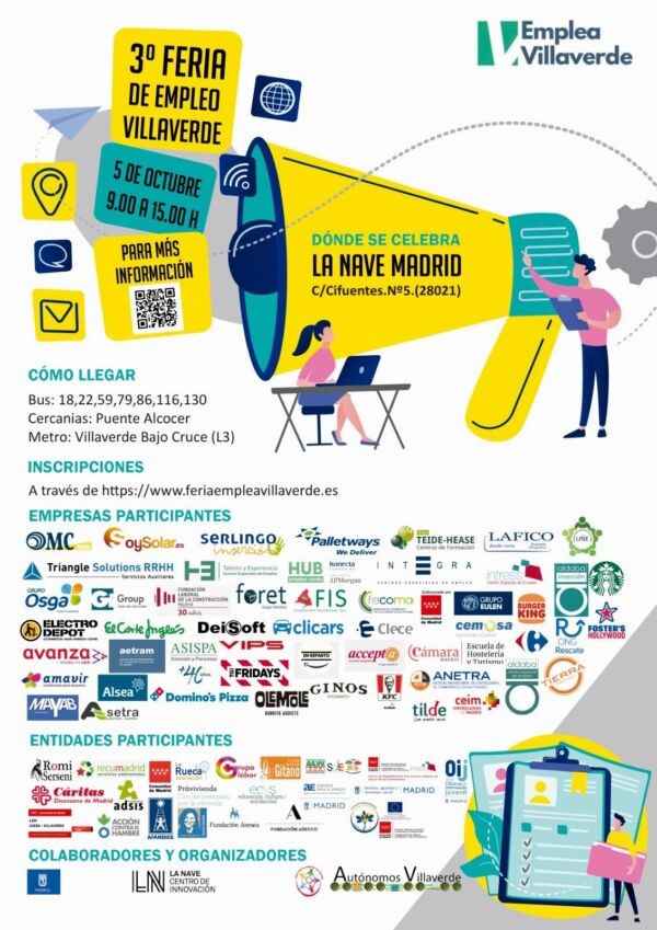 Organizada por la Asociación de Autónomos de Villaverde en colaboración con la junta municipal del distrito, la Agencia para el Empleo del Ayuntamiento de Madrid y diversas entidades de la Mesa de Empleo y Formación de Villaverde, la feria contará con la participación de numerosas compañías que tendrán la oportunidad de incorporar in situ talento a sus equipos, conociendo a personas candidatas adecuadas a los puestos de trabajo que ofertan.