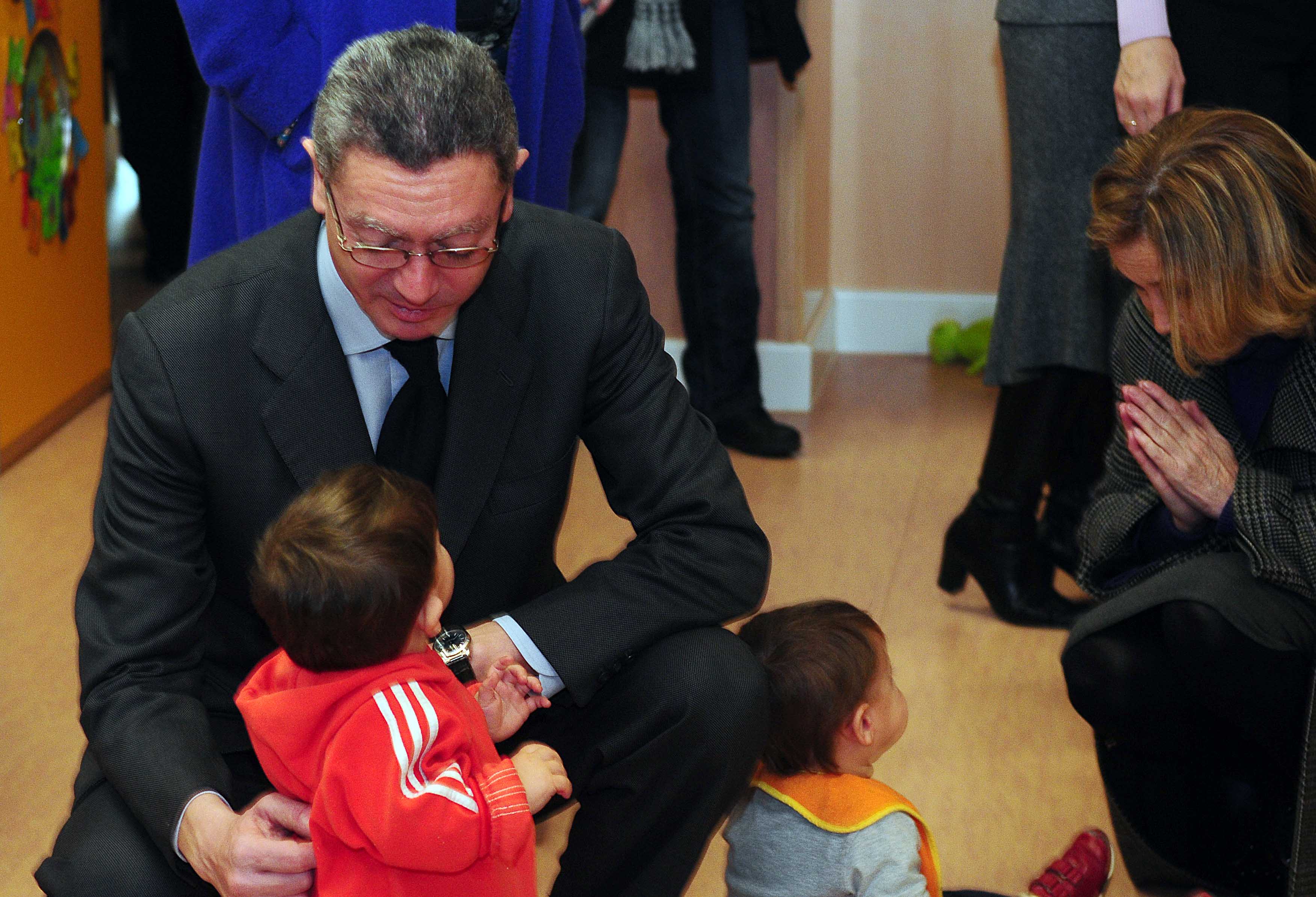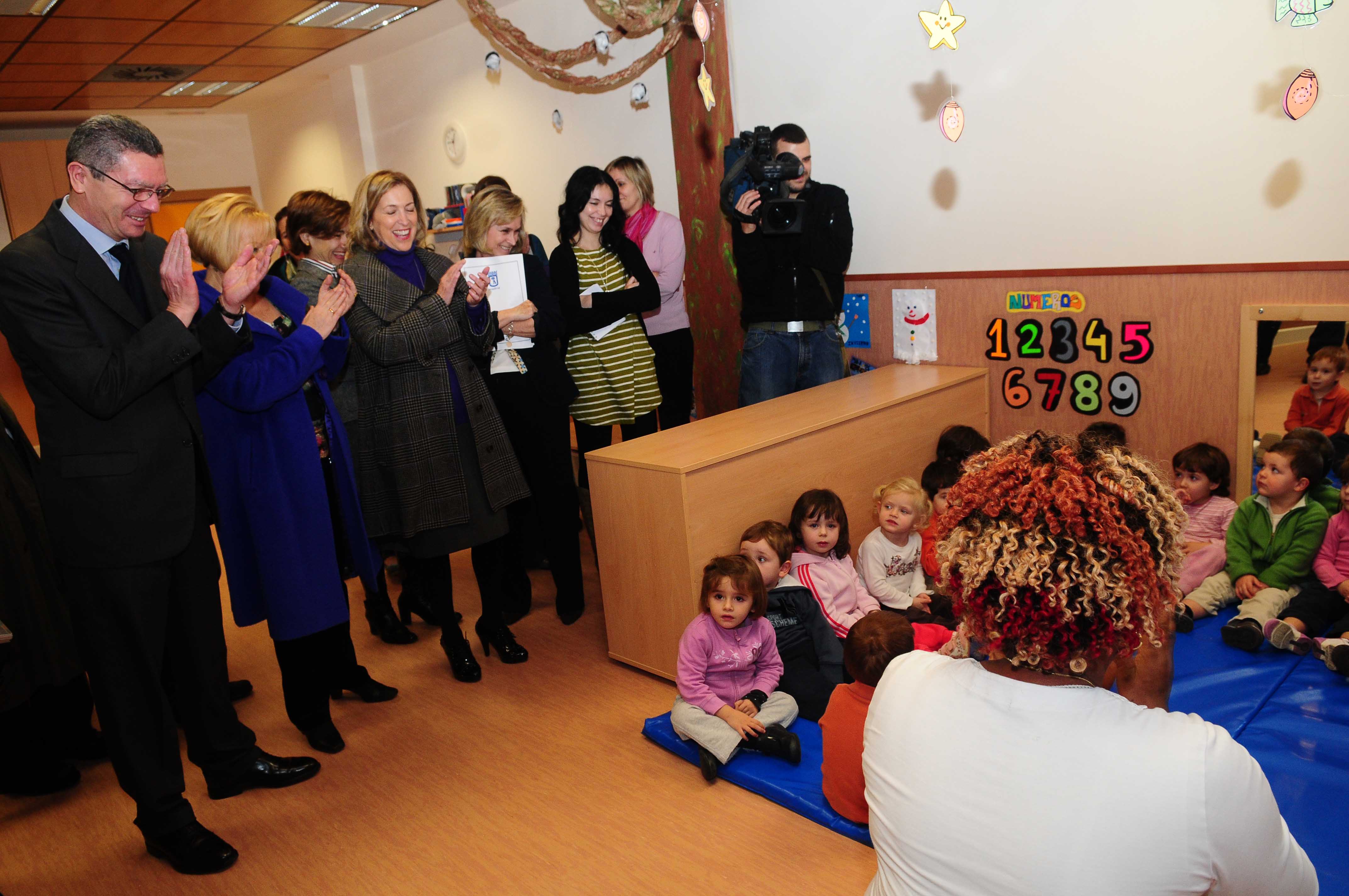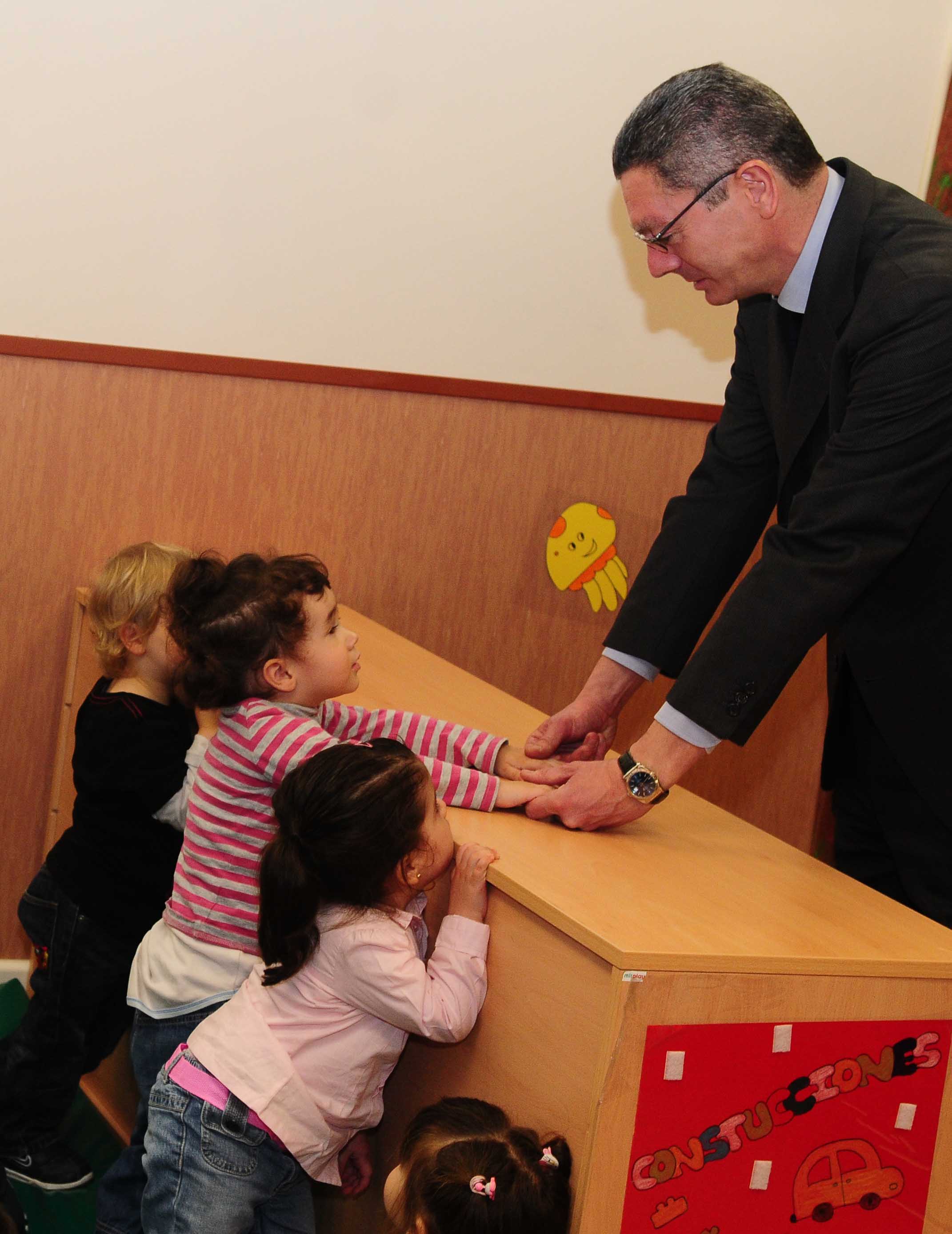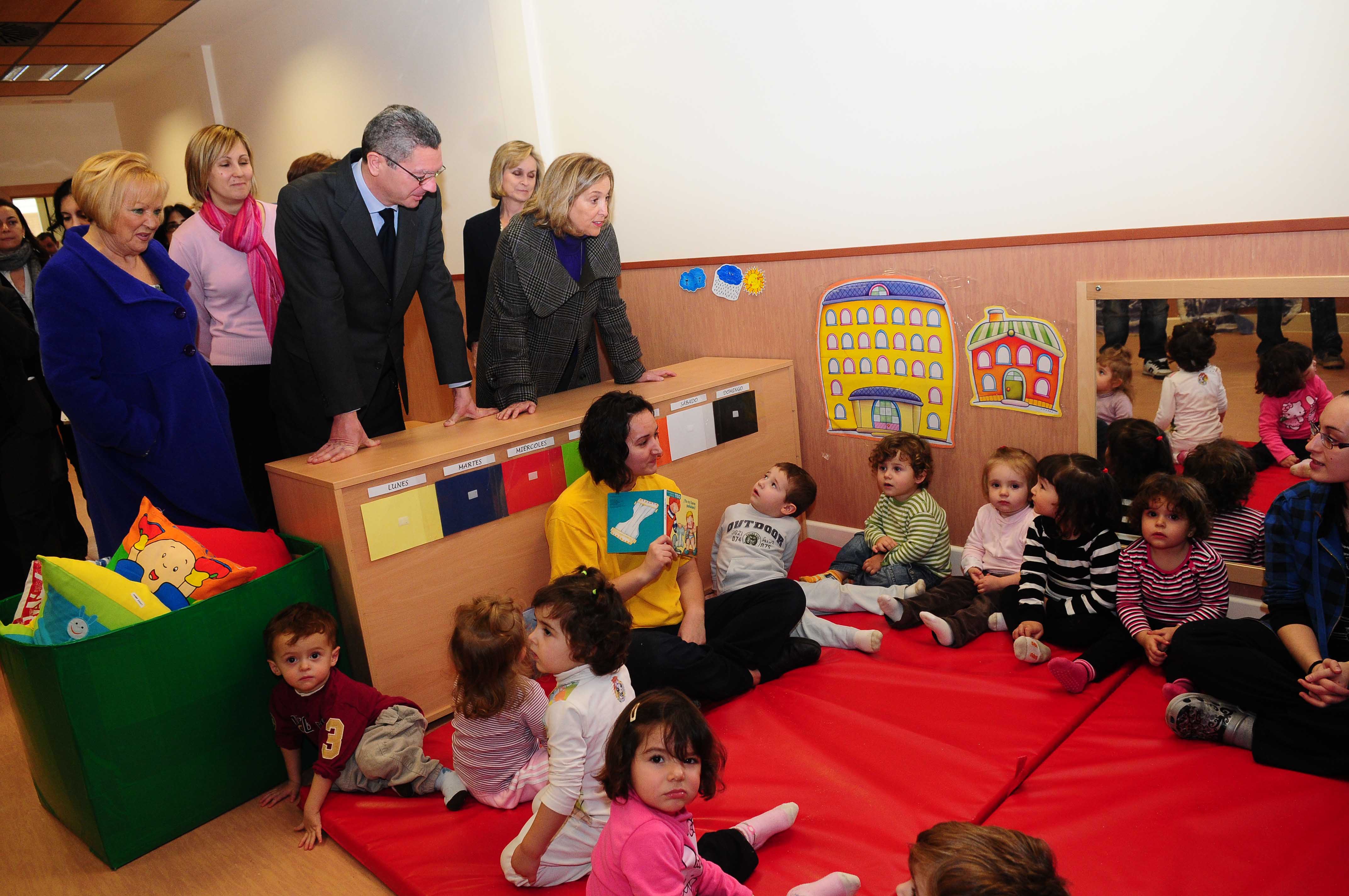 El alcalde de la Ciudad de Madrid, Alberto Ruiz-Gallardón, durante la visita que ha realizado esta mañana a la nueva escuela infantil de Vicálvaro, El Amanecer. En el recorrido por sus instalaciones ha estado acompañado por la delegada de Familia y Asuntos Sociales, Concepción Dancausa, y la concejala del distrito, Carmen Torralba.