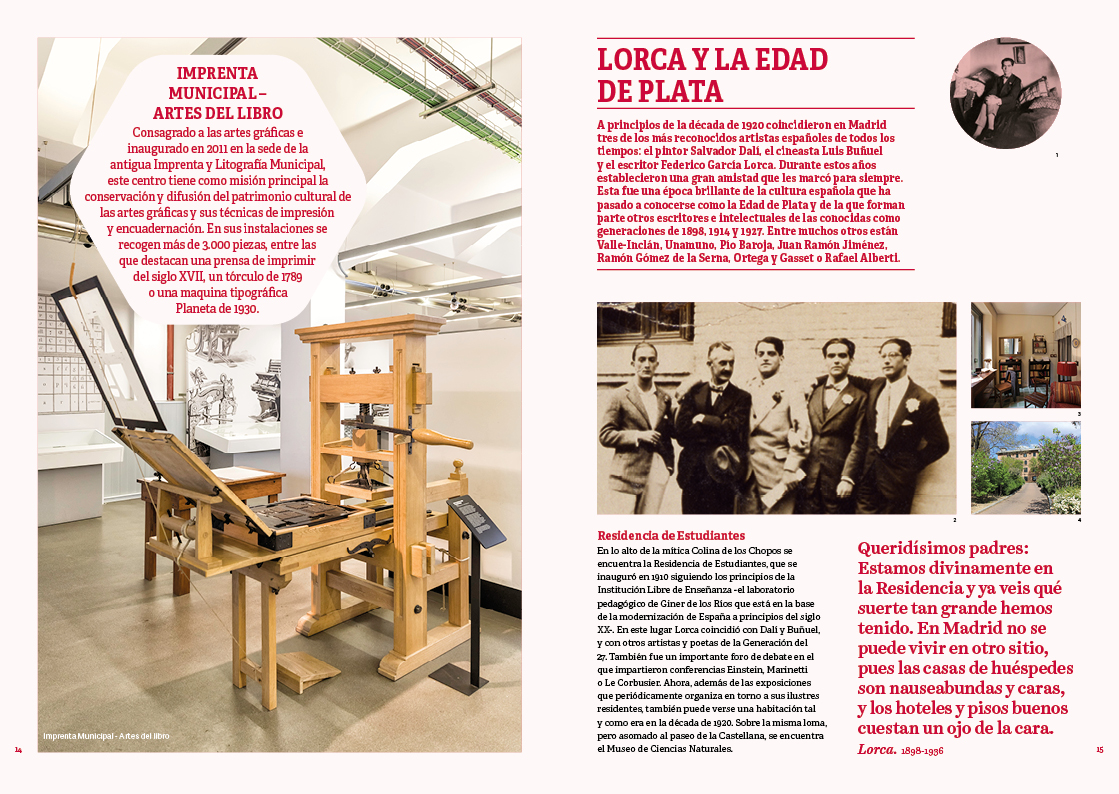 - También se hace referencia a instituciones y espacios imprescindibles, como la Biblioteca Nacional, el Instituto Cervantes, la Cuesta de Moyano o la imprenta municipal-Artes del Libro, y a las citas literarias anuales más destacadas de la ciudad de Madrid