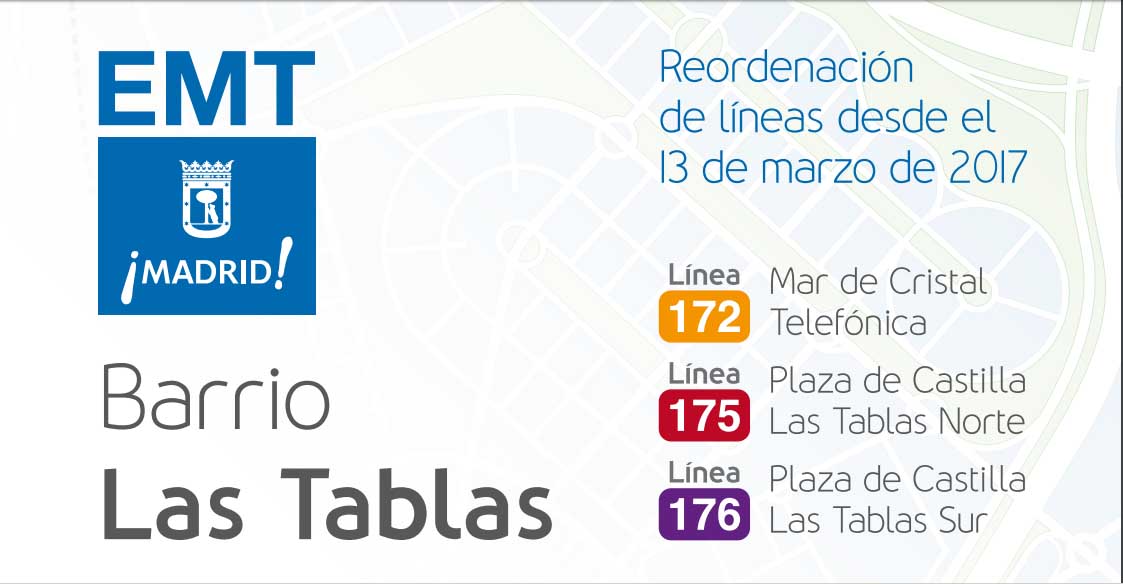 Por otra parte, las líneas 172 (Mar de Cristal-Telefónica) y 176 (Plaza de Castilla-Las Tablas) mejoran y simplifican sus recorridos para, en combinación con la línea 175, ofrecer un mejor servicio en este barrio del distrito de Fuencarral.