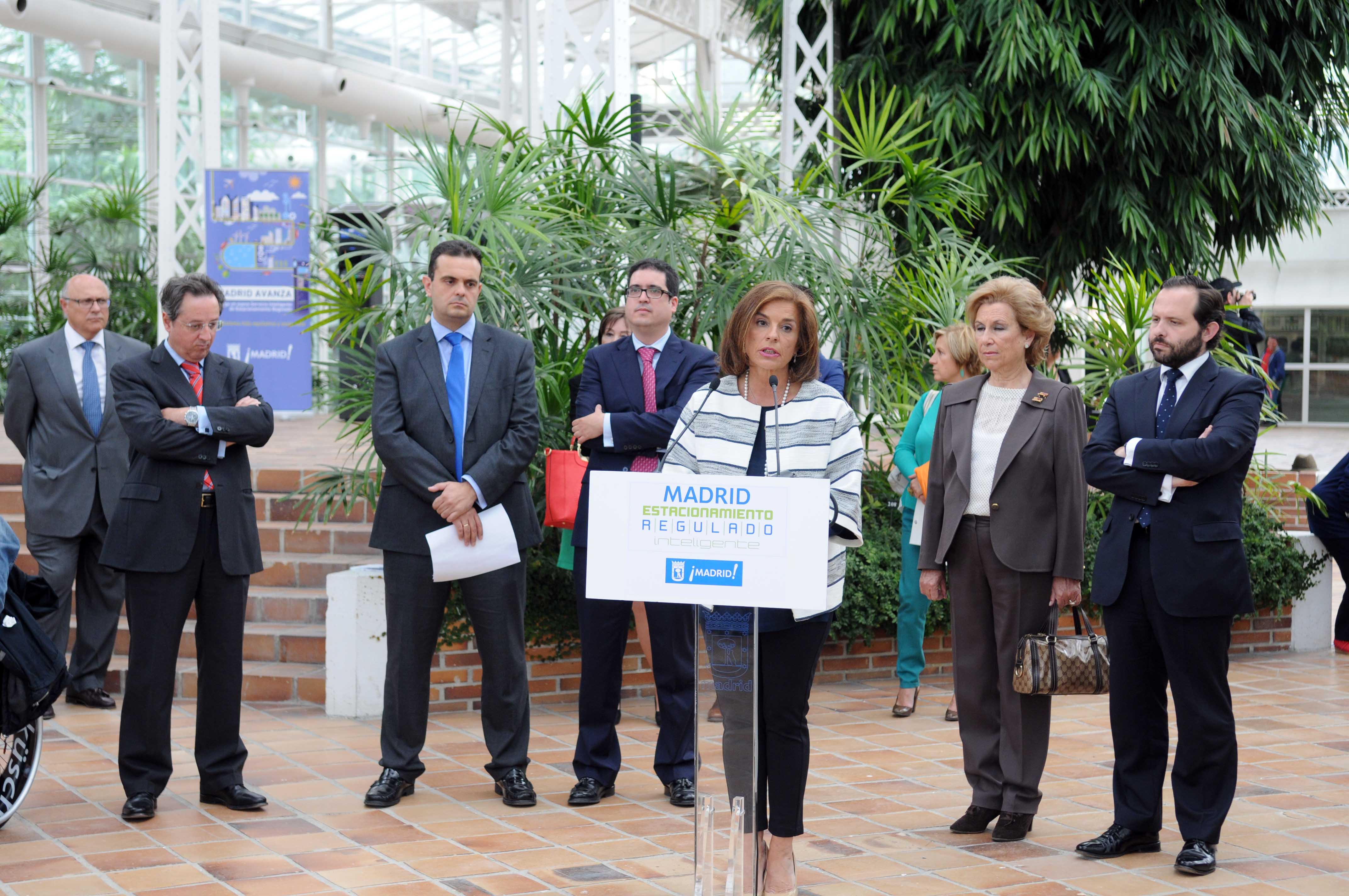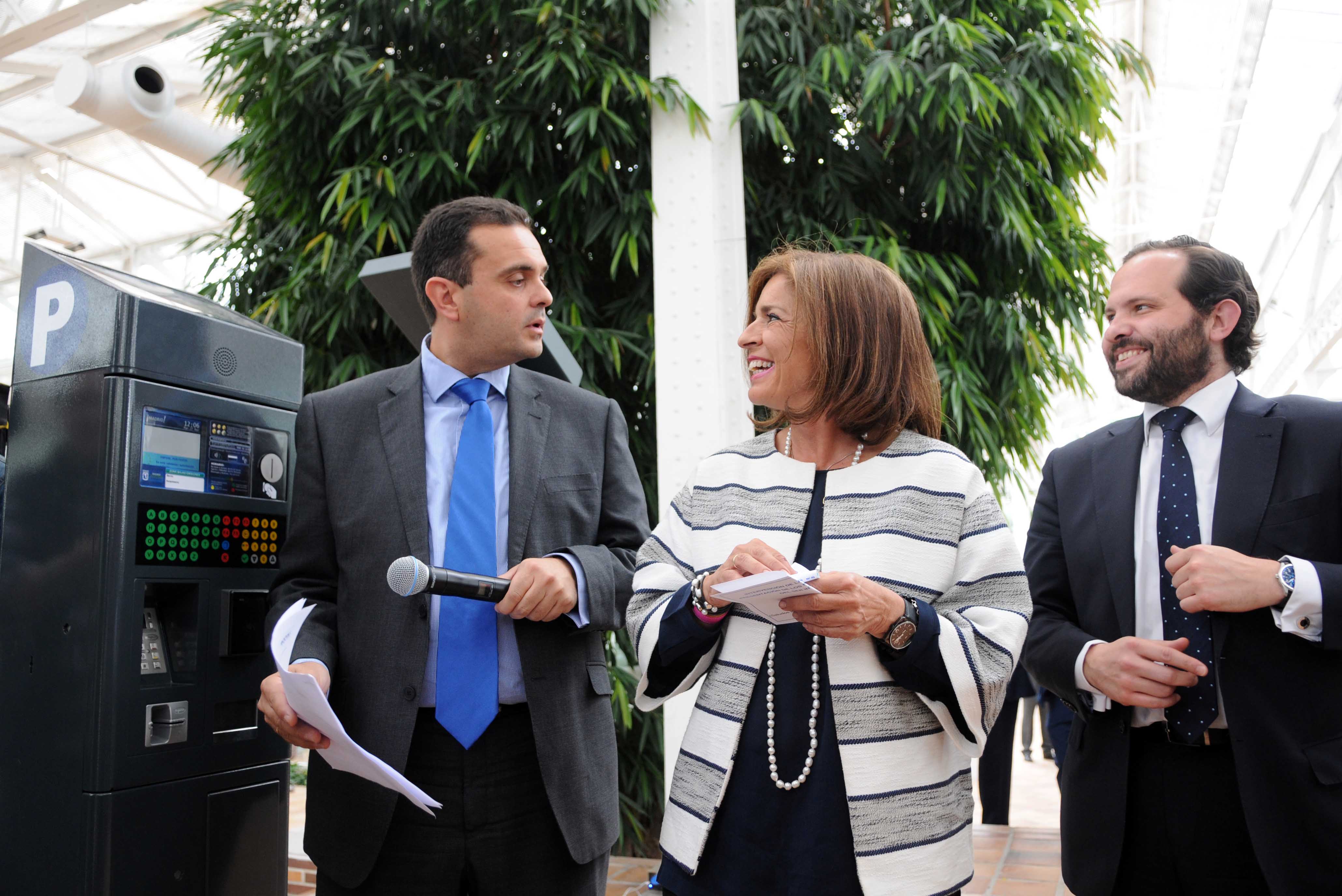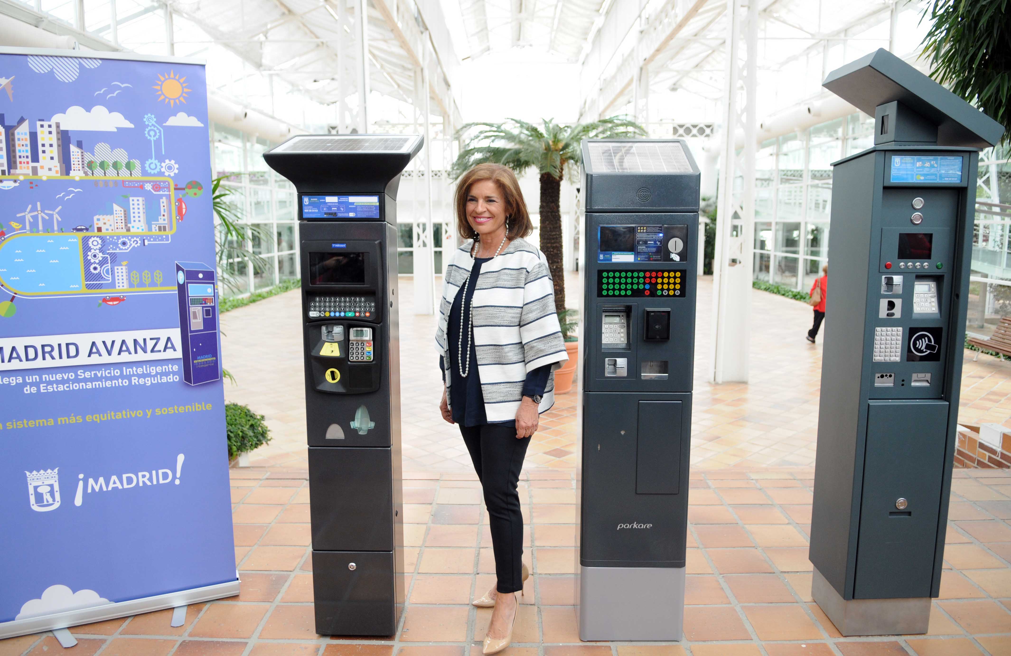 La alcaldesa de Madrid, Ana Botella, ha presentado hoy los nuevos parquímetros que ya se están instalando en la capital, que funcionarán a pleno rendimiento y con las nuevas tarifas a partir del próximo 1 de julio. El nuevo sistema operativo del SER es inteligente, pionero en el mundo y sostenible. El acto ha tenido lugar en el Palacio de Cristal (Invernadero) de Arganzuela, y al mismo han asistido, entre otros, el delegado de Medio Ambiente y Movilidad, Diego Sanjuanbenito, y la concejal-presidente de la Junta Municipal del distrito, Carmen Rodríguez Flores./