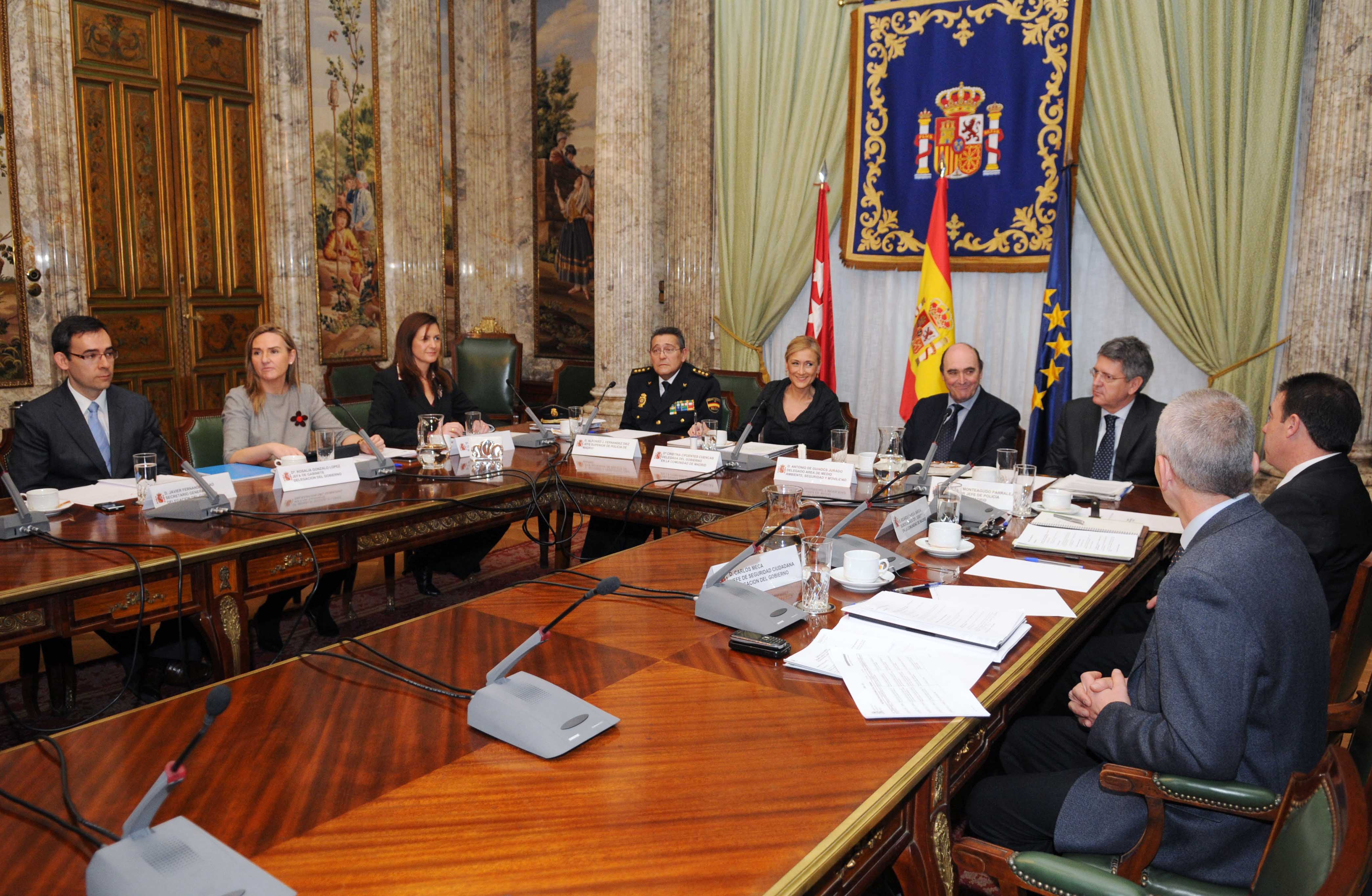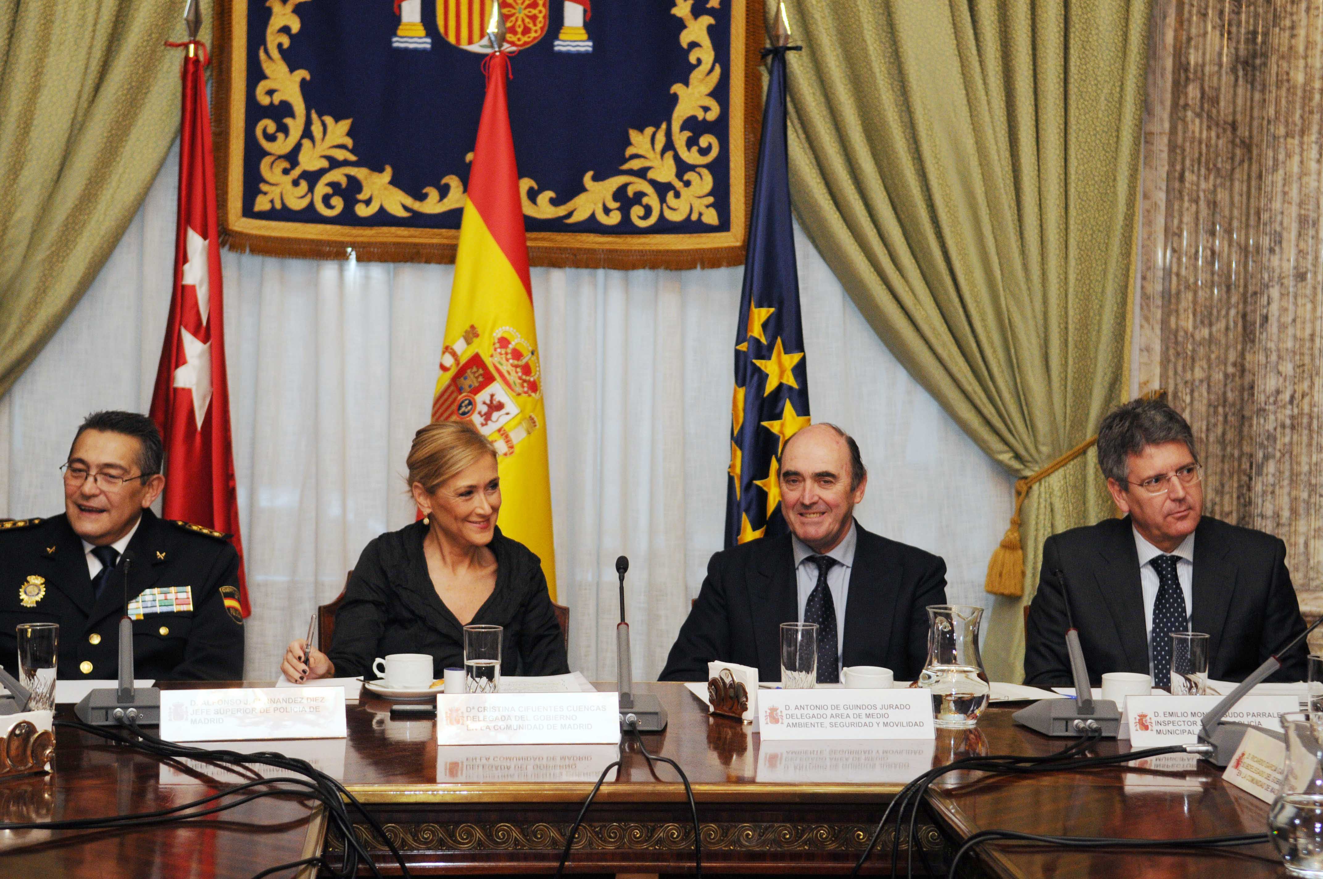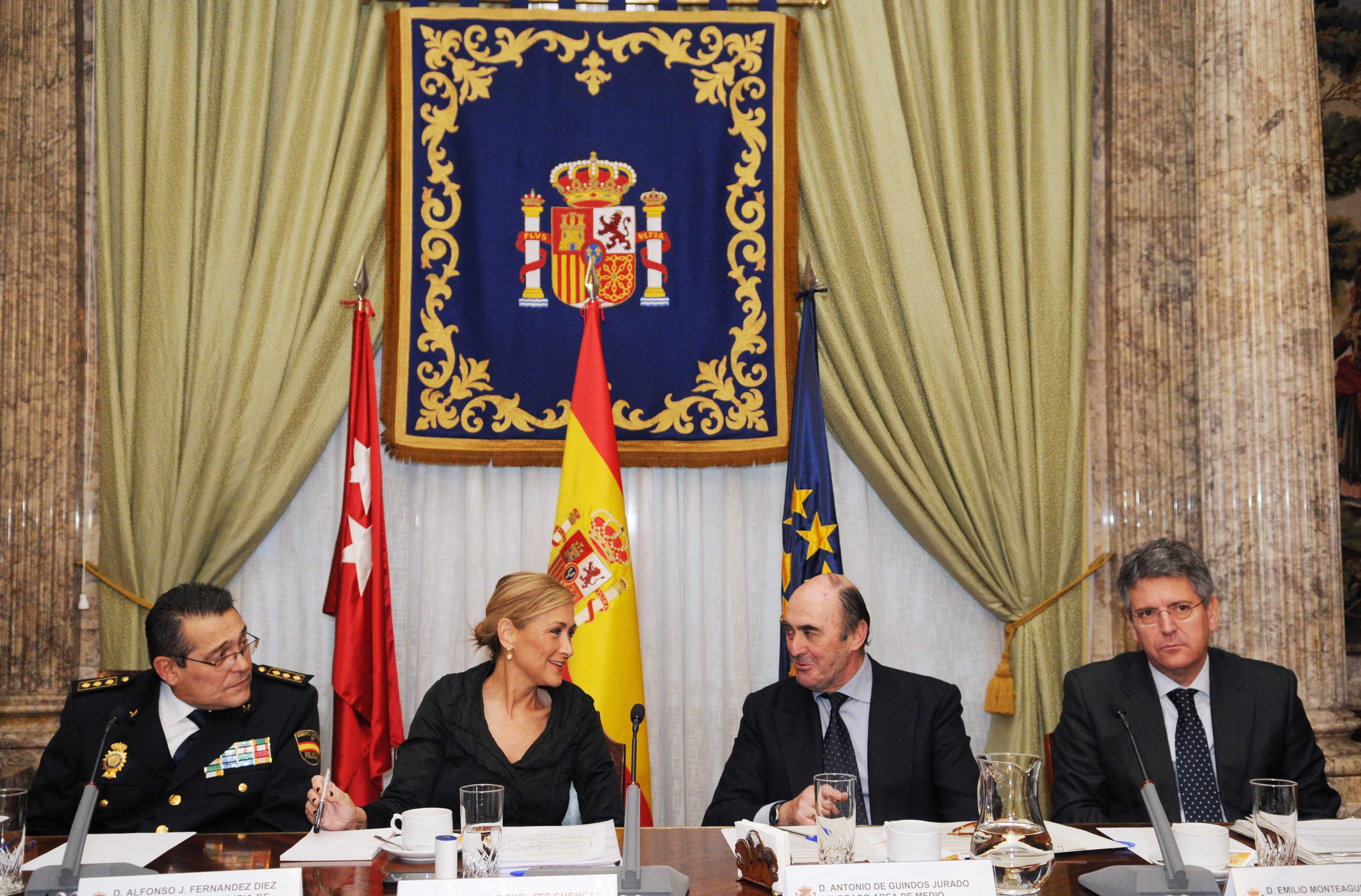 Incrementar la coordinación y colaboración entre las Fuerzas de Seguridad que operan en la ciudad para mejorar en materia de seguridad “y también en temas de protección civil” es el objetivo que se han marcado el delegado de Medio Ambiente, Seguridad y Movilidad, Antonio de Guindos, y la delegada del Gobierno en Madrid, Cristina Cifuentes, en su primera reunión, mantenida esta mañana en la sede de la Delegación del Gobierno, en la que ha presidido un estrecho "espíritu de colaboración". Con ese fin se celebrará una reunión semanal entre los mandos de las distintas administraciones, reuniones que se empezarán a llevar a cabo en los próximos días, según anunciaron. El Plan Nevadas, “que aunque ha venido funcionando adecuadamente, es necesario siempre poner al día”; la Patrulla Verde municipal y los Agentes Tutores –policías municipales que vigilan las zonas aledañas a los colegios– han sido otros temas tratados. También se abordó, en palabras de De Guindos, “la posibilidad de poner en marcha patrullas conjuntas para resolver temas de ruidos en la ciudad y, además, de algunas funciones que vienen ejerciendo agentes de la policía municipal que se podrían clasificar de "policía judicial". De Guindos no dejó pasar el momento para recordar que “es una petición personal de la alcaldesa que la Policía se note cercana al ciudadano para que éstos se puedan sentir más seguros y libres”./