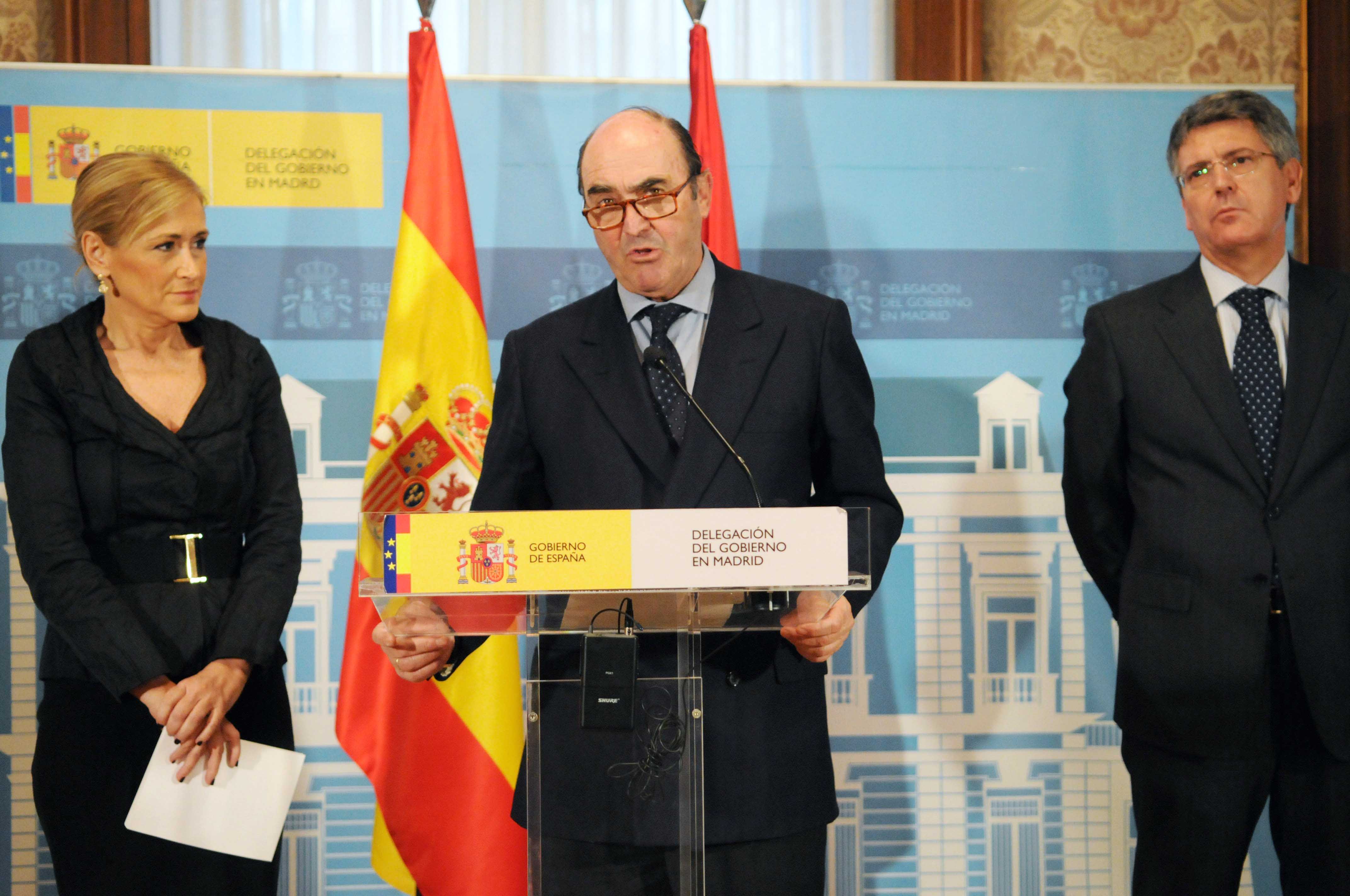 Imágenes del delegado de Medio Ambiente, Seguridad y Movilidad, Antonio de Guindos, y la delegada del Gobierno en Madrid, Cristina Cifuentes, durante la reunión que han mantenido esta mañana en la Delegación del Gobierno y su posterior comparecencia ante los medios de comunicación.