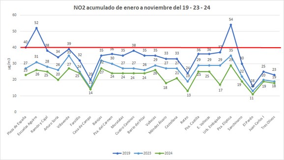 El delegado de Urbanismo, Medio Ambiente y Movilidad, Borja Carabante, ha informado este jueves a la Junta de Gobierno que el mes de noviembre pasa a la historia por cerrar con los registros de dióxido de nitrógeno (NO2) más bajos de toda la serie. Las estaciones se situaron por debajo de 29 μg/m3 (el límite actual que marca Europa es de 40 μg/m3) y nueve estaciones de las 24 cumplirían con la nueva directiva europea que se aplicará a partir de 2030, que establece un máximo de 20 μg/m3. En el año 2019, 23 de las 24 estaciones se situaban por encima de esta cifra.