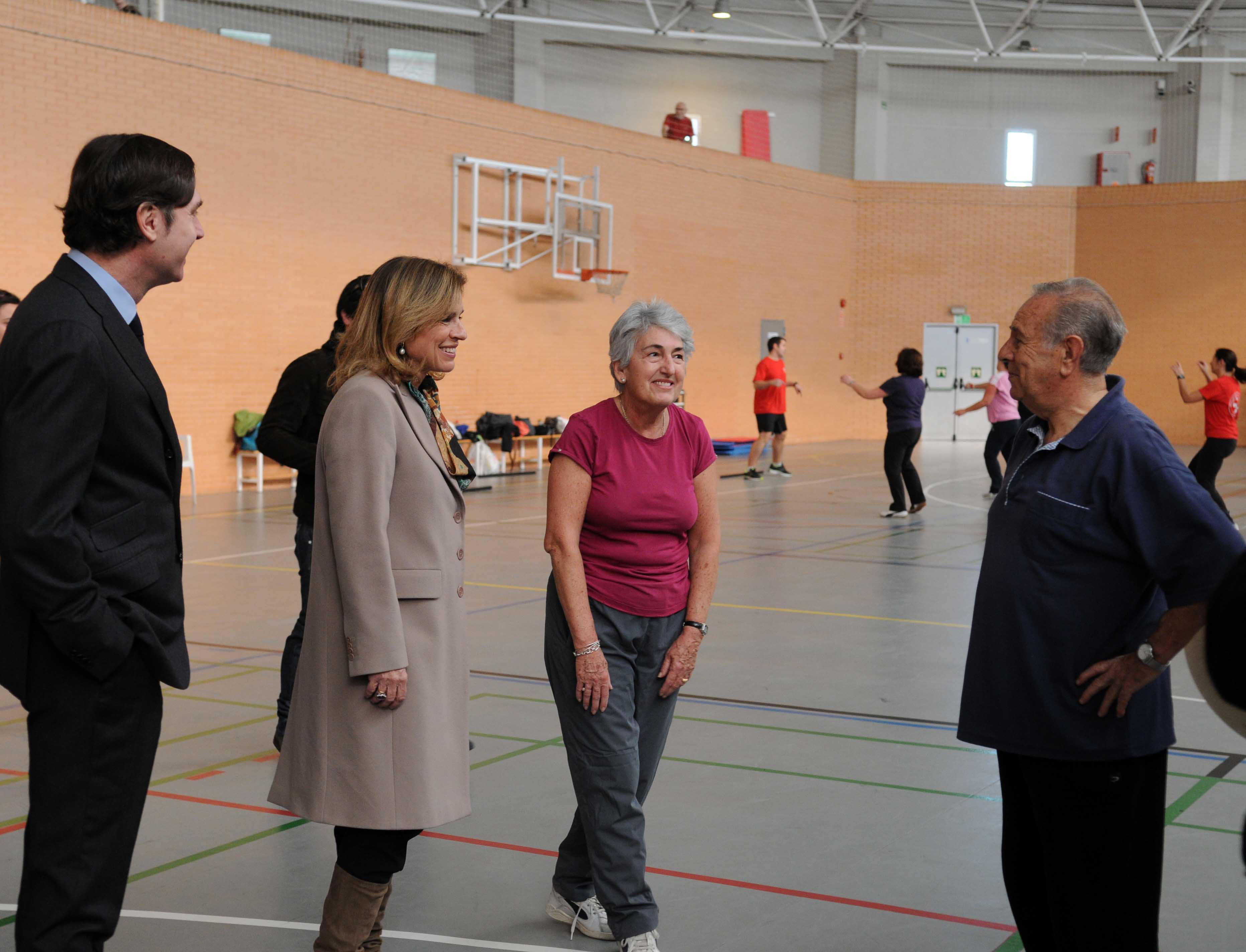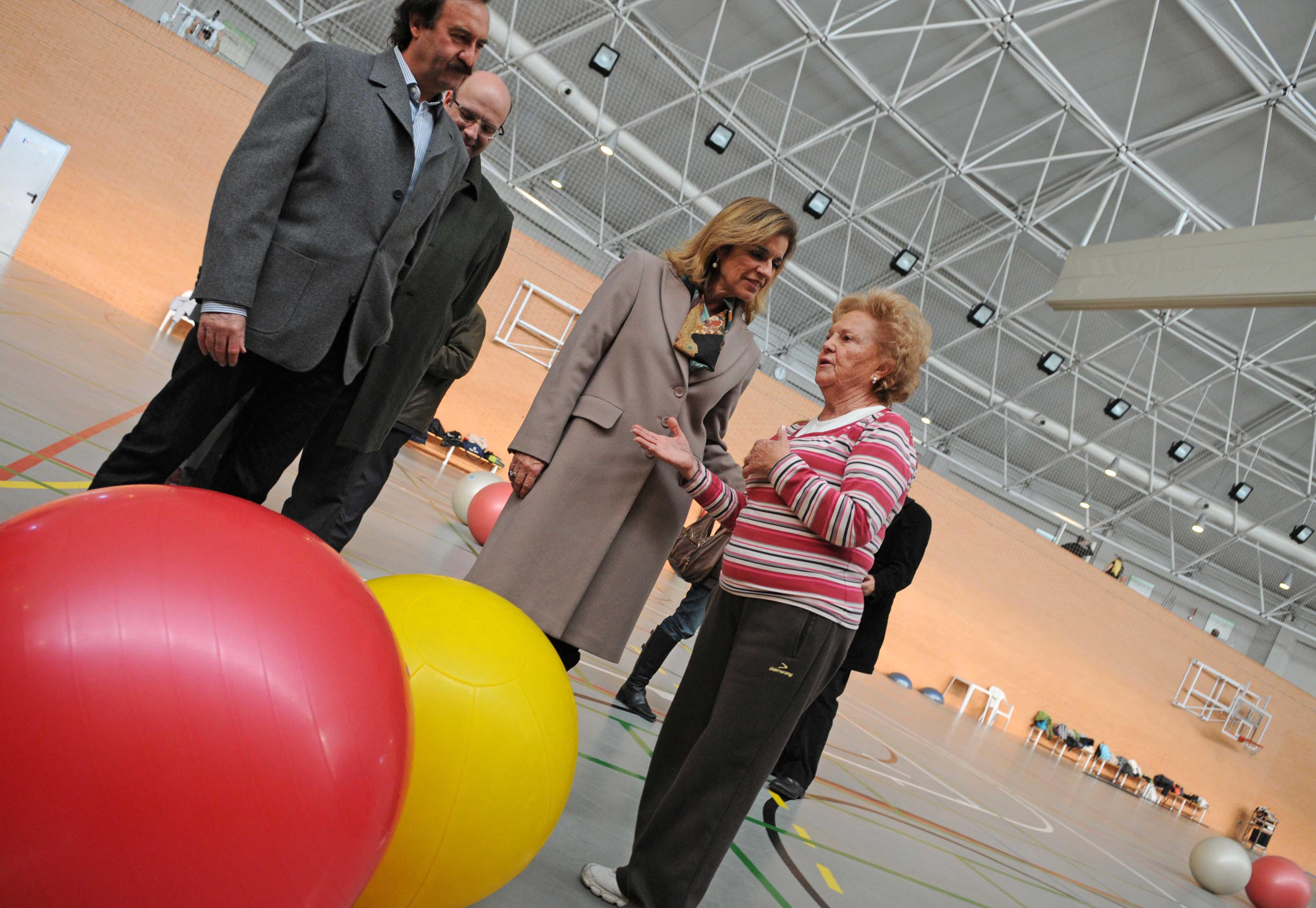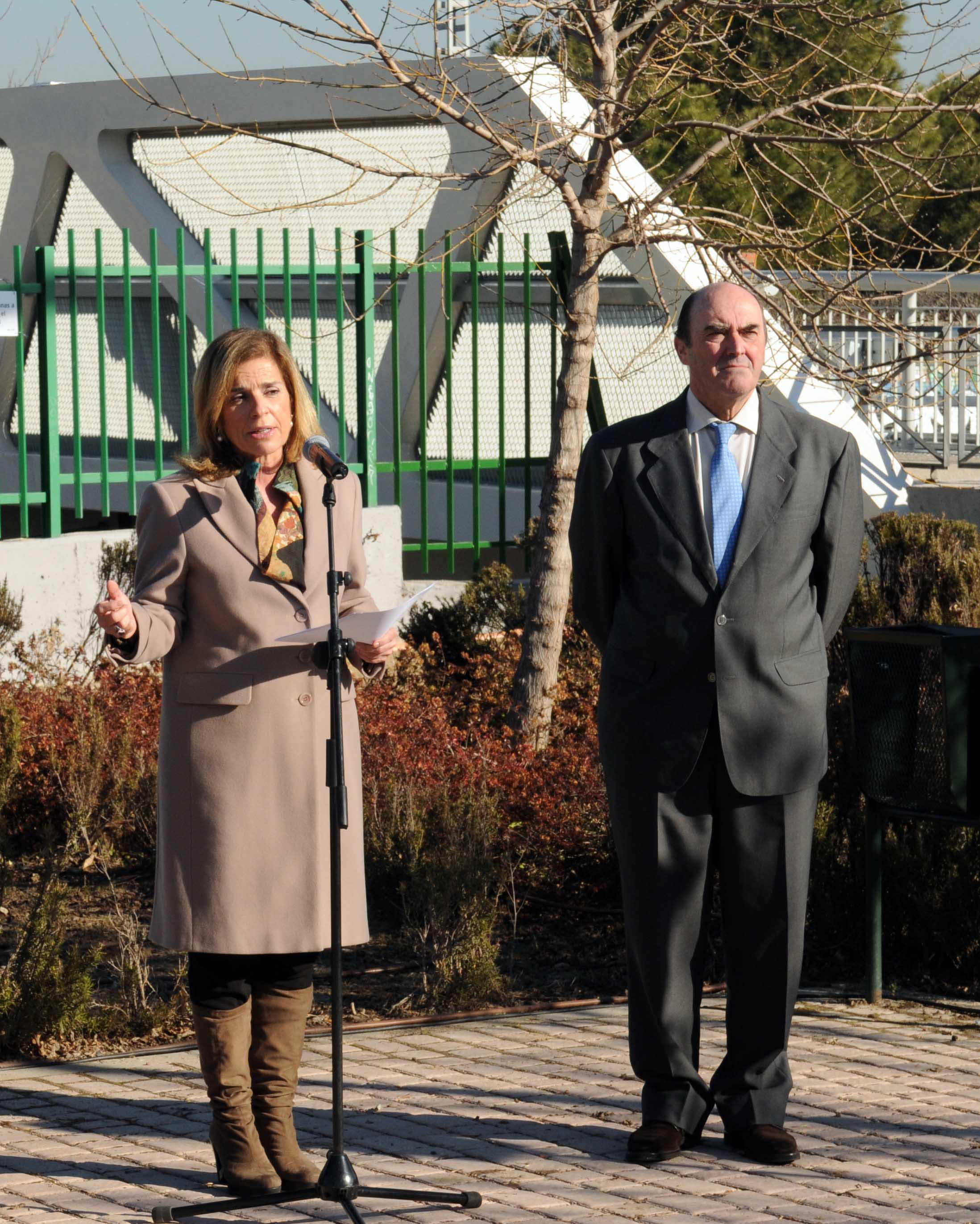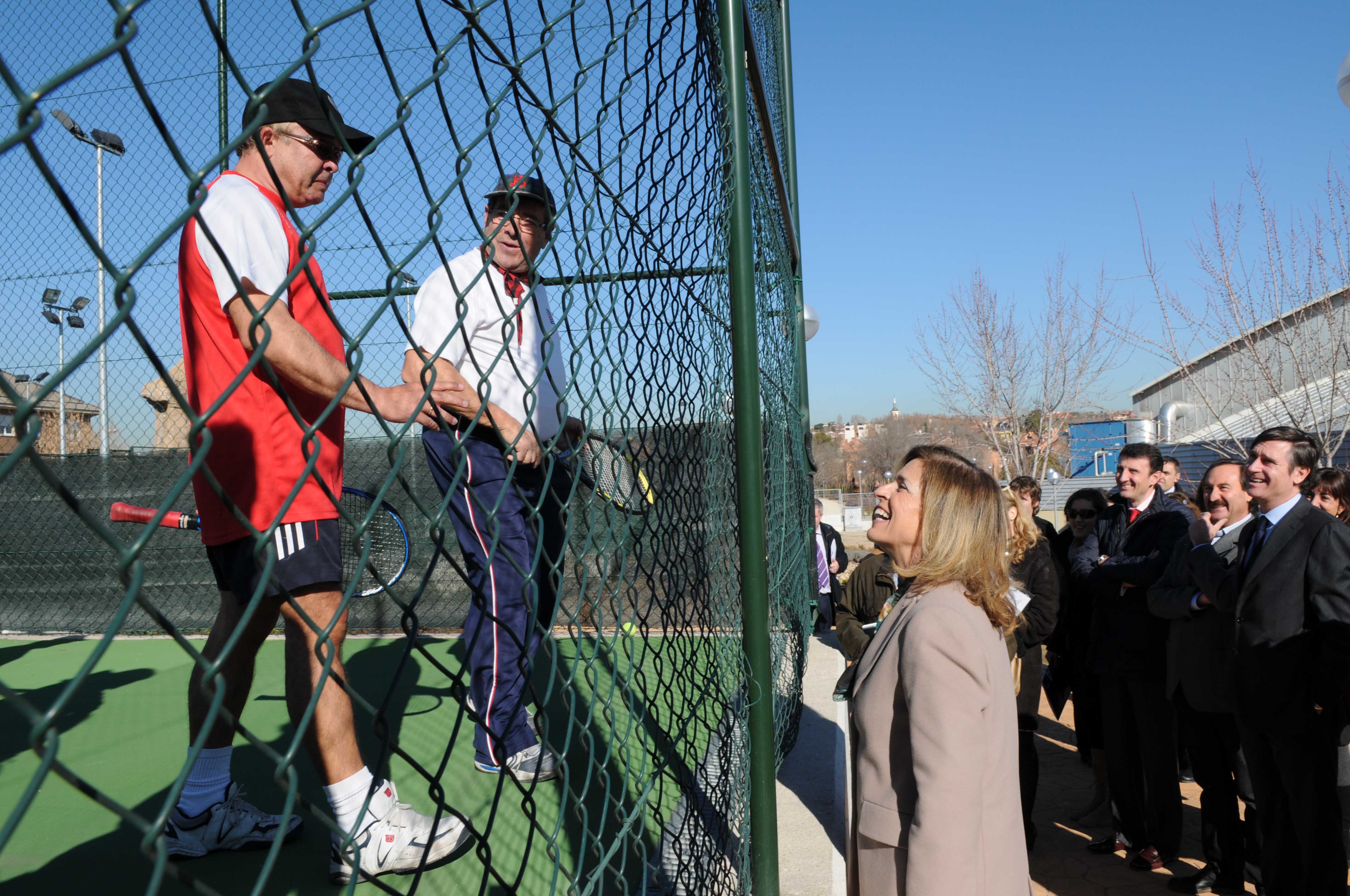 La alcaldesa de Madrid, Ana Botella, acompañada por el delegado del Área de Medio Ambiente, Movilidad y Seguridad, Antonio de Guindos, y el concejal del distrito de Moncloa-Aravaca, Álvaro Ballarín, ha inaugurado la pasarela peatonal sobre la vía férrea Madrid-Hendaya, en Aravaca. A continuación, la alcaldesa, acompañada por Álvaro Ballarín y el jefe de Deportes de este distrito, han hecho un recorrido por las diversas instalaciones del Centro Deportivo Alfredo Goyeneche -polideportivo, piscina cubierta y pistas de tenis- donde la alcaldesa ha charlado animadamente con algunos de los vecinos que practicaban deporte en ese momento.