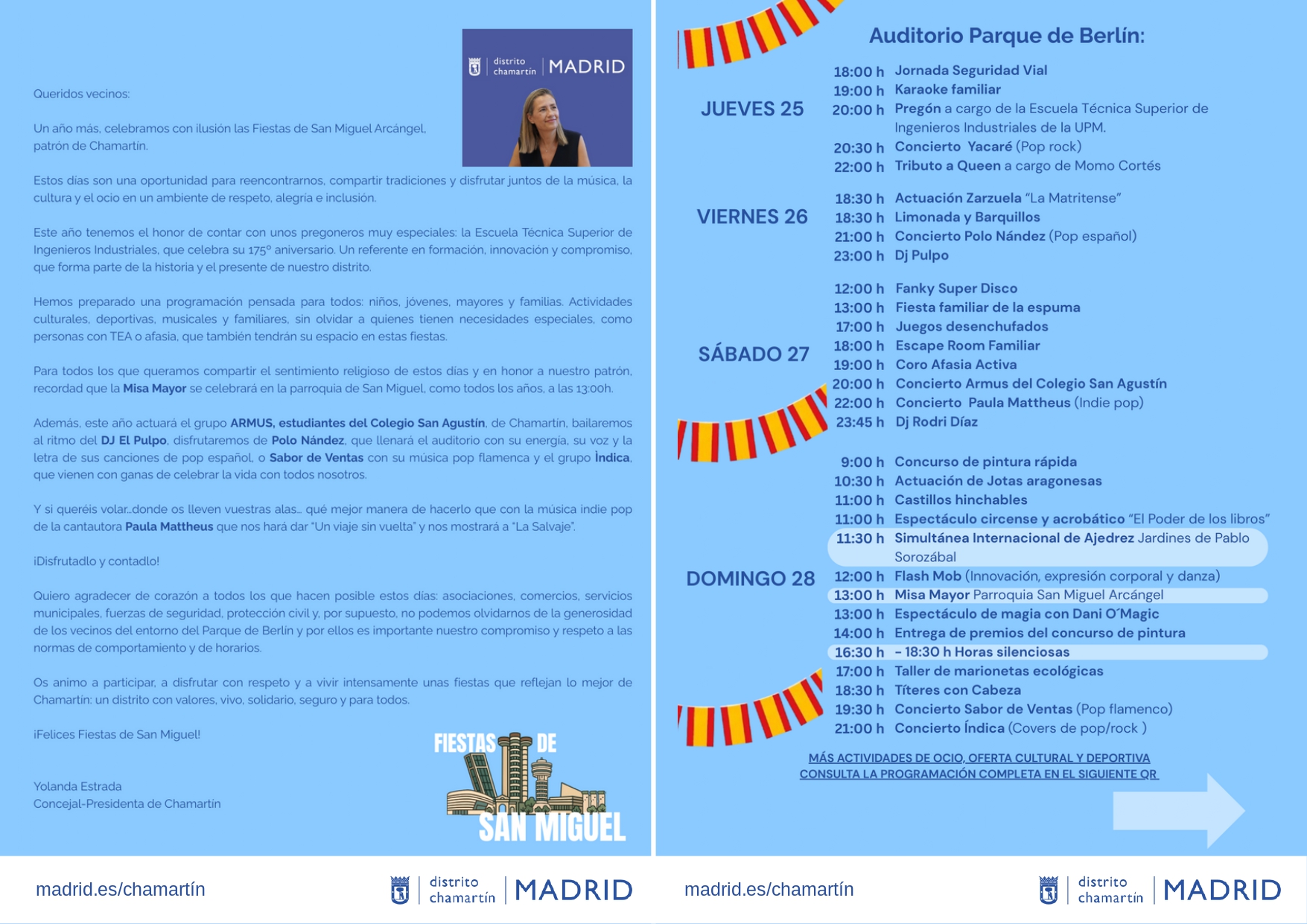 Chamartín celebrará las Fiestas de San Miguel 2025 del 25 al 28 de septiembre. El pregón, el jueves a las 20:00 h, correrá a cargo de Sergio Domínguez, director de la Escuela Técnica Superior de Ingenieros Industriales de la Universidad Politécnica de Madrid, acompañado de representantes del equipo técnico y del alumnado de la institución académica, que celebra el 175º aniversario de la profesión. La concejala Yolanda Estrada ha definido a la escuela como “un motor de conocimiento, investigación e innovación y un referente académico y humano que, desde Chamartín, proyecta su excelencia a nivel nacional e internacional desde hace casi 120 años”.