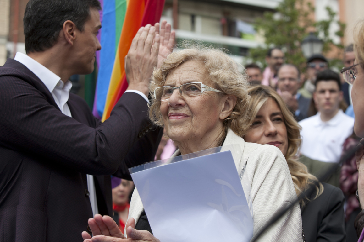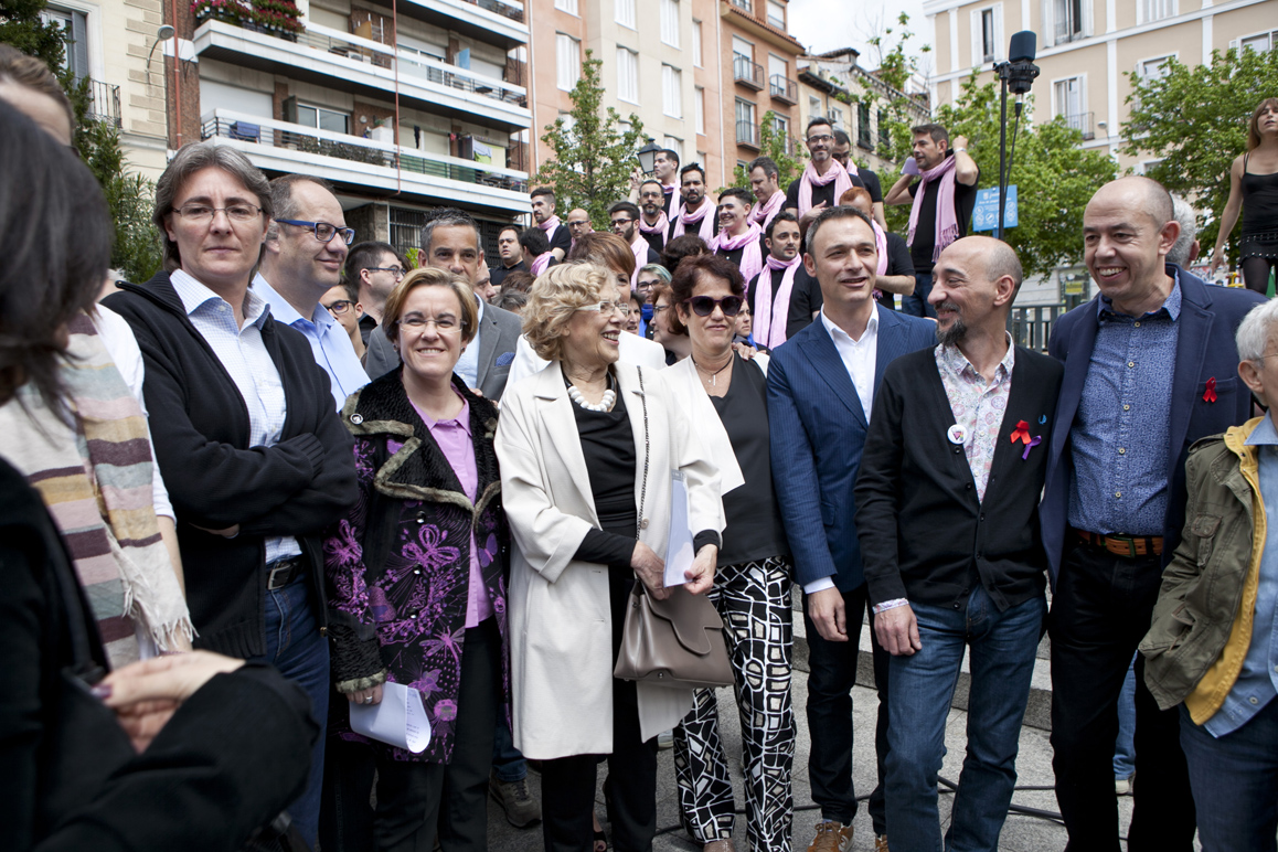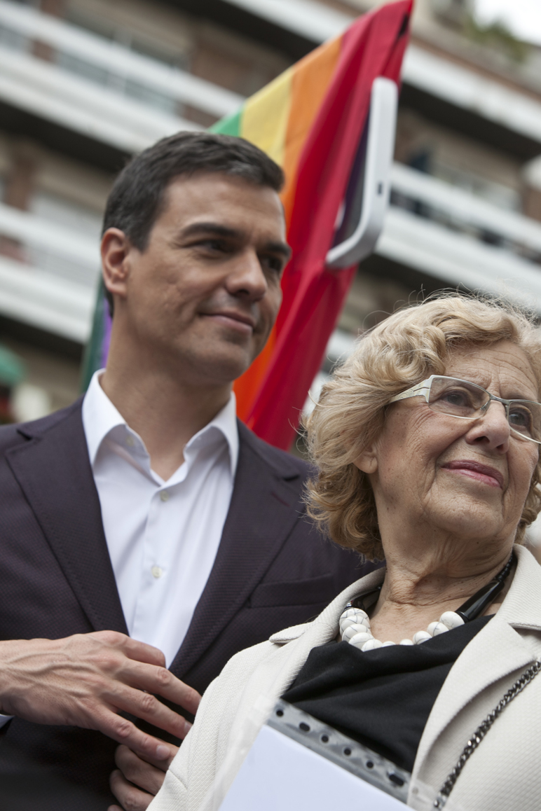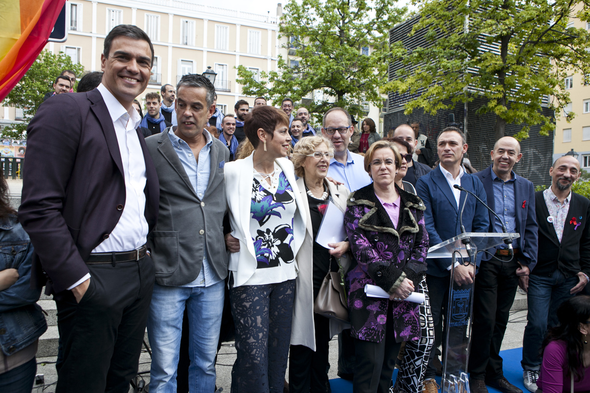 En las imágenes, la alcaldesa de Madrid, Manuela Carmena; el secretario general del PSOE, Pedro Sánchez; la portavoz del grupo municipal socialista, Purificación Causapié, además del presidente de COGAM, Jesús Grande; el presidente de FELGTB, Jesús Ganarelo, y el viudo de Pedro Zerolo, Jesús Santos.