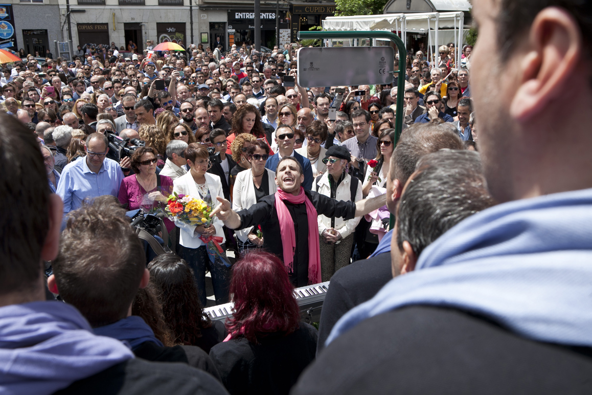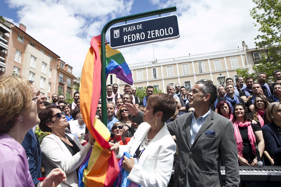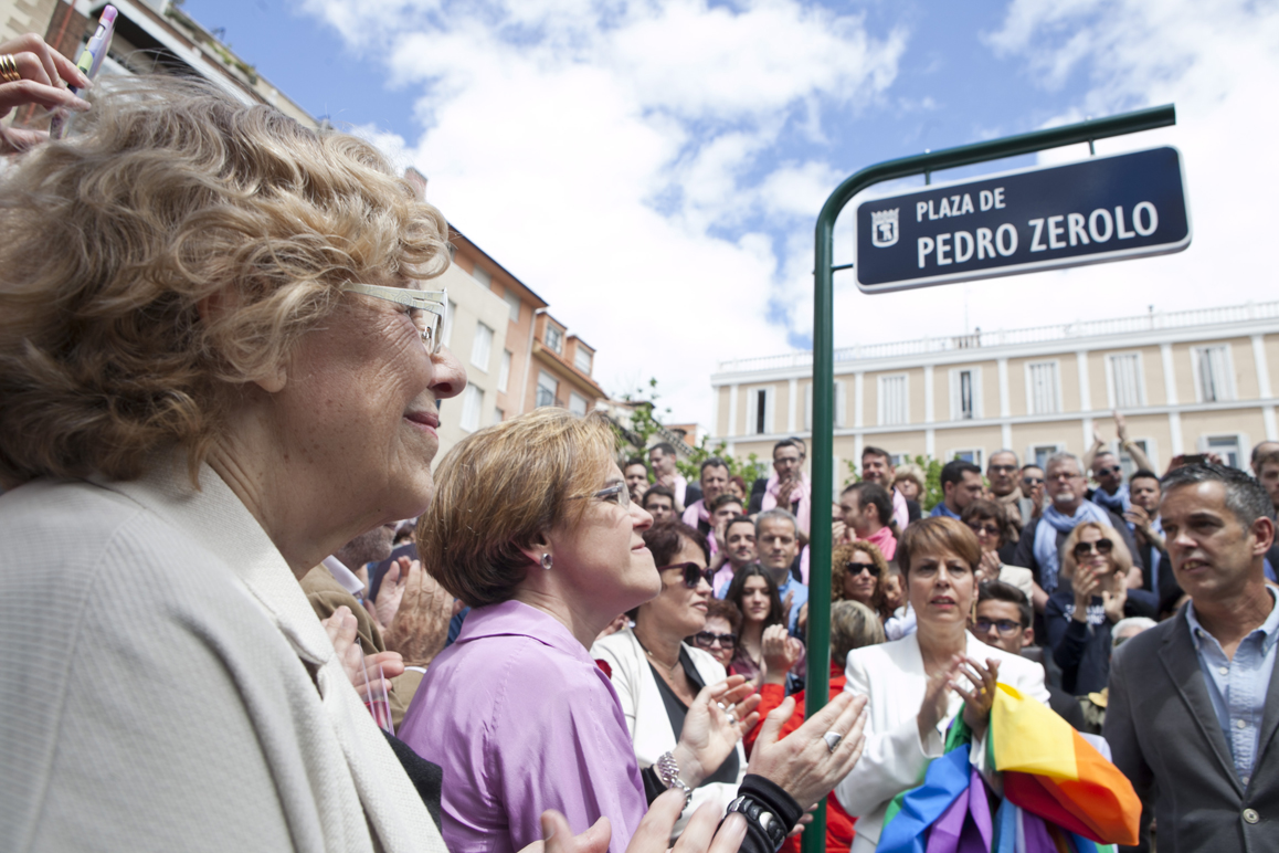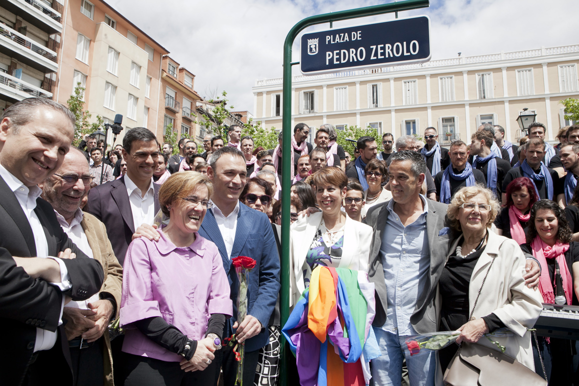 Cuando está a punto de cumplirse un año de su muerte, Pedro Zerolo ha recibido un merecido homenaje de la ciudad de Madrid. Desde hoy la plaza de Vázquez de Mella pasa a llamarse plaza de Pedro Zerolo, en cumplimiento del acuerdo plenario de julio de 2015. La alcaldesa de Madrid, Manuela Carmena; la portavoz del grupo municipal socialista, Purificación Causapié; el viudo del político, Jesús Santos; así como la delegada de Cultura y Deportes, Celia Mayer, y el concejal del distrito Centro, Jorge García Castaño, así como representantes del colectivo LGTB, familiares, amigos y ciudadanos han asistido al acto celebrado hoy en el que, tras descorrer una bandera del arcoíris, se ha descubierto la placa “plaza de Pedro Zerolo”.