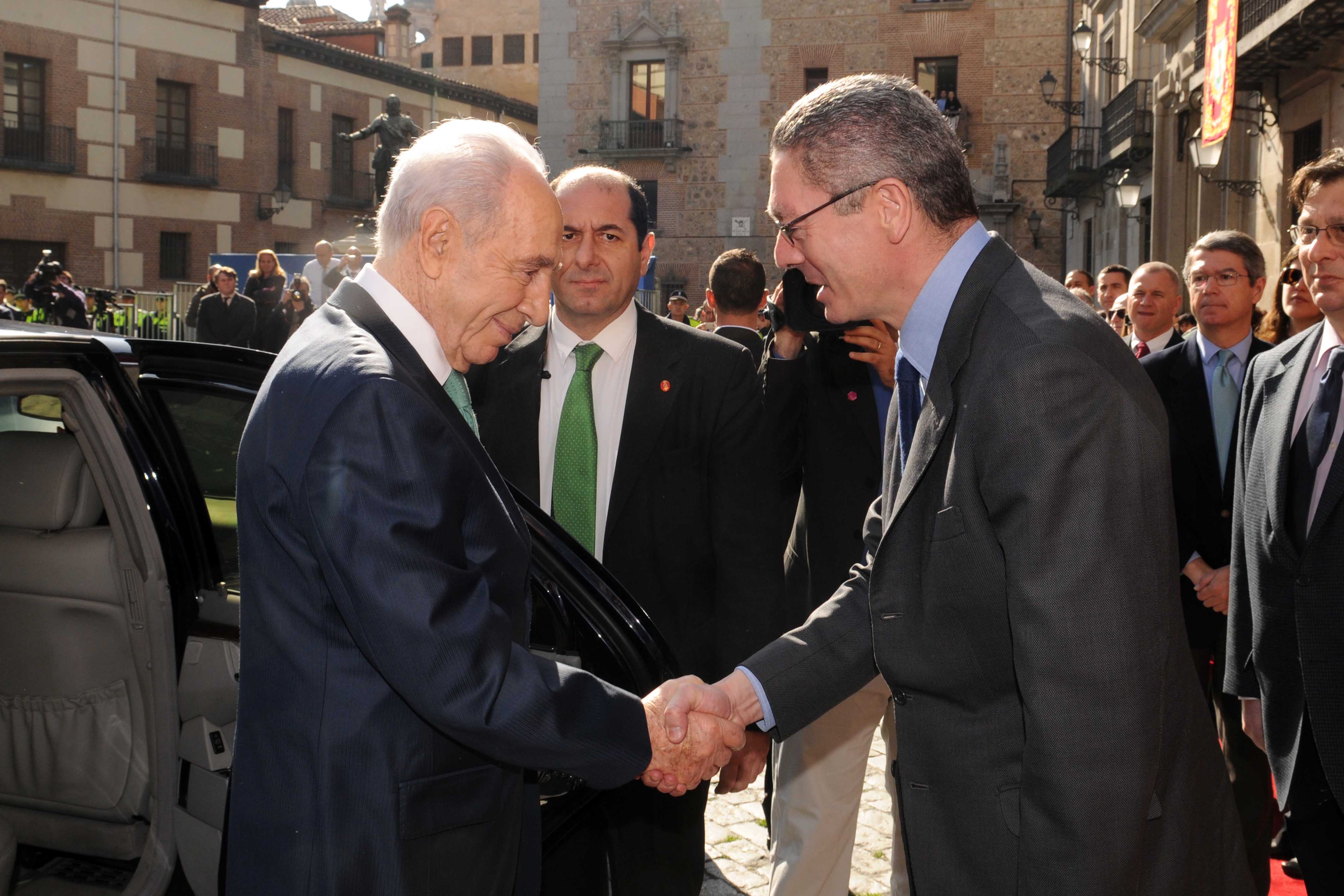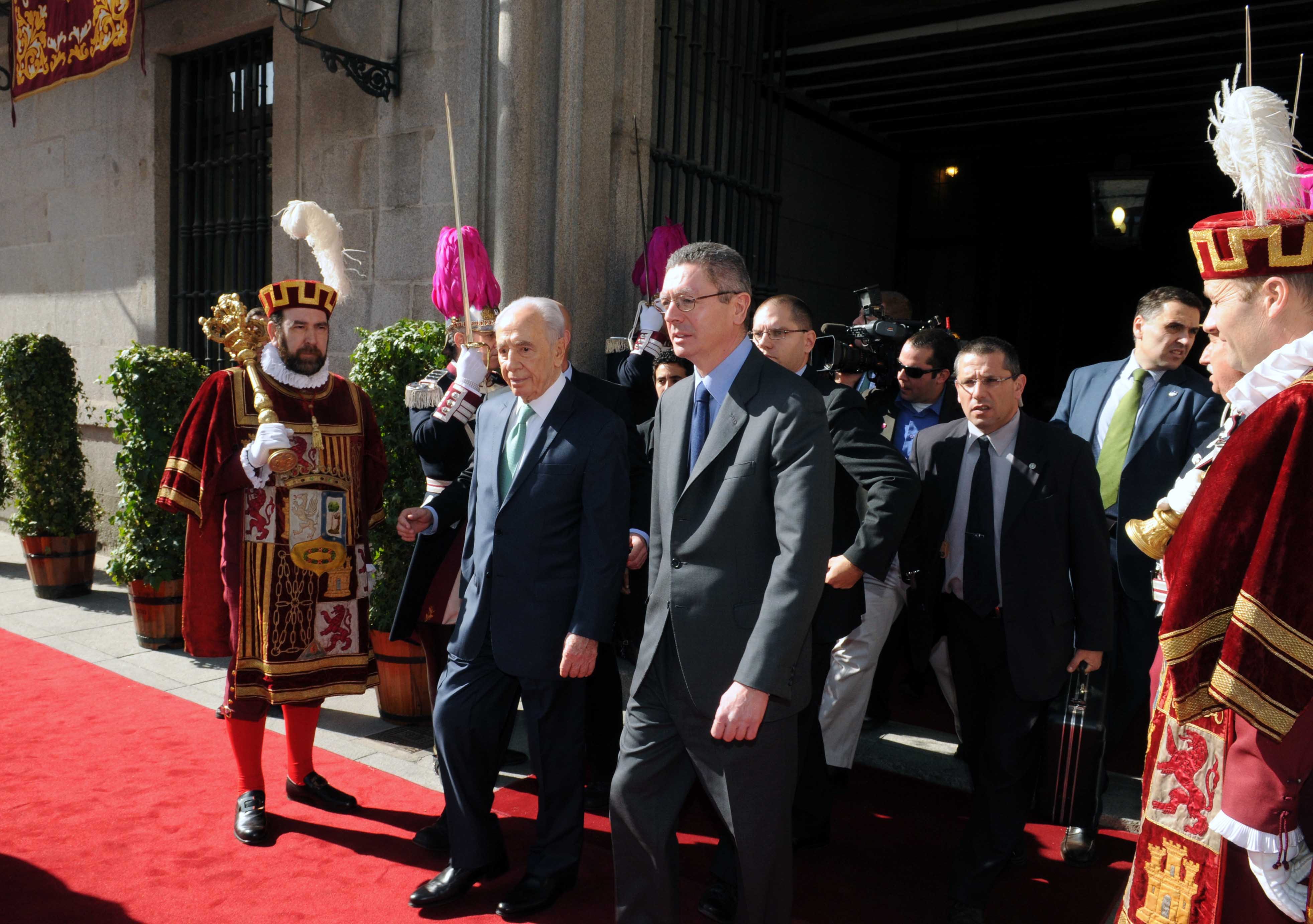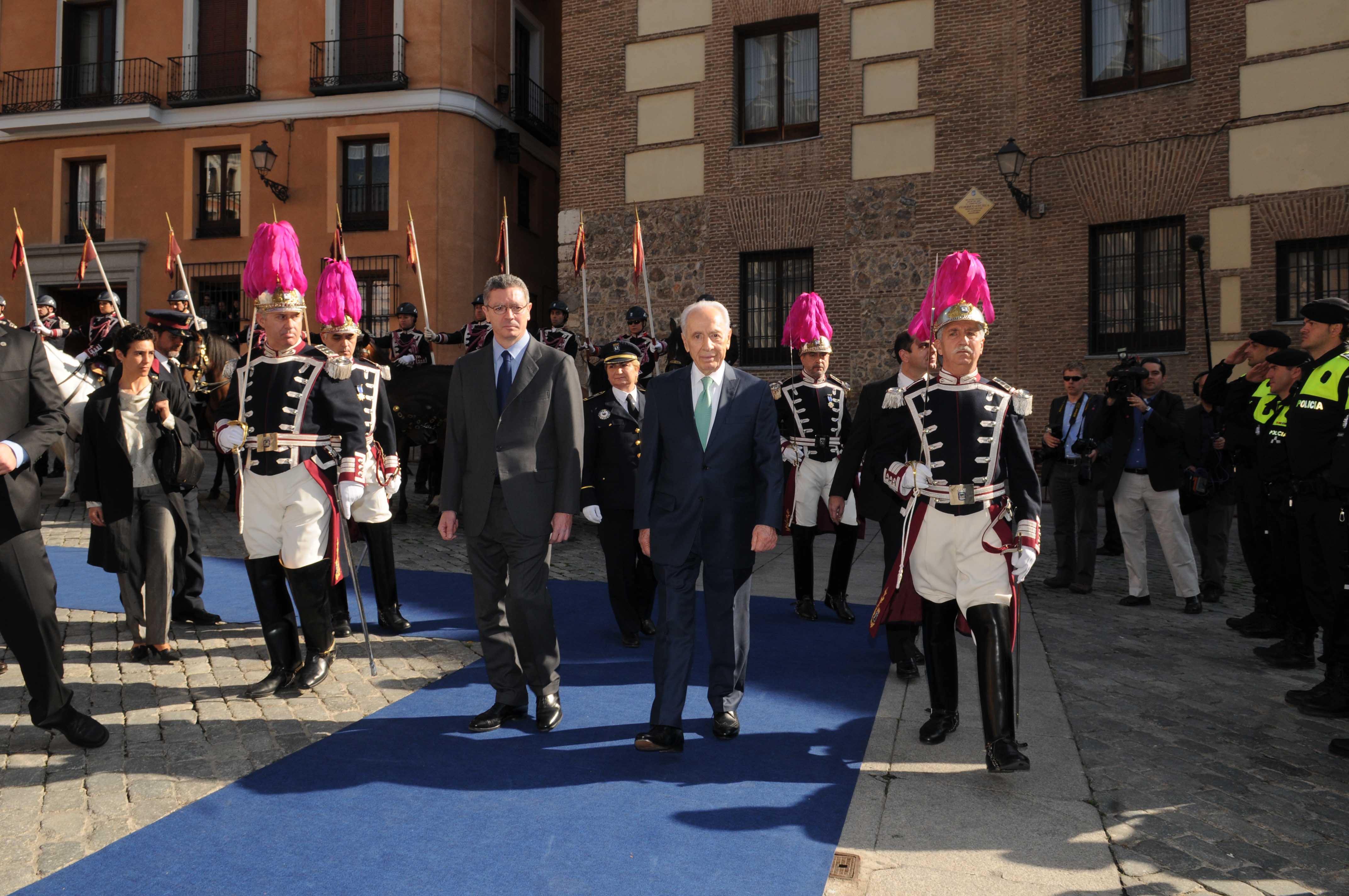 El alcalde de Madrid, Alberto Ruiz-Gallardón ha entregado hoy las Llaves de Oro de la Ciudad de Madrid a Simon Peres, presidente del Estado de Israel, que está de visita en España. Peres fue recibido en la Plaza de la Villa por el alcalde y realizaron el recorrido de honor saludando a la Unidad Central de Seguridad de la Policía Municipal, a la Banda y al Escuadrón, montado a caballo. En la Sala Goya, el dirigente israelí firmó en hebreo el libro de honor del Consistorio: "Para Madrid. Su historia es fascinante, sus edificios estupendos y su gente muy acogedora" fueron las palabras que dedicó a la capital española. Posteriormente, pasaron al salón de Plenos donde Ruiz-Gallardón le entregó las Llaves de Oro al presidente de Israel.