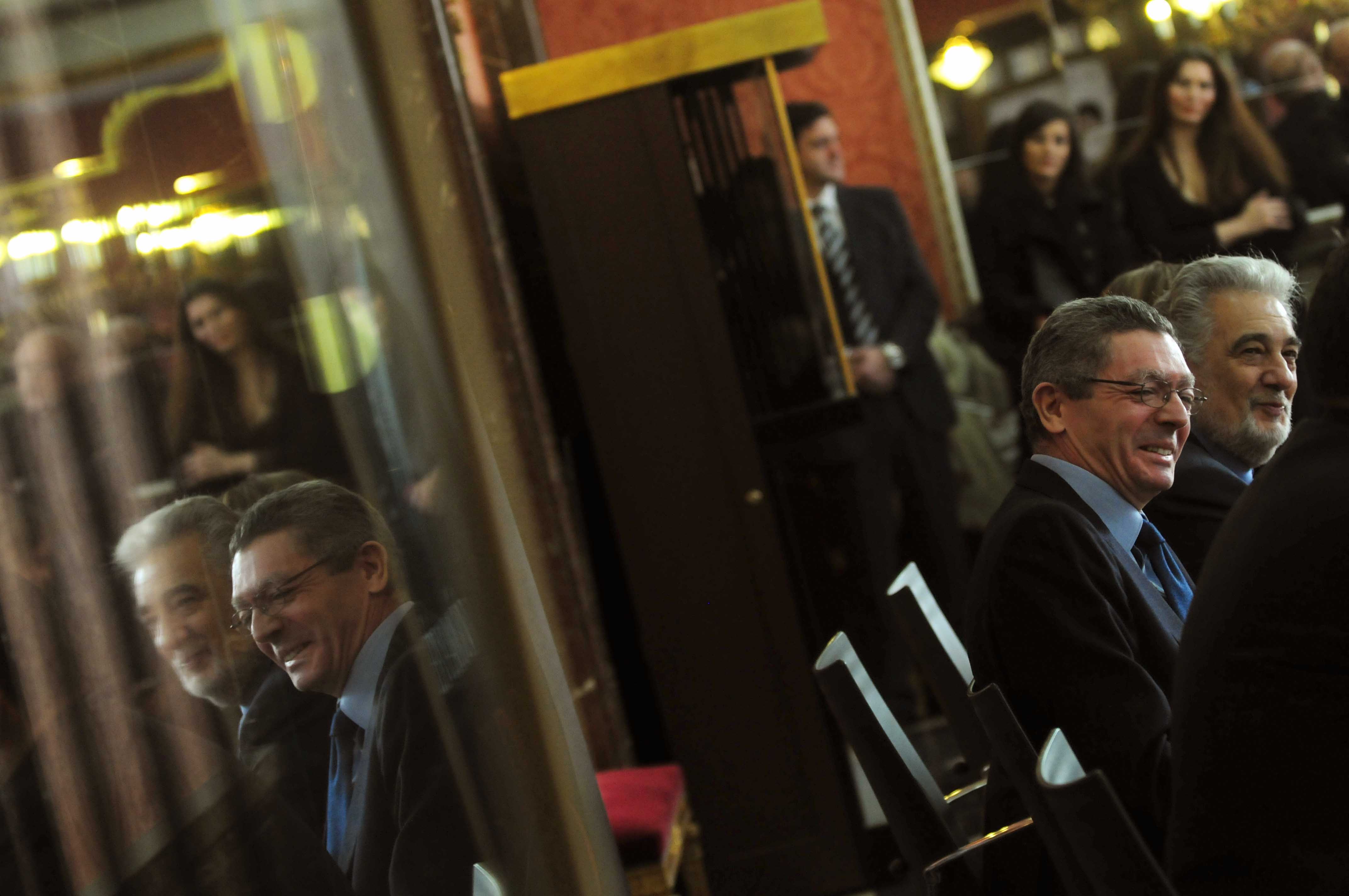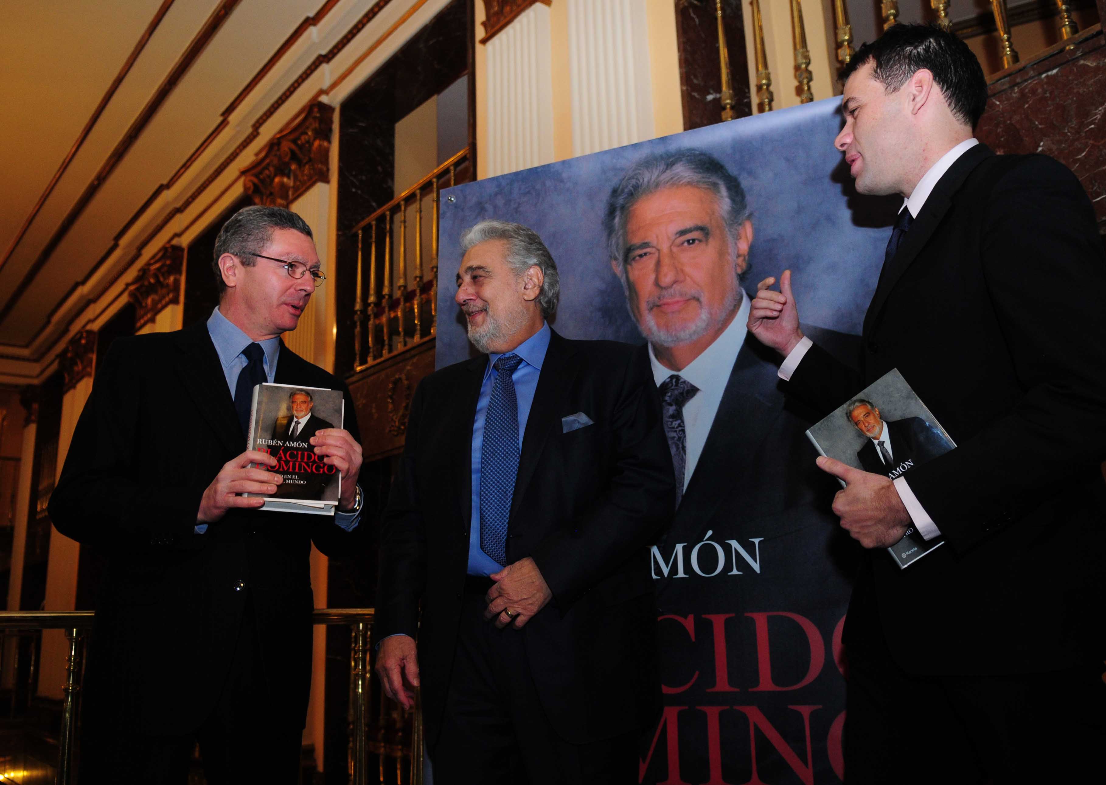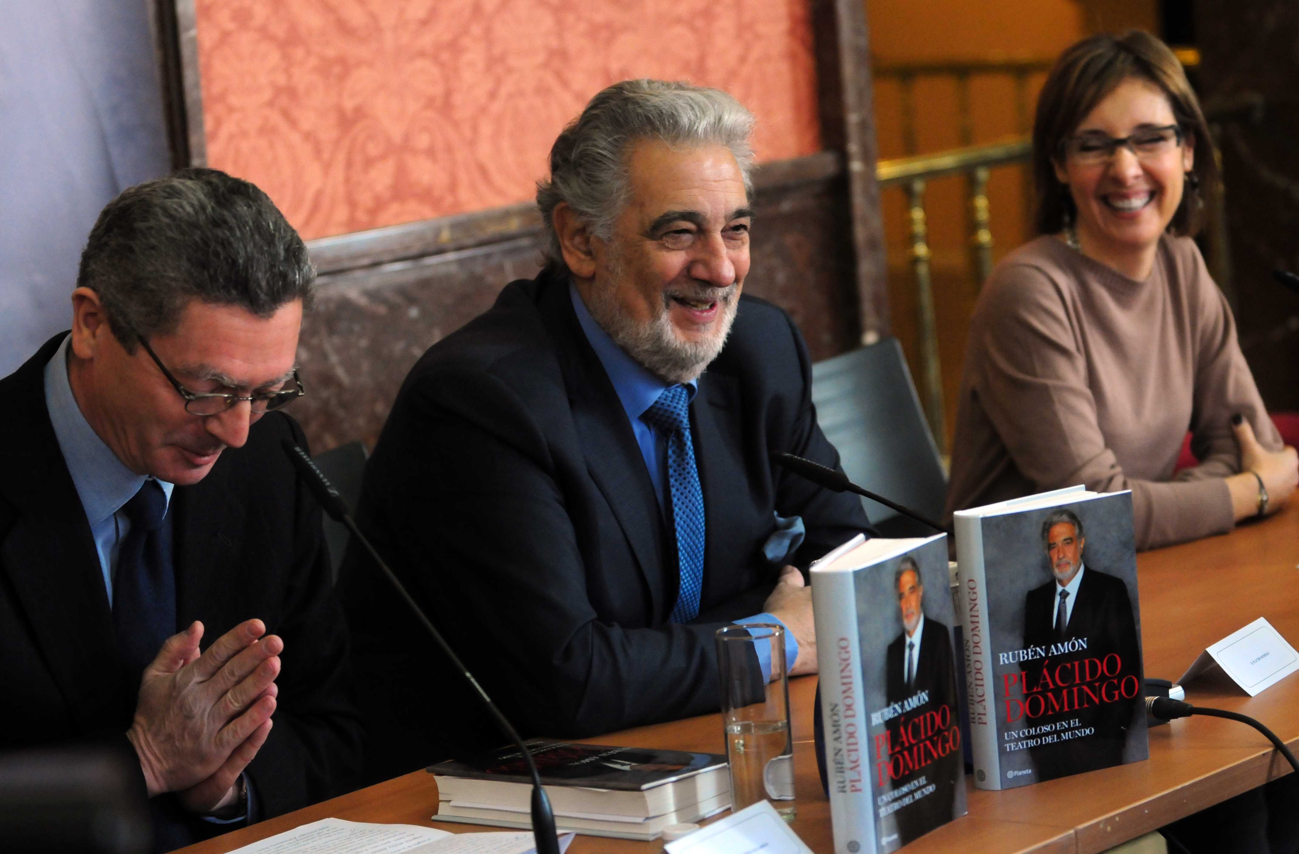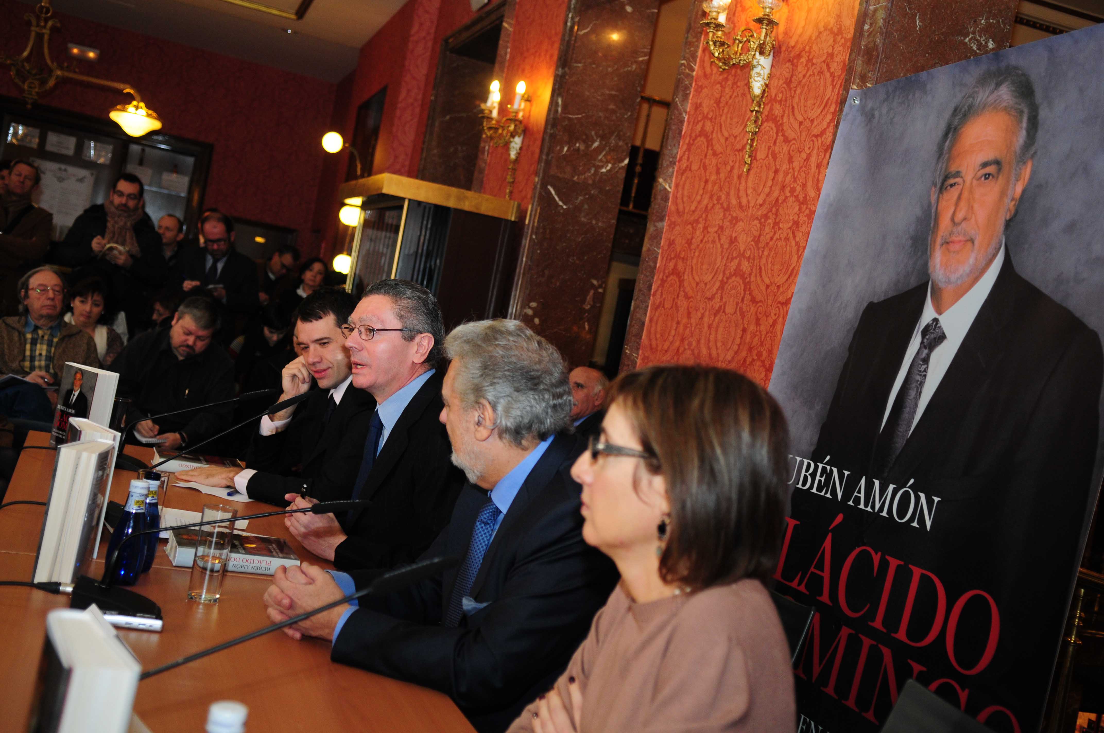 Imágenes de la presentación del libro 'Plácido Domingo, un coloso en el teatro del mundo', que ha tenido lugar hoy en el Teatro de la Zarzuela. El alcalde de la Ciudad, Alberto Ruiz-Gallardón, ha elogiado al tenor al presentar la obra y ha asegurado que "todo en su vida responde al adjetivo de colosal: su obra, su vida, sus logros y su leyenda". El autor del libro, que también ha asistido al acto, es el periodista Rubén Amón.