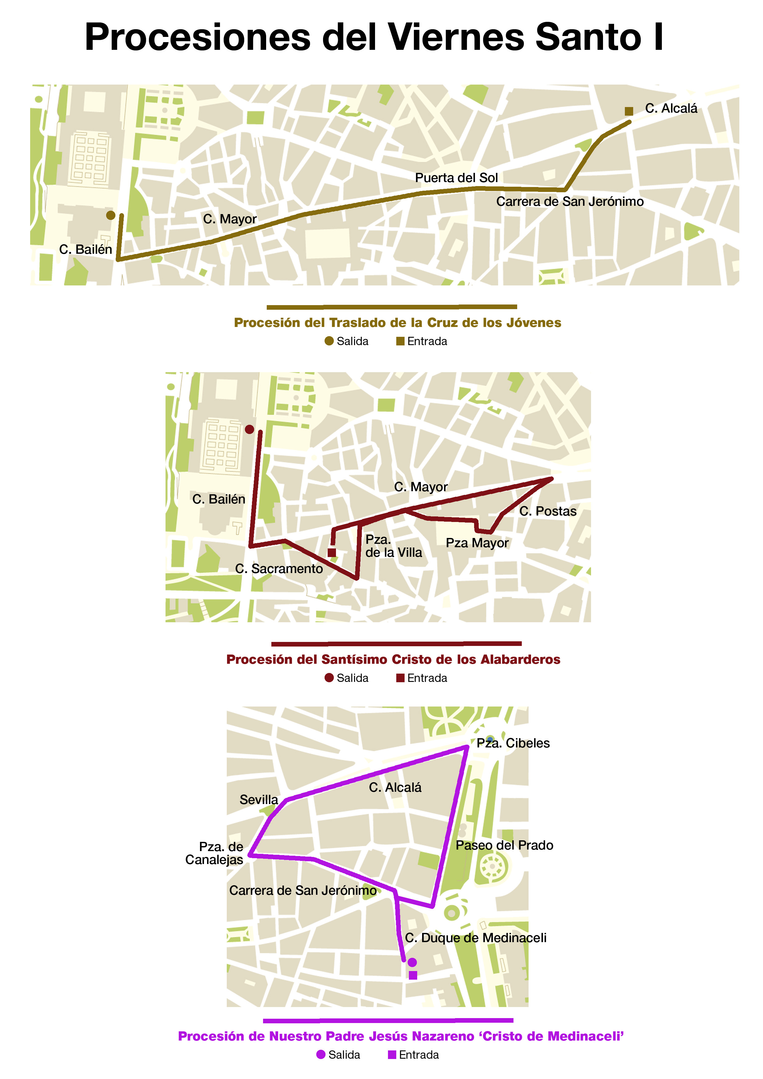 • Procesión de Viernes Santo del Santísimo Cristo de los Alabarderos. Inicio a las 19 horas. Itinerario: Salida de la puerta del Príncipe del Palacio Real -Bailén - calle Mayor -Sacramento -Cordón - plaza de la Villa -Mayor -Ciudad Rodrigo - plaza Mayor - calle de la Sal -Postas -San Cristóbal - calle Mayor - Iglesia Catedral de las Fuerzas Armadas situada en la calle de Sacramento.