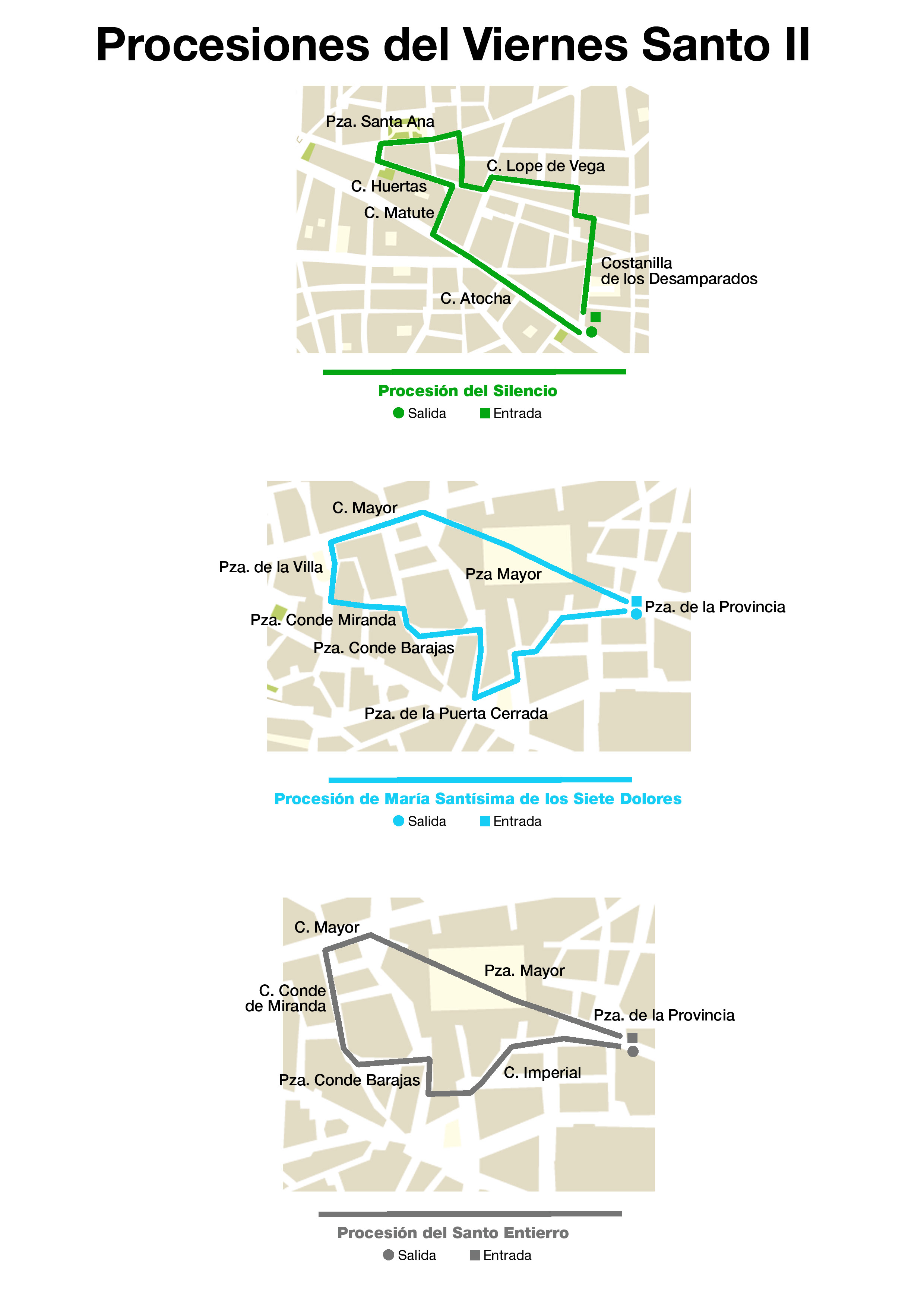 • Procesión de Viernes Santo de María Santísima de los Siete Dolores, Santísimo Cristo de la Agonía y Descendimiento de la Cruz. A partir de la 19.30. Itinerario: Atocha 6 - plaza de la Provincia -Imperial -Toledo -Tintoreros - plaza de la Puerta Cerrada -Cuchilleros -Maestro Villa - plaza Conde Barajas - calle de la Pasa - plaza Conde Miranda - calle del Codo - plaza de la Villa - calle Mayor -Ciudad Rodrigo - plaza Mayor -Gerona - plaza de la Provincia -Atocha - Parroquia de Santa Cruz.
