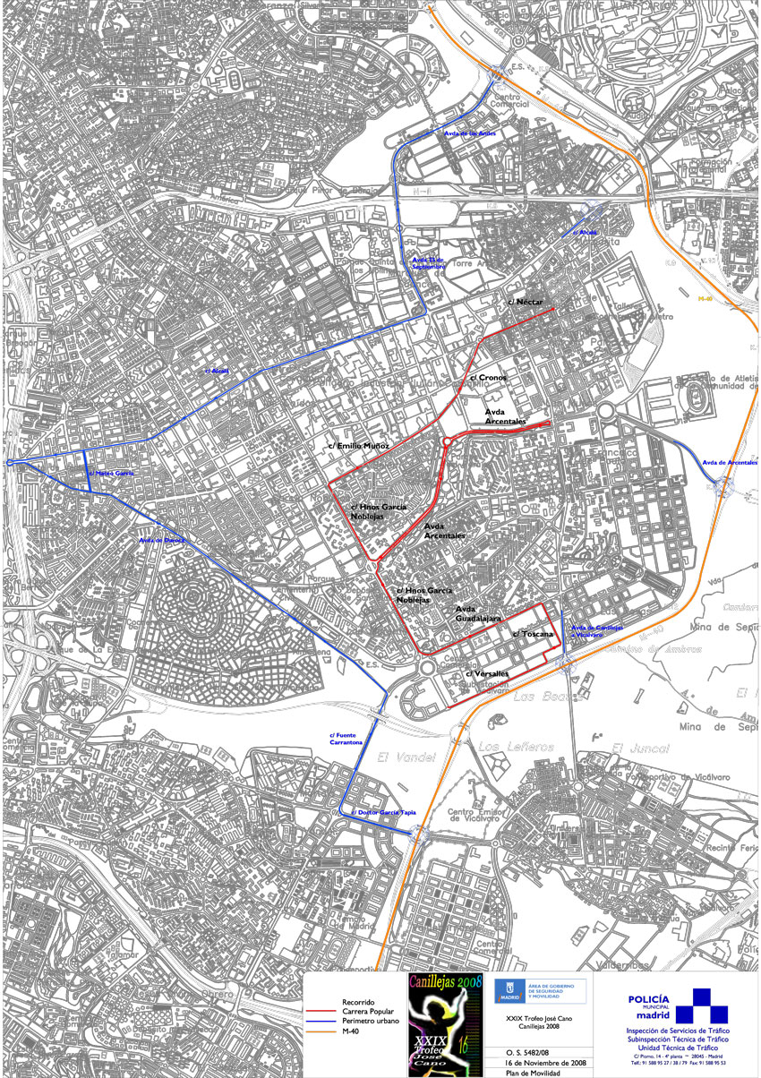 Policía Municipal ha diseñado un operativo especial de movilidad para la celebración del XXIX Trofeo José Cano, la carrera popular que recorrerá las calles del barrio de Canillejas mañana domingo entre las 9.00 y las 13.00 horas. El Gobierno de la Ciudad de Madrid recomienda el uso del transporte público para desplazarse ya que, con motivo de los preparativos y el posterior desarrollo de la prueba, se producirán cortes y desvíos de tráfico.