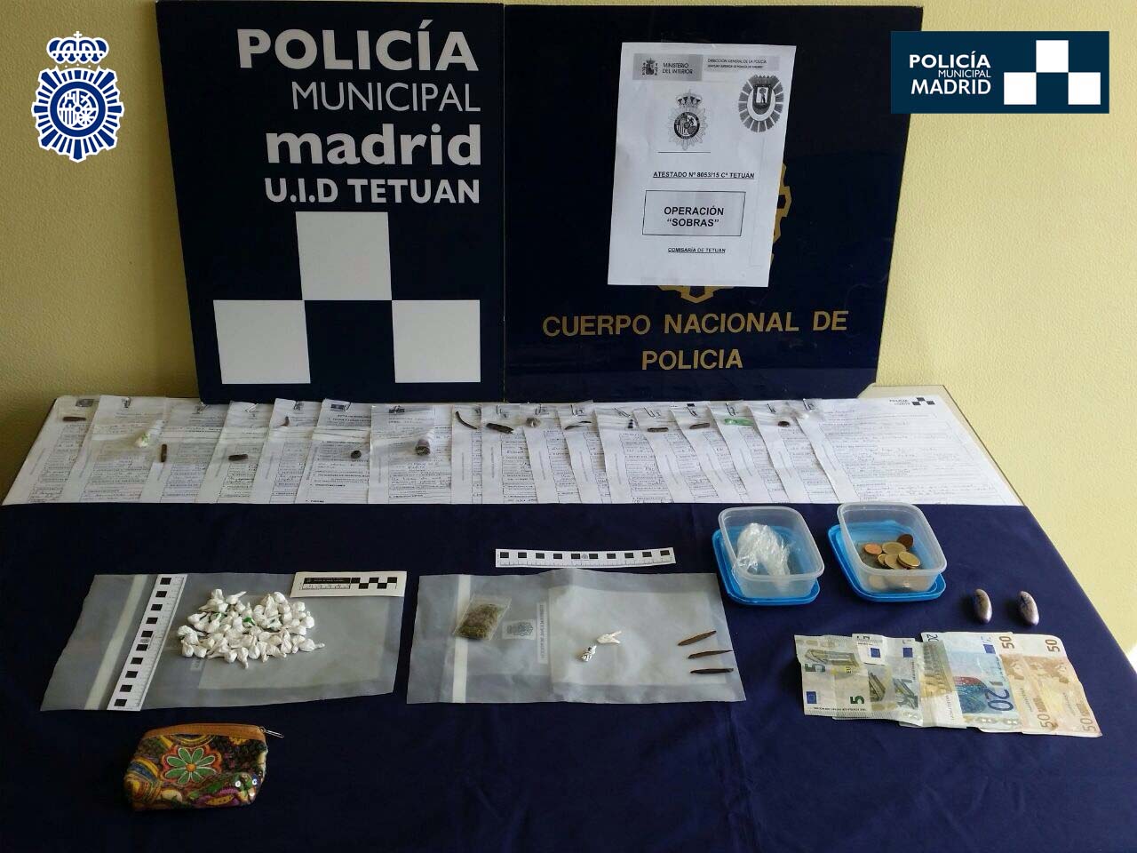 Varias semanas de trabajo conjunto entre la Policía Municipal de Madrid y el Cuerpo Nacional de Policía, la denominada Operación Sobras, ha concluido con el desmantelamiento de un punto de venta de droga en el distrito de Tetuán. Tras el registro de dos viviendas en la calle Almortas, los agentes han detenido a tres personas por un presunto delito contra la salud pública y han confiscado 55 bolsitas de cocaína preparadas para su venta, además de varios trozos de hachís y una bolsa de marihuana.