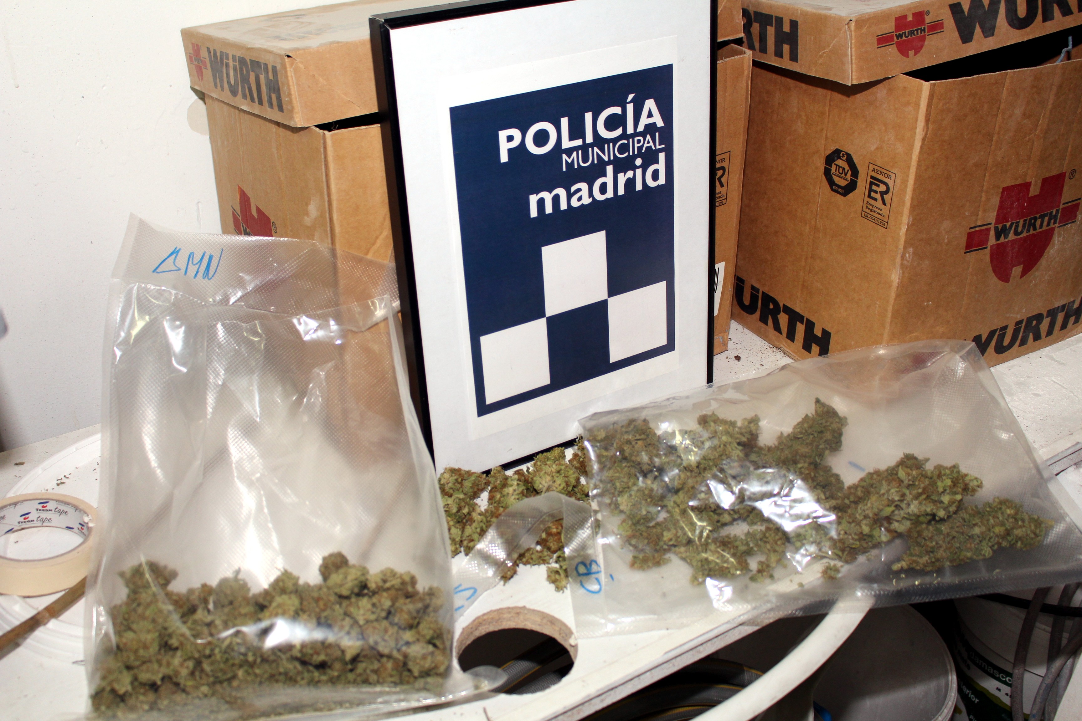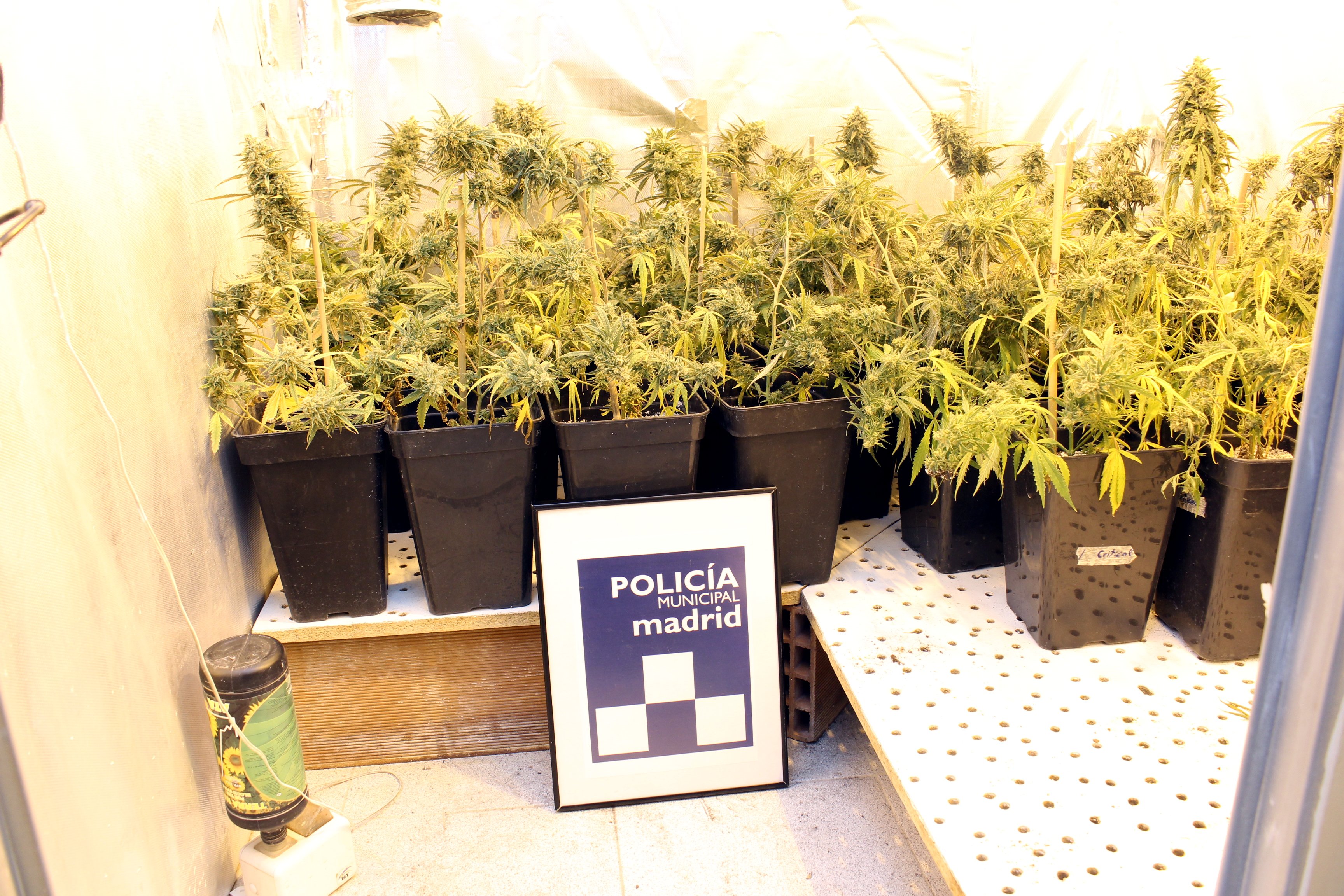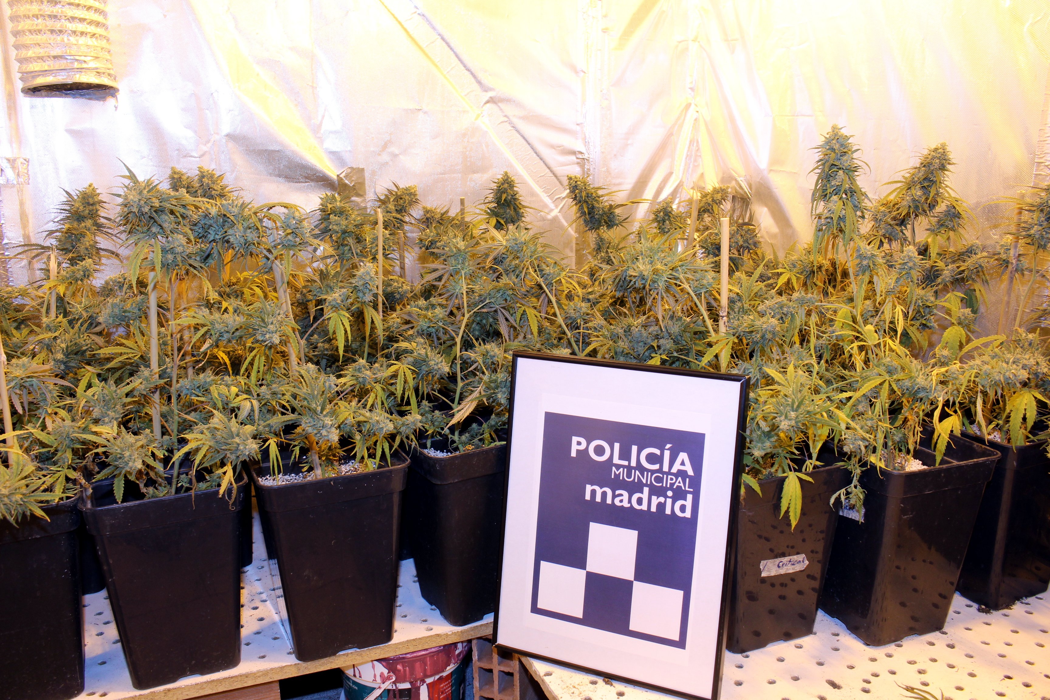 Policía Municipal de Madrid ha desmantelado una plantación de marihuana en un almacén de pintura del distrito Puente de Vallecas. Más de siete kilos decomisados y dos personas detenidas es el balance de esta operación policial, iniciada tras la denuncia de los vecinos, que se quejaban de los fuertes olores que salían del local.