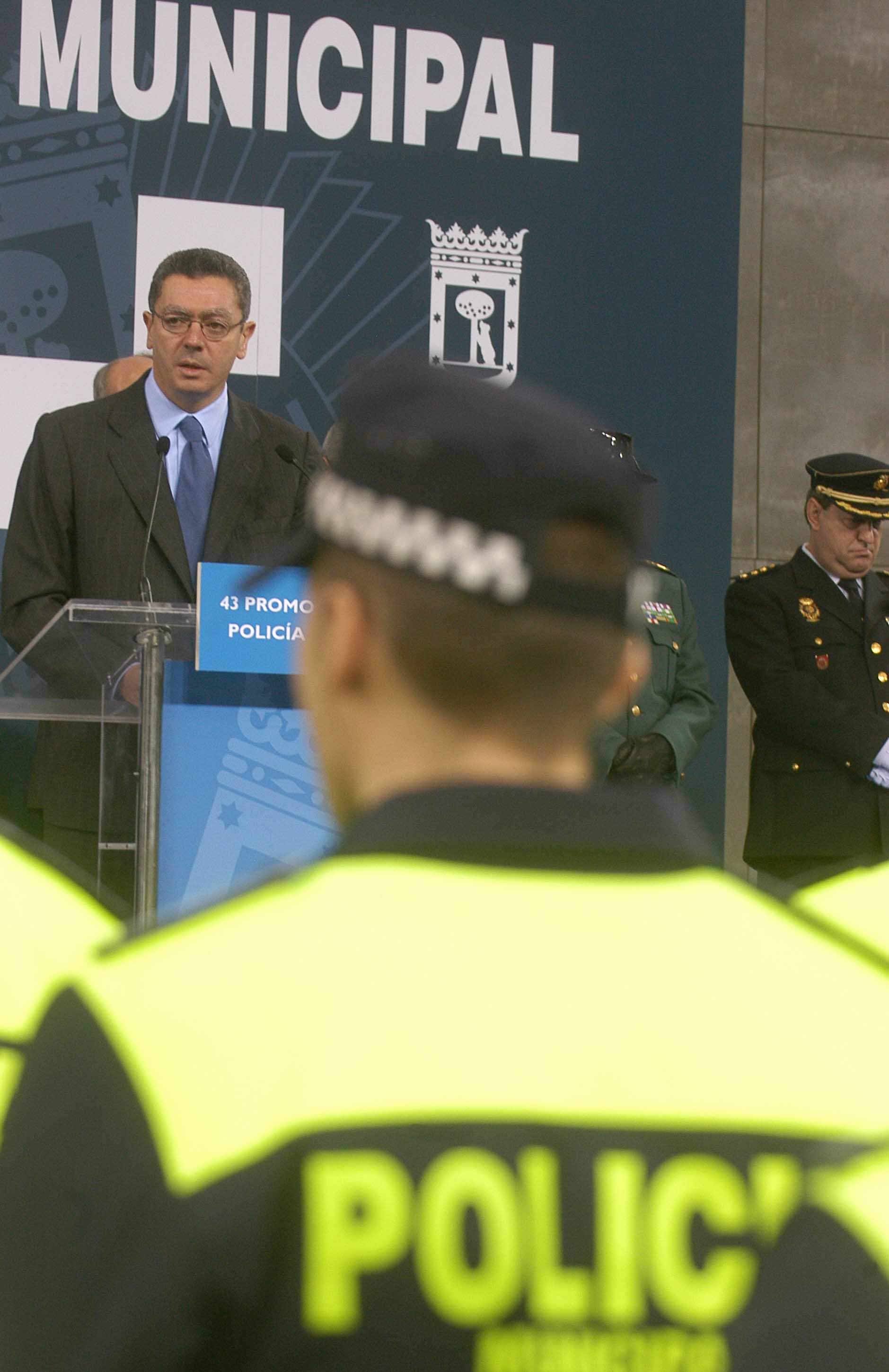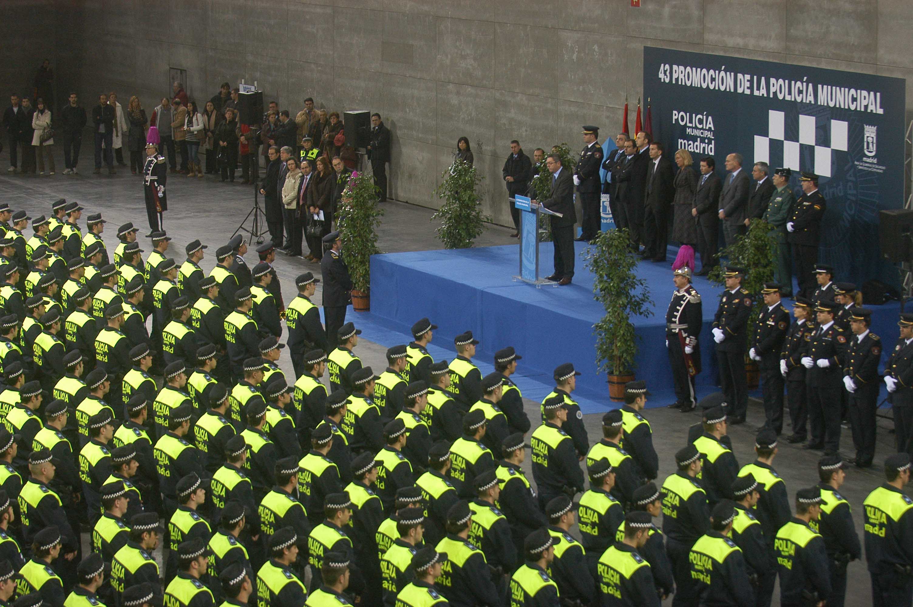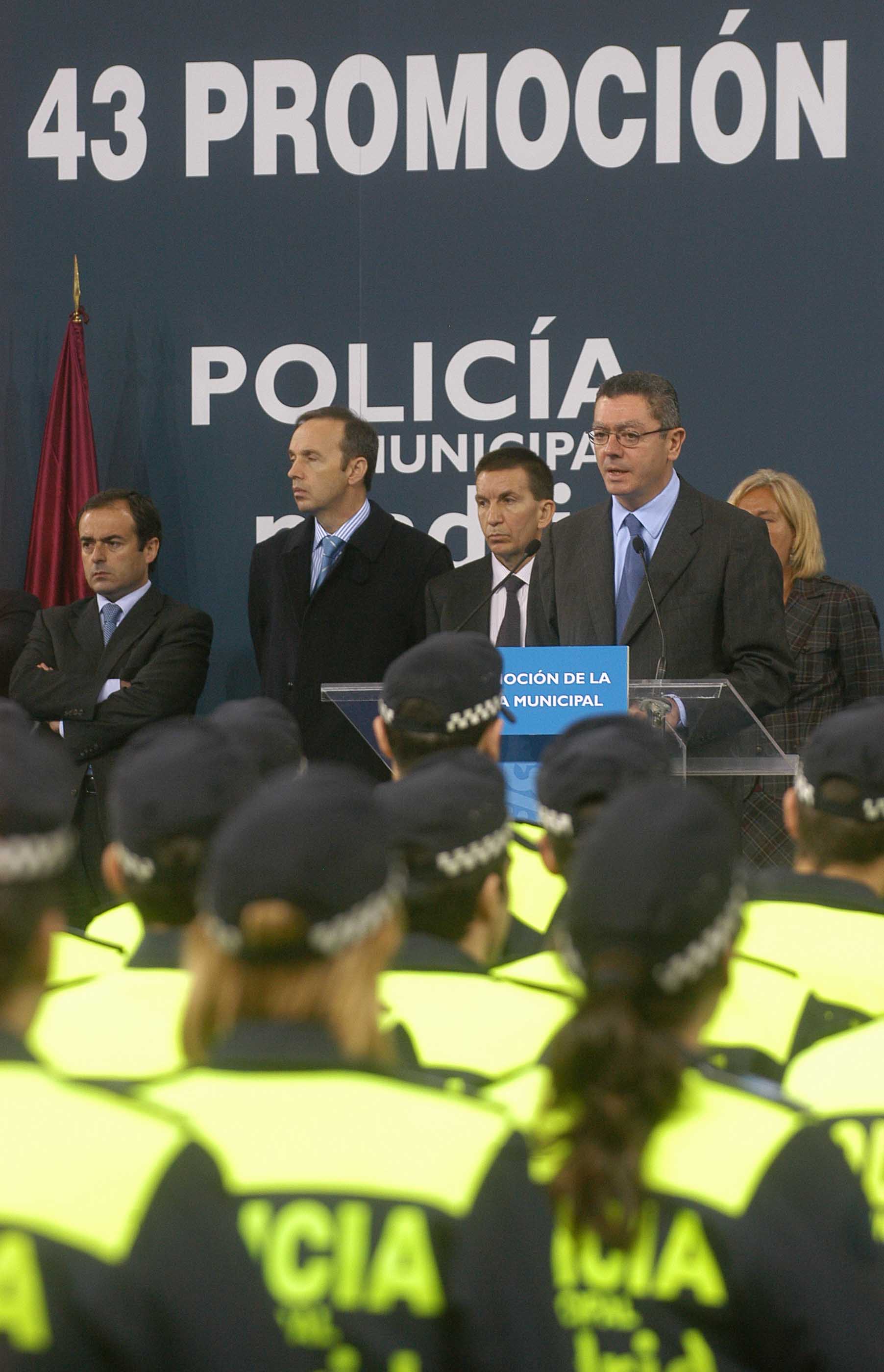 El alcalde de Madrid, Alberto Ruiz-Gallardón, ha presentado hoy la 43 promoción de la Policía Municipal de Madrid, en presencia del concejal de Seguridad, Pedro Calvo, y la subdelegada del Gobierno.
