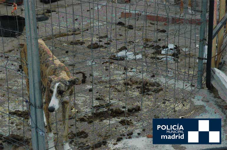Fueron los propios gemidos y aullidos de los animales los que alertaron a los agentes de la Policía Municipal que patrullaban por la Cañada Real Galiana, a la altura del número 21, de que algo malo ocurría. Allí, una zona anexa a la vivienda, llena de excrementos y con una falta total de agua y alimento, se apiñaban doce galgos -cinco adultos y siete cachorros- y un cachorro de dogo argentino. En otra parte del recinto, se hallaba un caballo de capa marrón, también en pésimas condiciones.