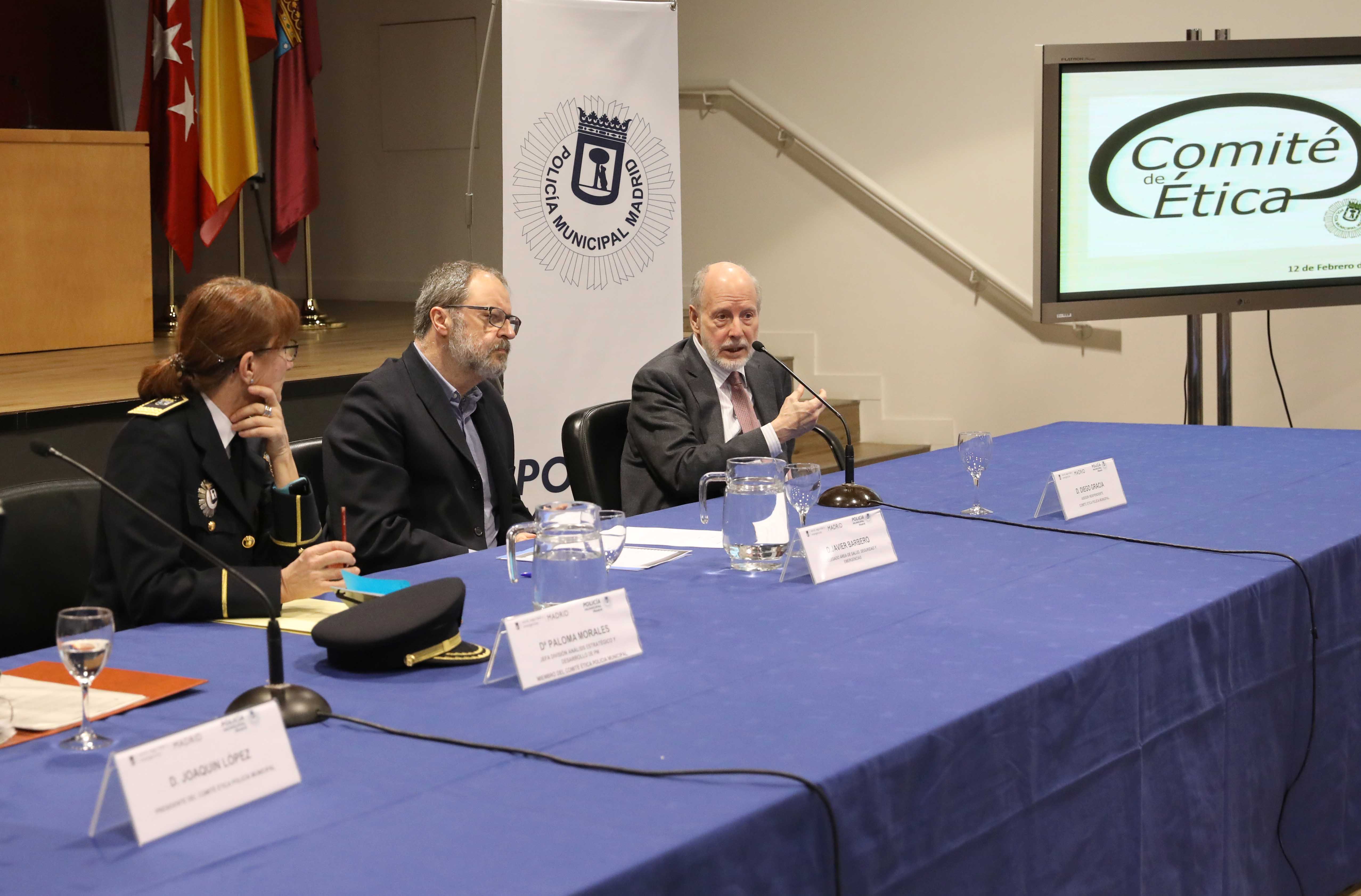Policía Municipal de Madrid cuenta desde hoy con un Comité de Ética, un órgano que nace de la legítima aspiración del cuerpo a contar con más y mejores herramientas que permitan seguir construyendo una policía moderna, atenta a los distintos desafíos técnicos y éticos que plantea la ciudad de Madrid y la sociedad madrileña. A la presentación, que ha tenido lugar este mediodía, han asistido el delegado del Área de Salud, Seguridad y Emergencias, Javier Barbero; el experto en bioética y asesor independiente del Comité de Ética de Policía Municipal, Diego Gracia; la jefa de División de Análisis Estratégico y Desarrollo de la PM, y miembro del nuevo comité, Paloma Morales, y el presidente de este, Joaquín López.
