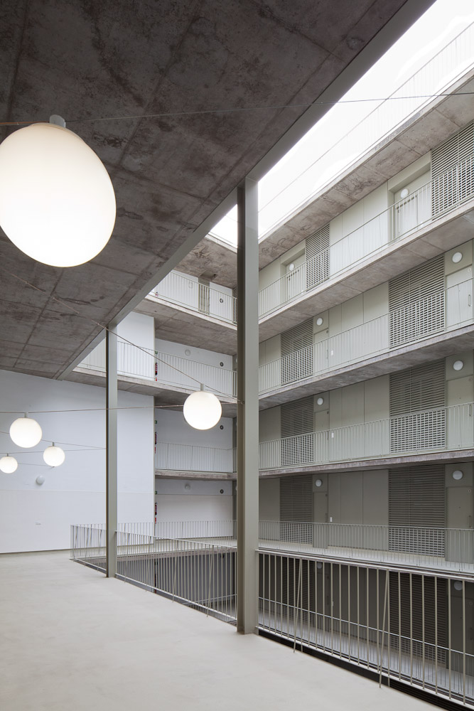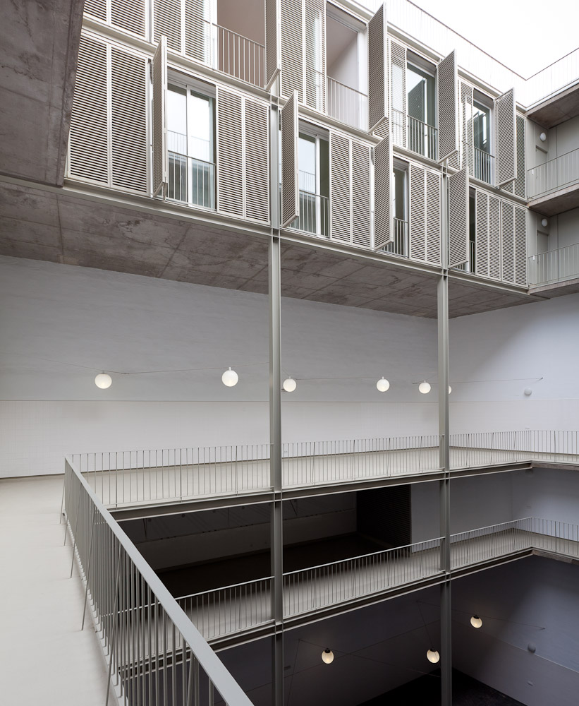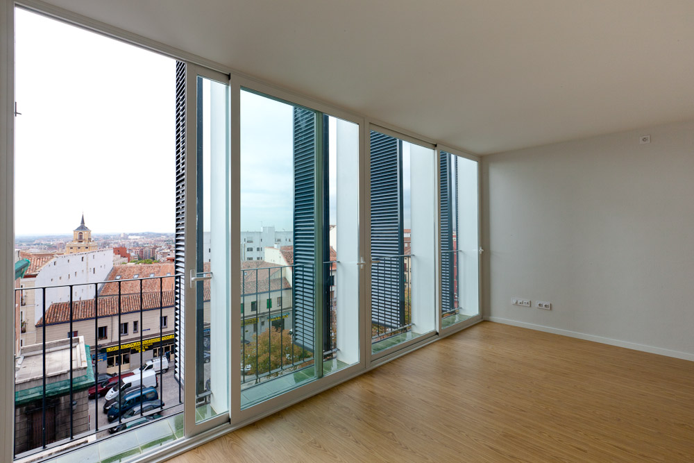 En el interior, los corredores característicos de la corrala se abren a un patio de grandes dimensiones -300 metros- concebido como punto de encuentro y de comunicación para los vecinos. En el exterior, una gran balconada corrida con ventanales de suelo a techo y cerramientos móviles incrementa la sostenibilidad al regular el paso del aire y la luz, un sistema que incrementa la eficiencia energética. En el sótano se localizan los trasteros y el aparcamiento, que cuenta con un montacoches, sistema que optimiza el espacio disponible y facilita la accesibilidad.