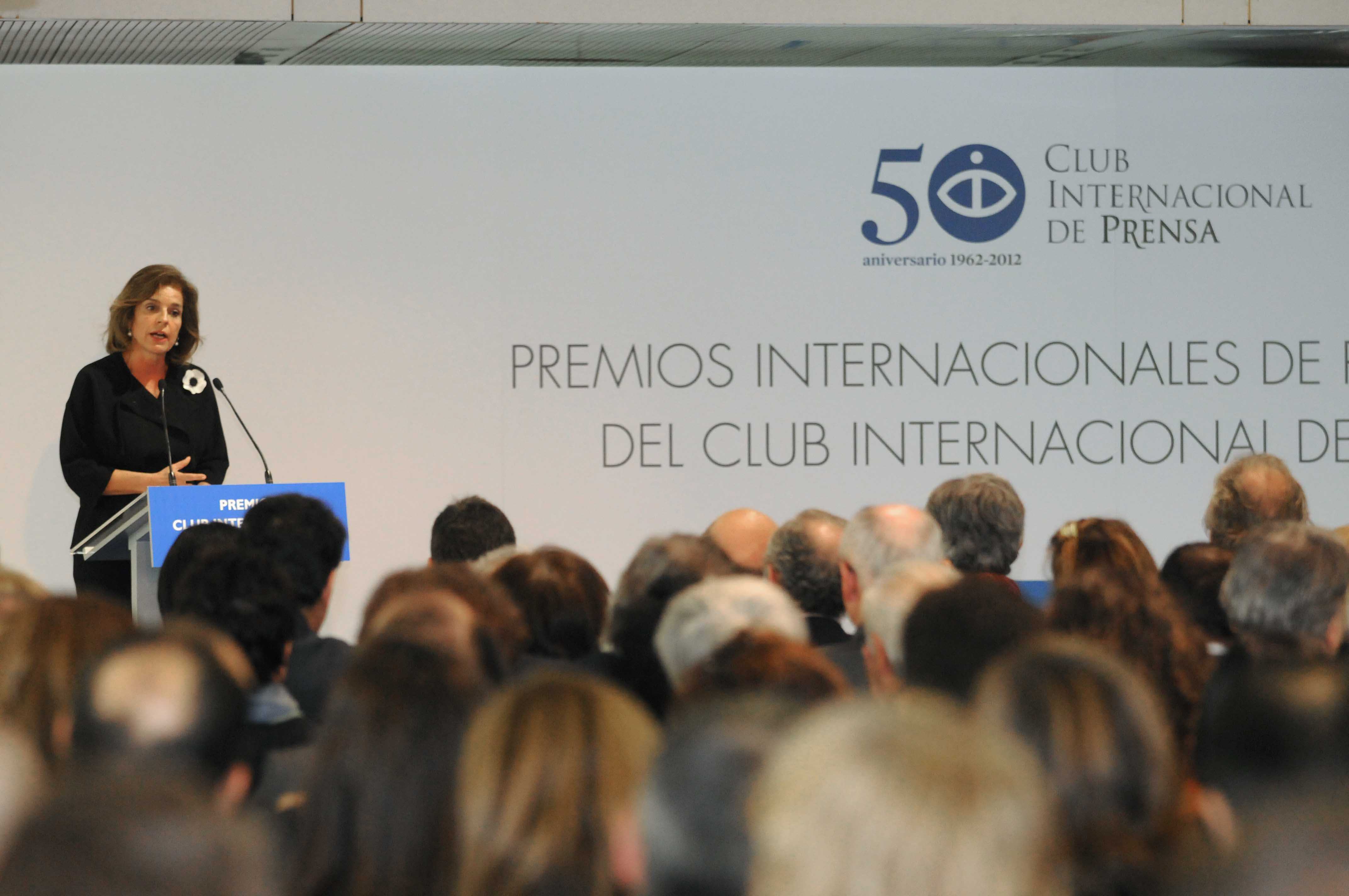 La alcaldesa de la Ciudad de Madrid, Ana Botella, durante la entrega de los galardones del Club Internacional de Prensa, que ha estado presidida por la princesa de Asturias. El escritor Mario Vargas Llosa, uno de los premiados; la vicepresidenta del Gobierno, Soraya Sáenz de Santamaría; el presidente del Congreso, Jesús Posada, y el presidente de la Audiencia Nacional, Ángel Juanes, han estado presentes, también, en el acto de hoy.