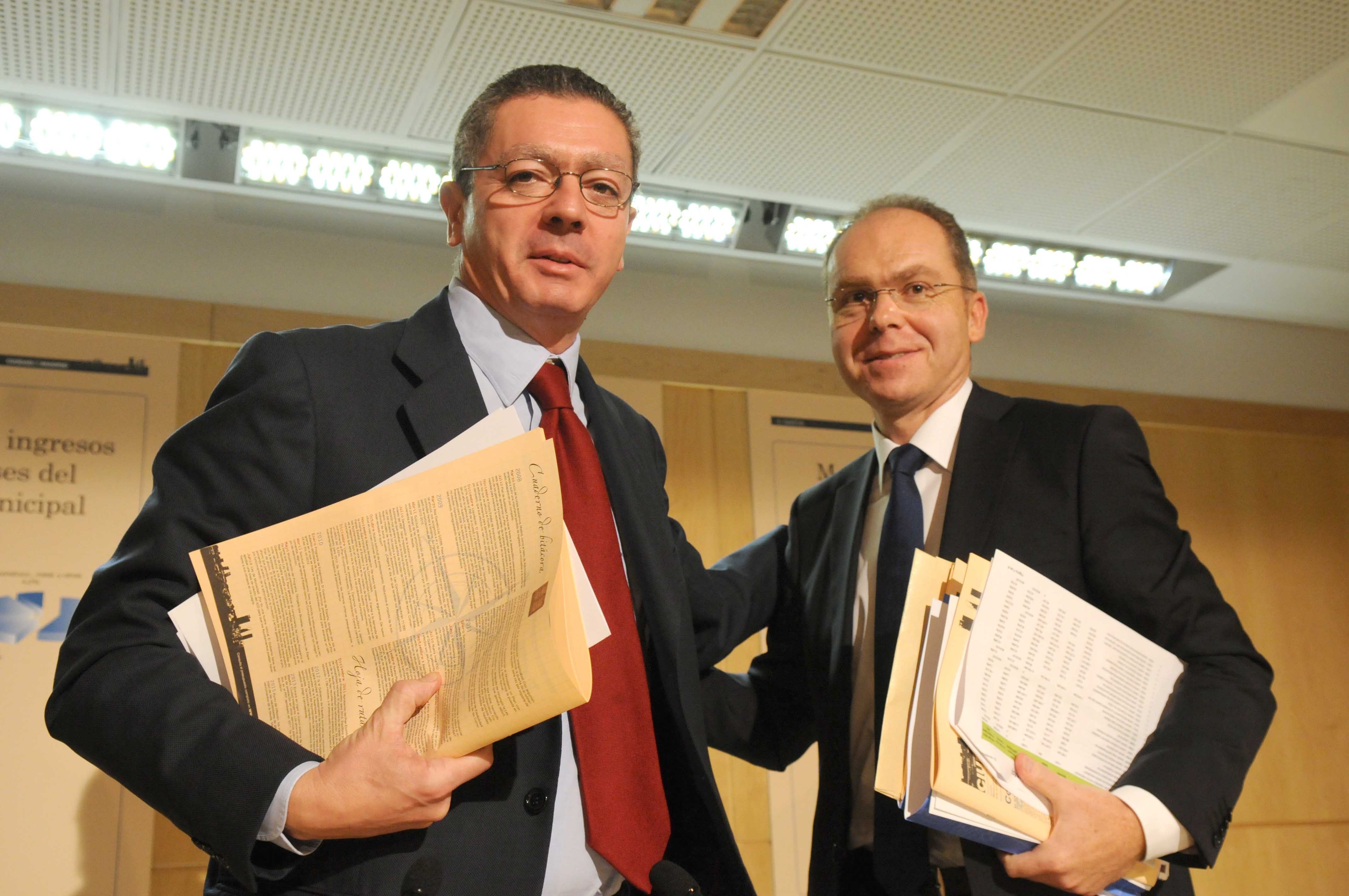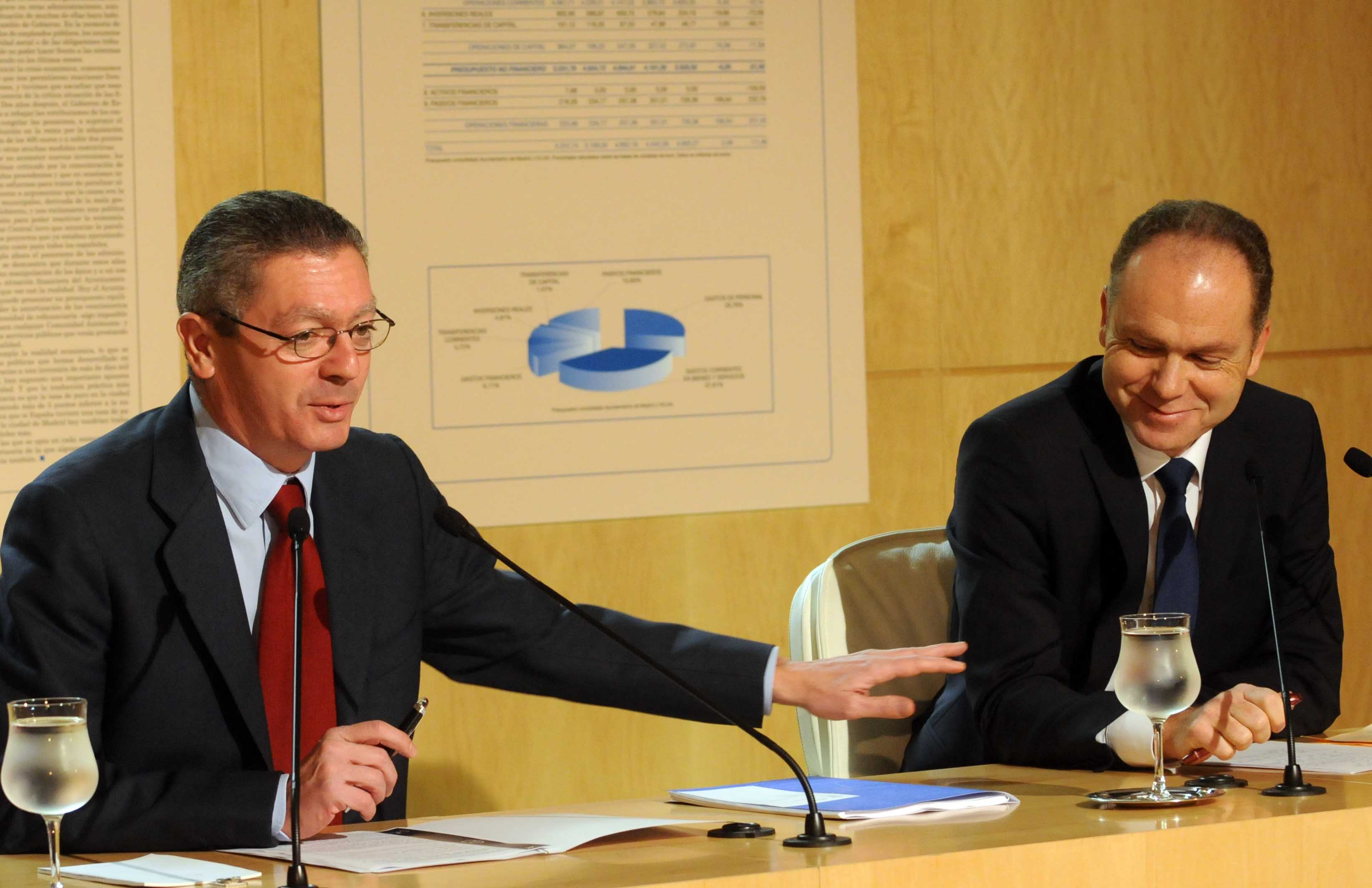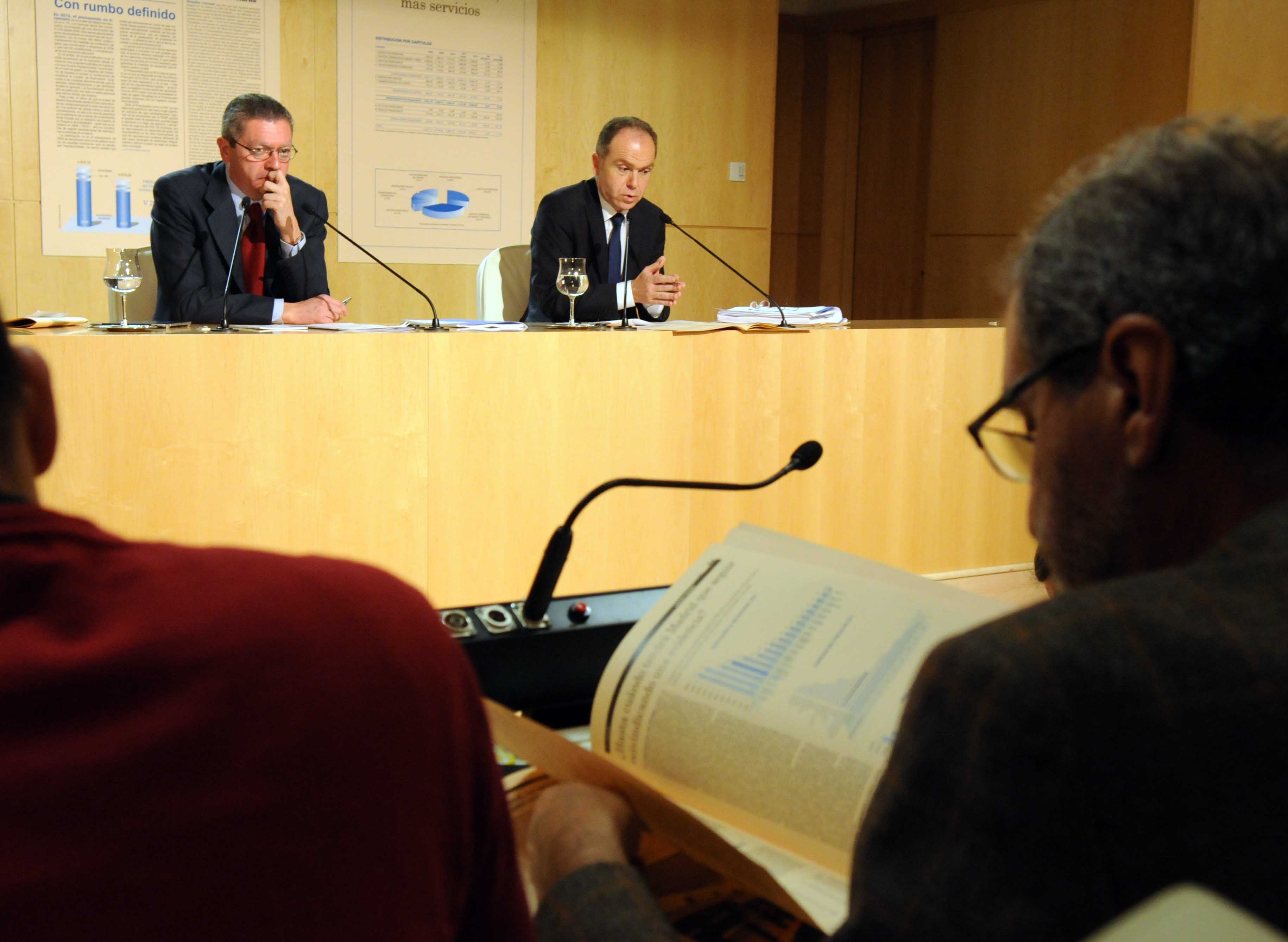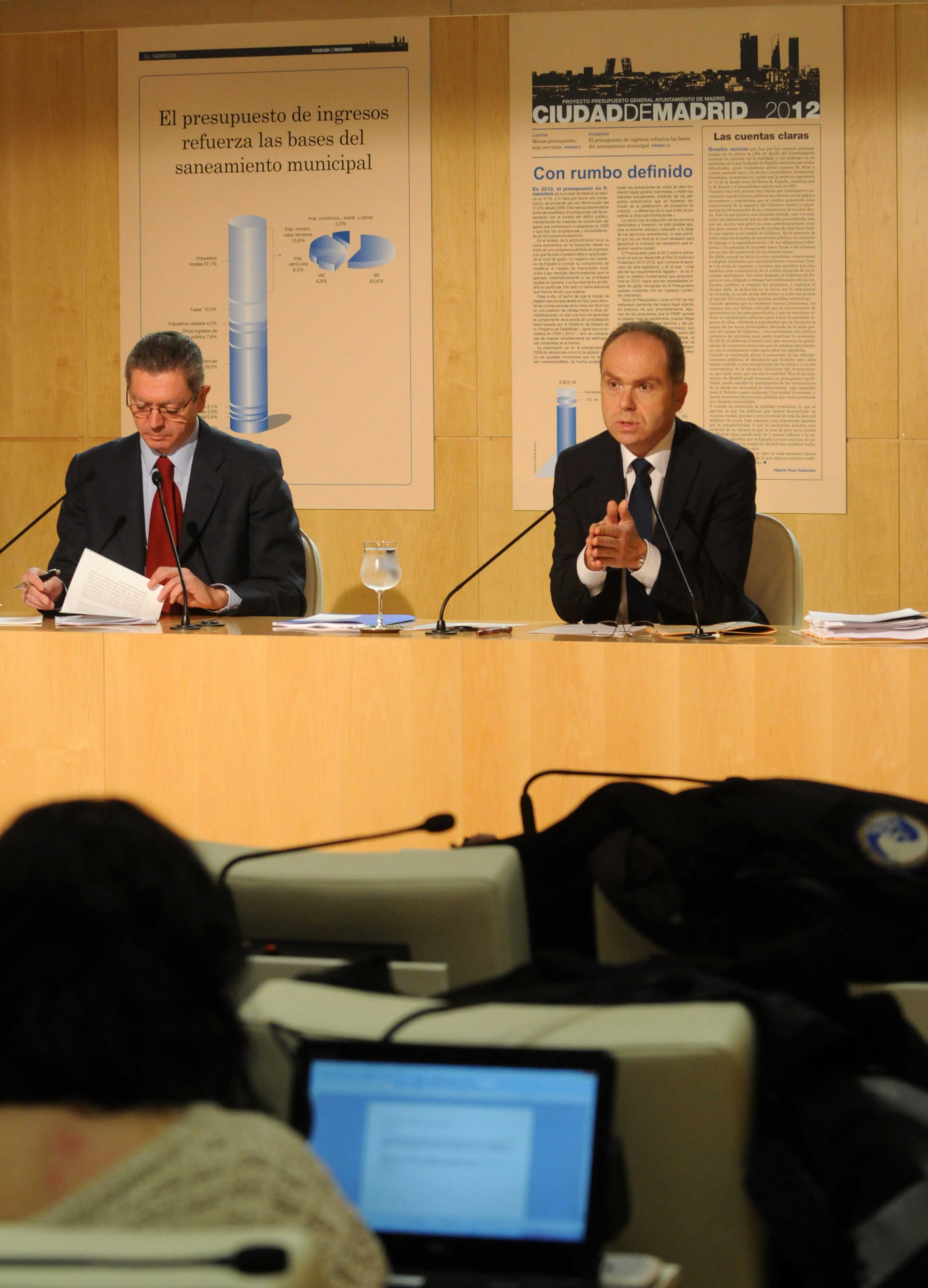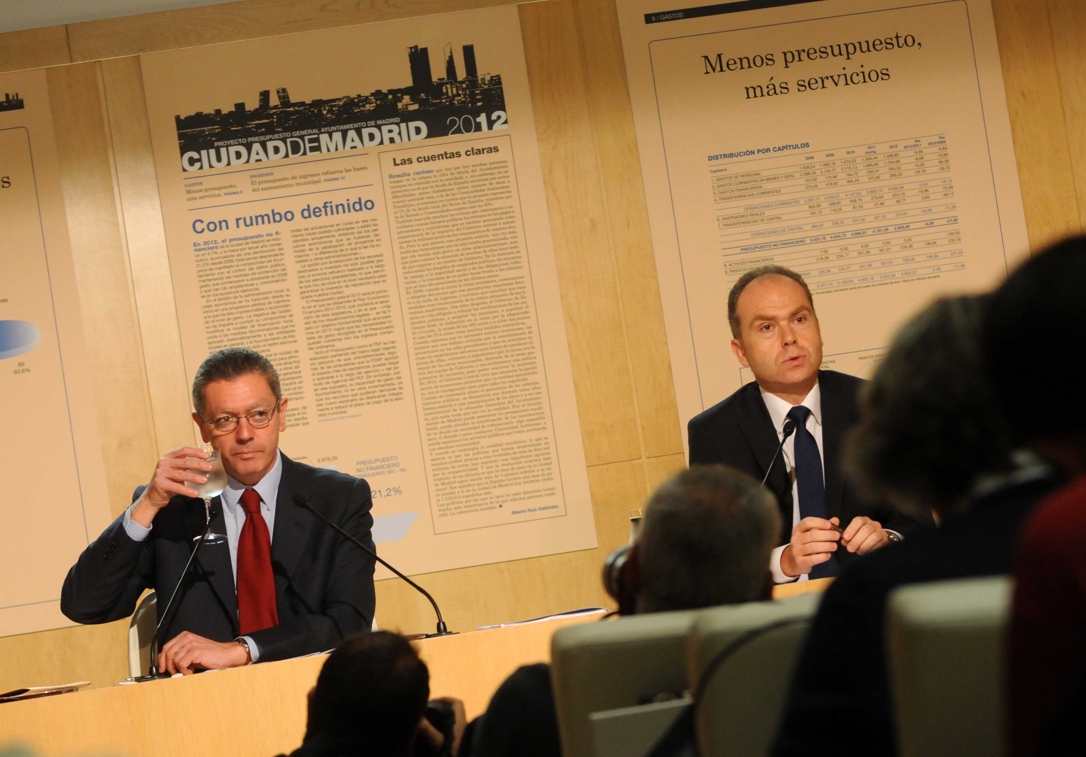 El alcalde de Madrid, Alberto Ruiz-Gallardón, y el delegado de Hacienda, Juan Bravo, presentaron los presupuestos para 2012, que están marcados para crear empleo y garantizar los servicios sociales.