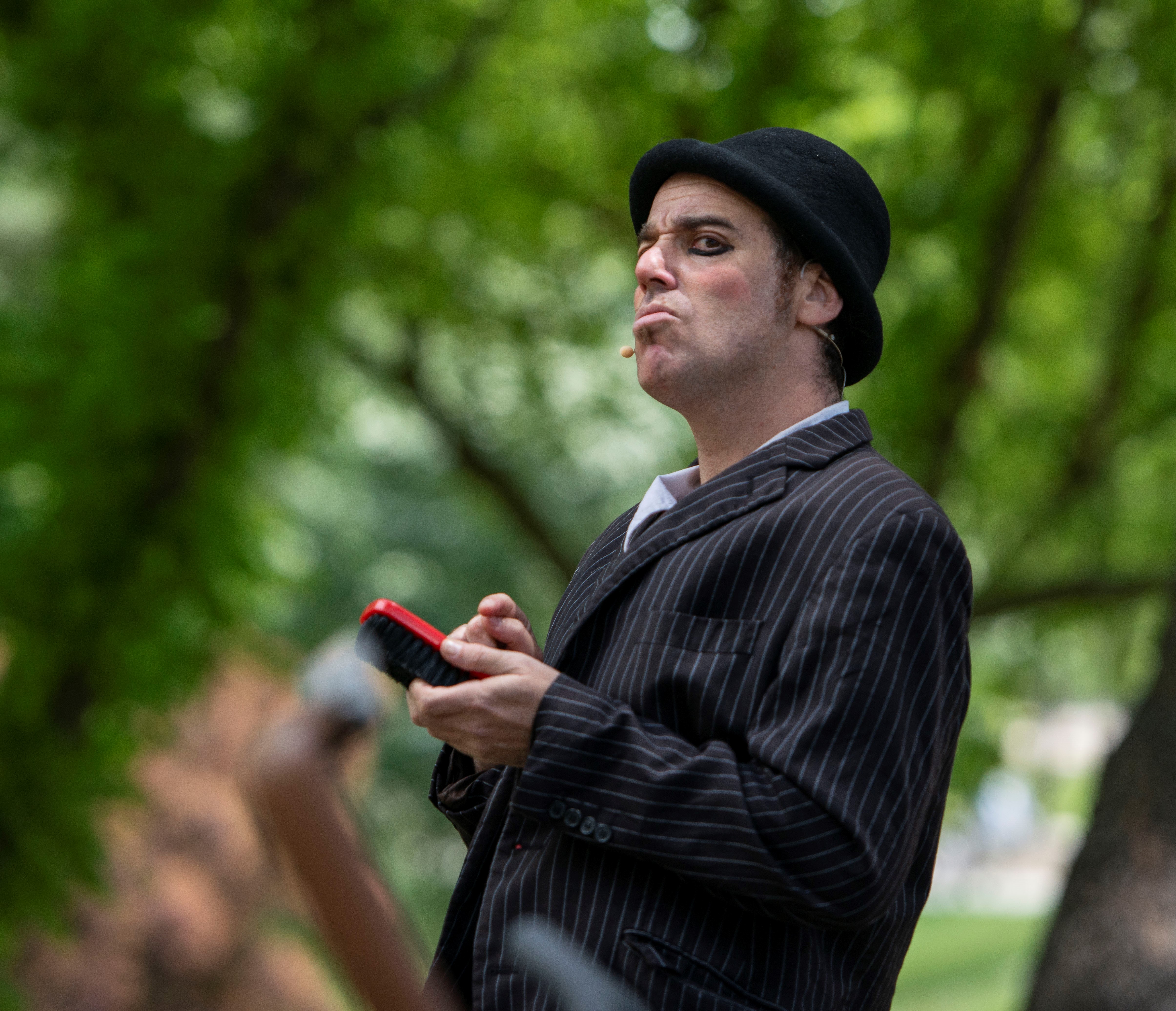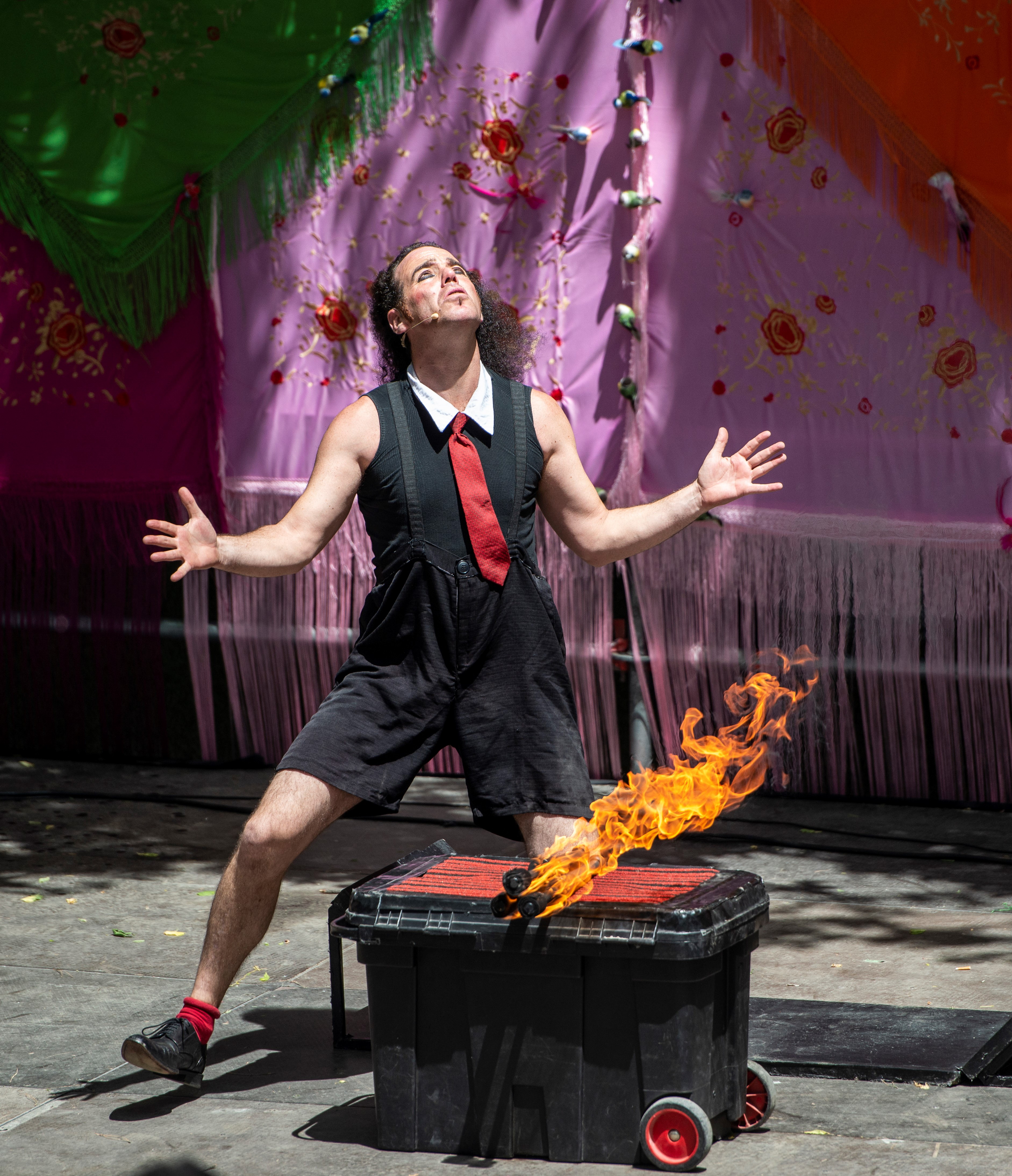Una hora y media más tarde, a las 13:30, la compañía Mundo Costrini llegaba a la Pradera de San Isidro con su habitual estilo divertido, habilidoso y con toques de locura. Ante un público atento, Niño Costrini ha ofrecido humor, circo, delirio y una gran técnica con un lugar especial para la reflexión. Un show enérgico, de idioma universal, que ha despertado el interés y la participación de todos los asistentes.