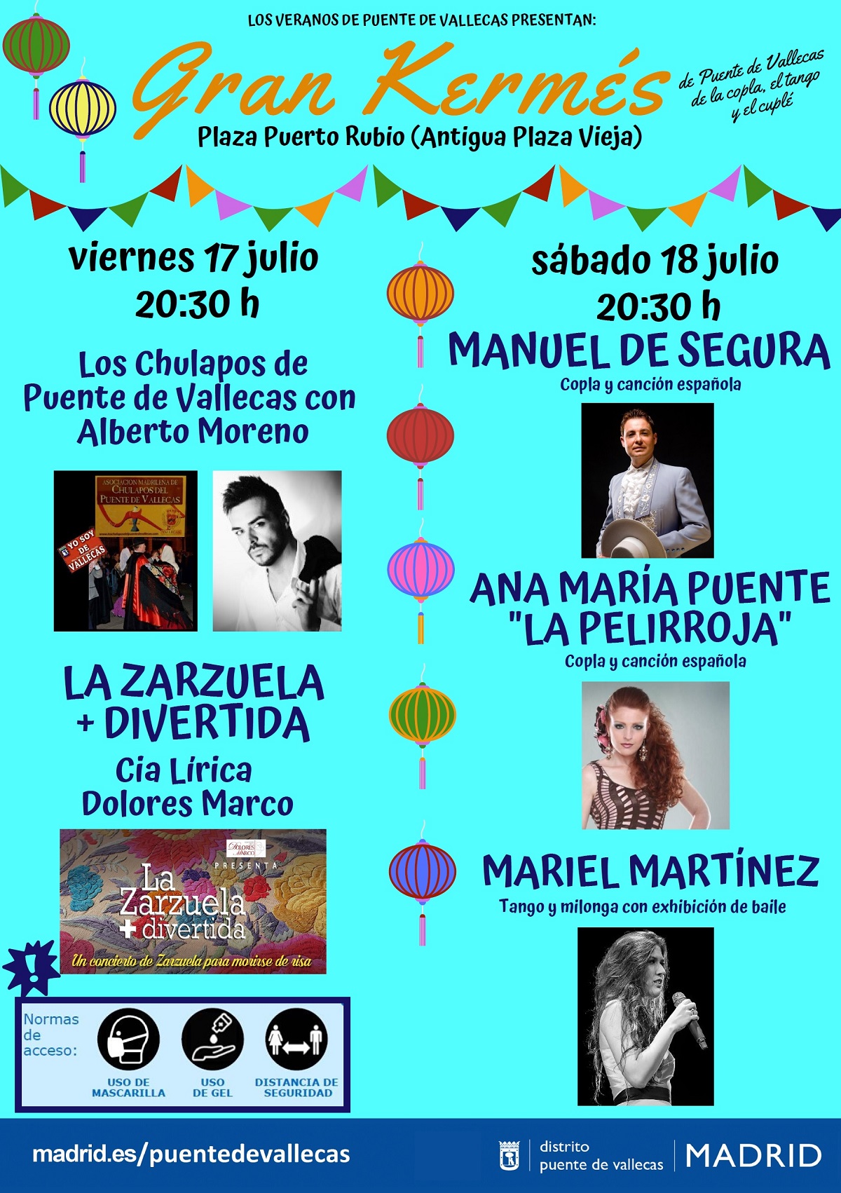 La Junta Municipal de Puente de Vallecas ha recuperado para este viernes, 17 de julio, a las 20:30 horas, la ‘Gran Kermés’ vallecana de forma renovada y con una perspectiva moderna y actualizada, una cita cultural que las personas mayores del distrito podrán rememorar en la plaza Vieja (plaza de Puerto Rubio).