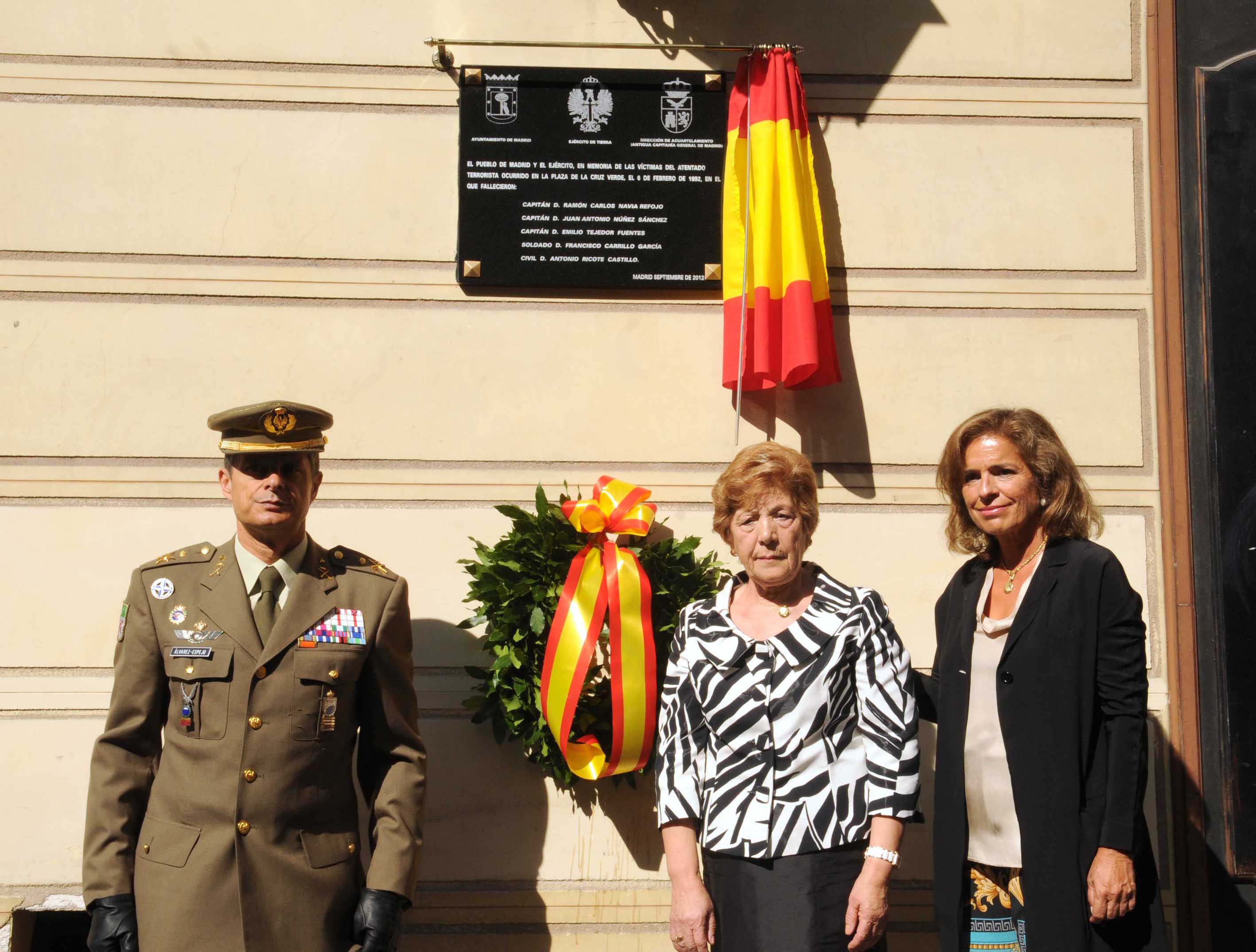 La alcaldesa de Madrid, Ana Botella, ha descubierto una placa conmemorativa en el número 1 de la plaza de la Cruz Verde en memoria de las víctimas del atentado terrorista que tuvo lugar en dicha plaza el 6 de febrero de 1992. El acto se ha celebrado esta mañana. Durante el homenaje, al que han asistido familiares de las víctimas, se ha depositado también una corona de laurel junto a la placa.