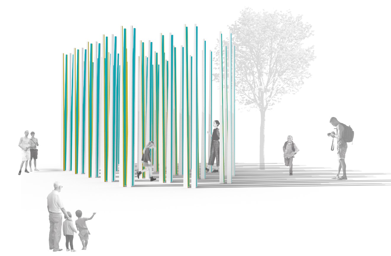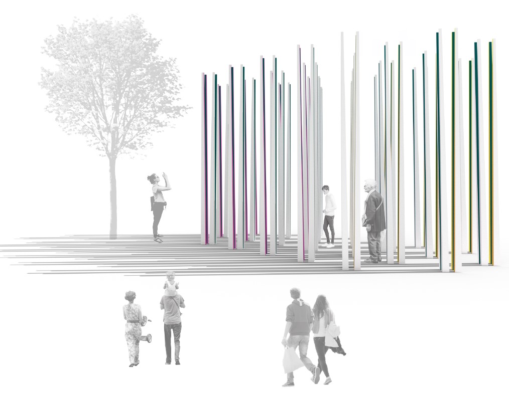 - El proyecto ganador se compone de 96 prismas verticales que materializan a través de la luz y el color los recuerdos y la relación con la memoria