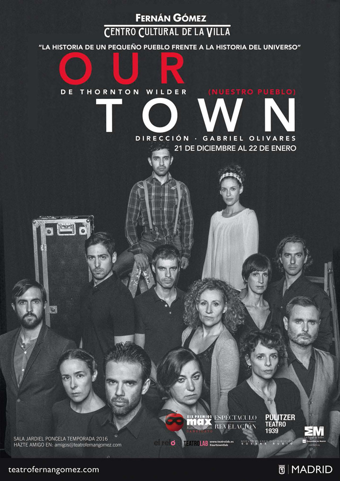 El teatro Fernán Gómez. Centro Cultural de la Villa repone Our Town, de Thornton Wilder, la obra de teatro más vista en Estados Unidos, dirigida por Gabriel Olivares. El éxito cosechado el pasado año, tanto de crítica como de público, ha hecho que se vuelva a reponer este montaje. La obra estará en cartel del 21 de diciembre hasta el 22 de enero de 2017.