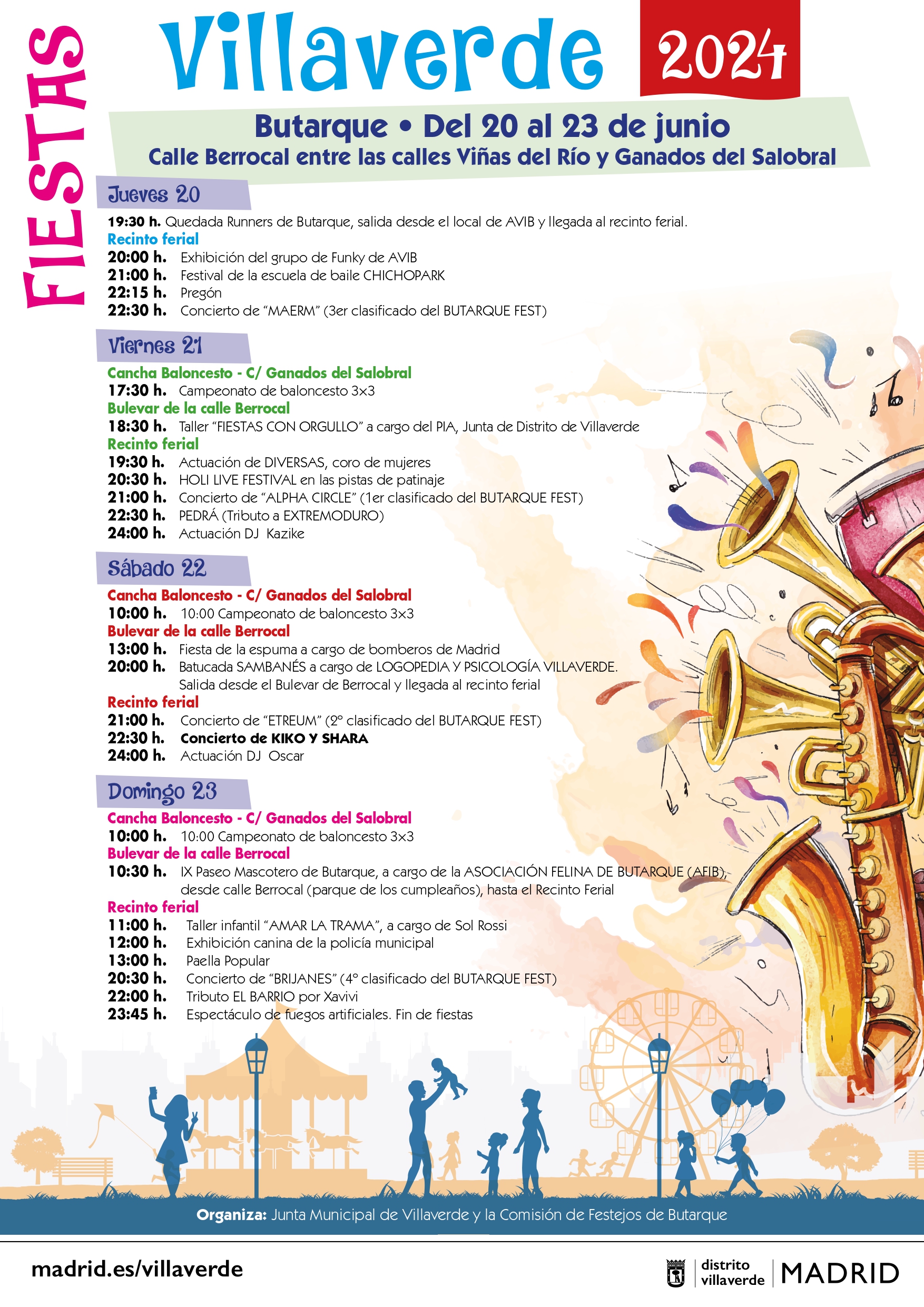 Al anochecer, desde este mismo espacio partirá una batucada hacia el recinto ferial a partir de las 20:00 h. Una vez allí, continuarán los conciertos de Etreum (segundo clasificado del Butarque Fest), Kiko y Shara, y el DJ Óscar.